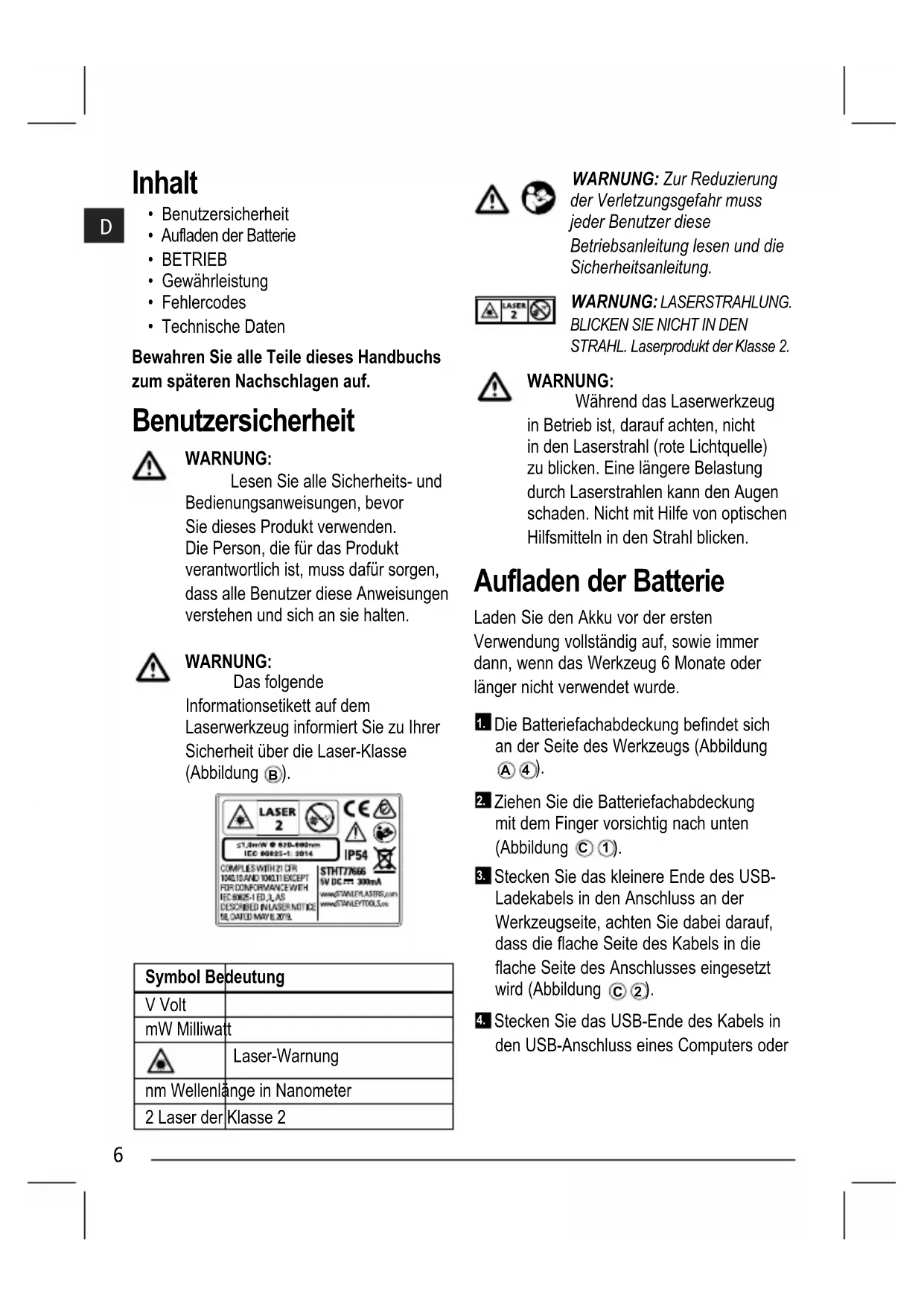 - Technische Daten Bewahren Sie alle Teile dieses Handbuchs zum späteren Nachschlagen auf. Benutzersicherheit WARNUNG: Lesen Sie alle Sicherheits- und Bedienungsanweisungen, bevor Sie dieses Produkt verwenden. Die Person, die für das Produkt verantwortlich ist, muss dafür sorgen, dass alle Benutzer diese Anweisungen verstehen und sich an sie halten. WARNUNG: Das folgende Informationsetikett auf dem Laserwerkzeug informiert Sie zu Ihrer Sicherheit über die Laser-Klasse (Abbildung
