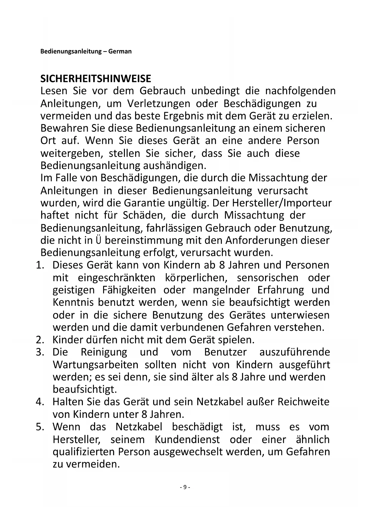 Recycling – European Directive 2012/19/EU This marking indicates that this product should not be disposed with other household wastes. To prevent possible harm to the environment or human health from uncontrolled waste disposal, recycle it responsibly to promote the sustainable reuse of material resources. To return your used device, please use the return and collection systems or contact the retailer where the product was purchased. They can take this product for environmental safe recycling. Emerio B.V. Customer service: Kundeninformation: Klantenservice: Zomervaart 1A T: +31 (0) 23 3034369 T: +49 (0) 3222 1097 600 T: +31 (0) 23 3034369 2033 DA Haarlem E: info@emerio.eu E: info.de@emerio.eu E: info.nl@emerio.eu The Netherlands- 9 - Bedienungsanleitung – German SICHERHEITSHINWEISE Lesen Sie vor dem Gebrauch unbedingt die nachfolgenden Anleitungen, um Verletzungen oder Beschädigungen zu vermeiden und das beste Ergebnis mit dem Gerät zu erzielen. Bewahren Sie diese Bedienungsanleitung an einem sicheren Ort auf. Wenn Sie dieses Gerät an eine andere Person weitergeben, stellen Sie sicher, dass Sie auch diese Bedienungsanleitung aushändigen. Im Falle von Beschädigungen, die durch die Missachtung der Anleitungen in dieser Bedienungsanleitung verursacht wurden, wird die Garantie ungültig. Der Hersteller/Importeur haftet nicht für Schäden, die durch Missachtung der Bedienungsanleitung, fahrlässigen Gebrauch oder Benutzung, die nicht in Übereinstimmung mit den Anforderungen dieser Bedienungsanleitung erfolgt, verursacht wurden.