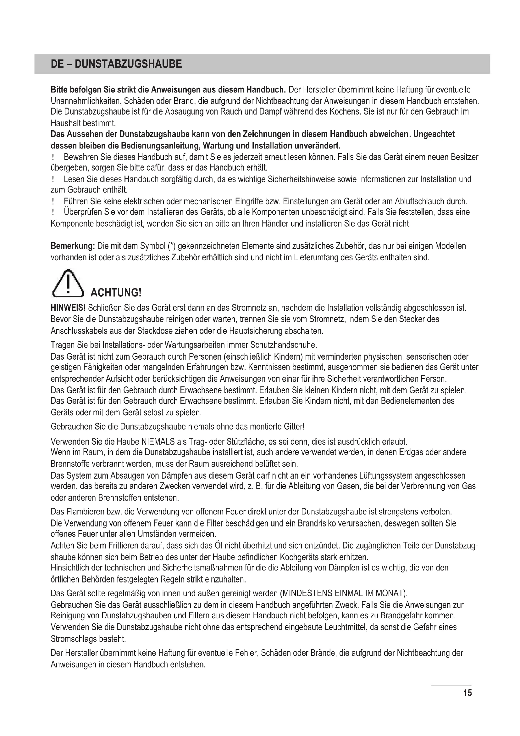 Bitte befolgen Sie strikt die Anweisungen aus diesem Handbuch. Der Hersteller übernimmt keine Haftung für eventuelle Unannehmlichkeiten, Schäden oder Brand, die aufgrund der Nichtbeachtung der Anweisungen in diesem Handbuch entstehen. Die Dunstabzugshaube ist für die Absaugung von Rauch und Dampf während des Kochens. Sie ist nur für den Gebrauch im Haushalt bestimmt. Das Aussehen der Dunstabzugshaube kann von den Zeichnungen in diesem Handbuch abweichen. Ungeachtet dessen bleiben die Bedienungsanleitung, Wartung und Installation unverändert. ! Bewahren Sie dieses Handbuch auf, damit Sie es jederzeit erneut lesen können. Falls Sie das Gerät einem neuen Besitzer übergeben, sorgen Sie bitte dafür, dass er das Handbuch erhält. ! Lesen Sie dieses Handbuch sorgfältig durch, da es wichtige Sicherheitshinweise sowie Informationen zur Installation und zum Gebrauch enthält. ! Führen Sie keine elektrischen oder mechanischen Eingriffe bzw. Einstellungen am Gerät oder am Abluftschlauch durch. ! Überprüfen Sie vor dem Installieren des Geräts, ob alle Komponenten unbeschädigt sind. Falls Sie feststellen, dass eine Komponente beschädigt ist, wenden Sie sich an bitte an Ihren Händler und installieren Sie das Gerät nicht. Bemerkung: Die mit dem Symbol (*) gekennzeichneten Elemente sind zusätzliches Zubehör, das nur bei einigen Modellen vorhanden ist oder als zusätzliches Zubehör erhältlich sind und nicht im Lieferumfang des Geräts enthalten sind. ACHTUNG! HINWEIS! Schließen Sie das Gerät erst dann an das Stromnetz an, nachdem die Installation vollständig abgeschlossen ist. Bevor Sie die Dunstabzugshaube reinigen oder warten, trennen Sie sie vom Stromnetz, indem Sie den Stecker des Anschlusskabels aus der Steckdose ziehen oder die Hauptsicherung abschalten. Tragen Sie bei Installations- oder Wartungsarbeiten immer Schutzhandschuhe. Das Gerät ist nicht zum Gebrauch durch Personen (einschließlich Kindern) mit verminderten physischen, sensorischen oder geistigen Fähigkeiten oder mangelnden Erfahrungen bzw. Kenntnissen bestimmt, ausgenommen sie bedienen das Gerät unter entsprechender Aufsicht oder berücksichtigen die Anweisungen von einer für ihre Sicherheit verantwortlichen Person. Das Gerät ist für den Gebrauch durch Erwachsene bestimmt. Erlauben Sie kleinen Kindern nicht, mit dem Gerät zu spielen. Das Gerät ist für den Gebrauch durch Erwachsene bestimmt. Erlauben Sie Kindern nicht, mit den Bedienelementen des Geräts oder mit dem Gerät selbst zu spielen. Gebrauchen Sie die Dunstabzugshaube niemals ohne das montierte Gitter! Verwenden Sie die Haube NIEMALS als Trag- oder Stützfläche, es sei denn, dies ist ausdrücklich erlaubt. Wenn im Raum, in dem die Dunstabzugshaube installiert ist, auch andere verwendet werden, in denen Erdgas oder andere Brennstoffe verbrannt werden, muss der Raum ausreichend belüftet sein. Das System zum Absaugen von Dämpfen aus diesem Gerät darf nicht an ein vorhandenes Lüftungssystem angeschlossen werden, das bereits zu anderen Zwecken verwendet wird, z. B. für die Ableitung von Gasen, die bei der Verbrennung von Gas oder anderen Brennstoffen entstehen. Das Flambieren bzw. die Verwendung von offenem Feuer direkt unter der Dunstabzugshaube ist strengstens verboten. Die Verwendung von offenem Feuer kann die Filter beschädigen und ein Brandrisiko verursachen, deswegen sollten Sie offenes Feuer unter allen Umständen vermeiden. Achten Sie beim Frittieren darauf, dass sich das Öl nicht überhitzt und sich entzündet. Die zugänglichen Teile der Dunstabzug- shaube können sich beim Betrieb des unter der Haube befindlichen Kochgeräts stark erhitzen. Hinsichtlich der technischen und Sicherheitsmaßnahmen für die die Ableitung von Dämpfen ist es wichtig, die von den örtlichen Behörden festgelegten Regeln strikt einzuhalten. Das Gerät sollte regelmäßig von innen und außen gereinigt werden (MINDESTENS EINMAL IM MONAT). Gebrauchen Sie das Gerät ausschließlich zu dem in diesem Handbuch angeführten Zweck. Falls Sie die Anweisungen zur Reinigung von Dunstabzugshauben und Filtern aus diesem Handbuch nicht befolgen, kann es zu Brandgefahr kommen. Verwenden Sie die Dunstabzugshaube nicht ohne das entsprechend eingebaute Leuchtmittel, da sonst die Gefahr eines Stromschlags besteht. Der Hersteller übernimmt keine Haftung für eventuelle Fehler, Schäden oder Brände, die aufgrund der Nichtbeachtung der Anweisungen in diesem Handbuch entstehen. 15Das Gerät ist in Einklang mit der europäischen Richtlinie 2002/96/EG über die Entsorgung von Elektrik- und Elektronikalt- geräten gekennzeichnet. Durch vorschriftsmäßige Entsorgung des Geräts tragen Sie zur Vermeidung von eventuellen schädlichen Einflüssen auf die Umwelt und Gesundheit der Menschen bei, die bei einer unvorschriftsmäßigen Entsorgung des ausgedienten Geräts entstehen würden. Das Symbol auf dem Produkt oder in der Begleitdokumentation weist darauf hin, dass das Gerät nicht als normaler Haushaltsabfall zu behandeln ist, sondern an einer geeigneten Sammelstelle für das Recycling von Elektro- und Elektronikaltgeräten abgegeben werden muss. Entsorgen Sie das Gerät gemäß den örtlichen Umweltschutzbestimmungen für die Entsorgung von Abfällen. Wenden Sie sich für weitere detaillierte Informationen zum Umbau, Sammeln und zur Wiederverwertung dieses Produkts an die zuständige Abteilung Ihrer örtlichen Behörden, an den örtlichen Entsorgungsdienst oder an den Händler, bei dem Sie dieses Produkt gekauft haben. Das Gerät wurde gemäß folgenden Normen bzw. Vorschriften entwickelt, getestet und hergestellt.