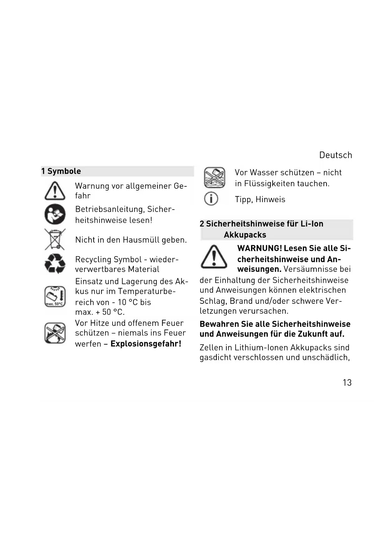 Umgang mit dem Akkupack Der Akkupack wird teilgeladen ausgeliefert. Um die volle Leis tung des Akkupacks zu gewähr leisten, vor dem ersten Einsatz den Akkupack vollständig im La degerät aufladen. Deutsch 18Der Akkupack kann jederzeit aufgela den werden, ohne die Lebensdauer zu verkürzen. Eine Unterbrechung des La devorganges schädigt den Akkupack nicht. Nach dem automatischen Abschalten des Elektro werkzeugs nicht weiter auf den Ein-/Ausschalter drücken. Der Ak kupack kann beschädigt werden. Der Akkupack ist mit einer Temperatur überwachung ausgestattet, welche ein Aufladen nur im Temperaturbereich zwischen 0 °C und 55 °C zulässt. Da durch wird eine hohe Akku-Lebensdau er erreicht. – Akkupack möglichst kühl (5 °C bis 25 °C) und trocken (Luftfeuchte < 80%) lagern. – Akkupack z.B. im Sommer nicht im Auto liegen lassen. – Eine wesentlich verkürzte Betriebs zeit nach der Aufladung zeigt an, dass der Akkupack verbraucht ist und er setzt werden muss. – Hinweise zur Entsorgung beachten.