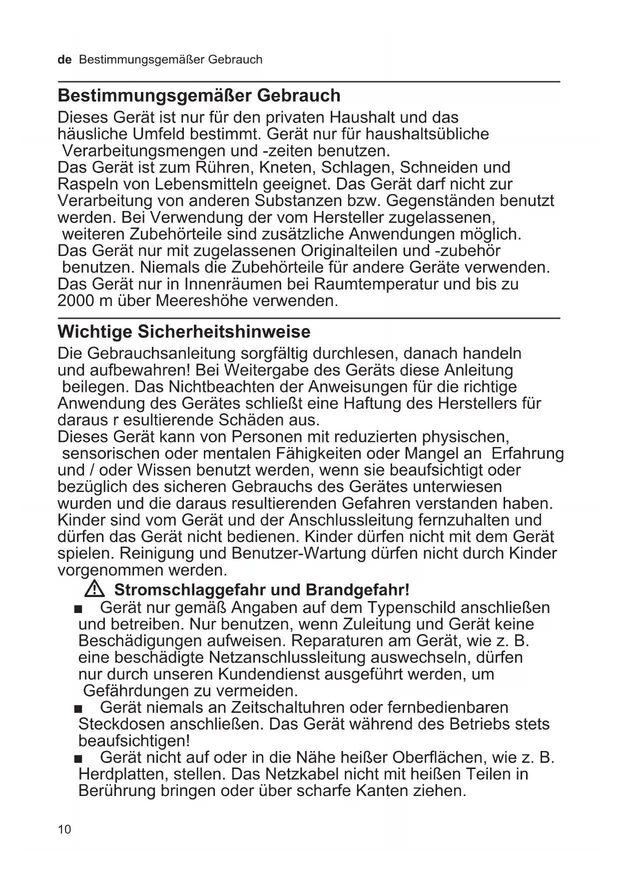 max O10 de Bestimmungsgemäßer Gebrauch Bestimmungsgemäßer Gebrauch Dieses Gerät ist nur für den privaten Haushalt und das häusliche Umfeld bestimmt. Gerät nur für haushaltsübliche Verarbeitungsmengen und -zeiten benutzen. Das Gerät ist zum Rühren, Kneten, Schlagen, Schneiden und Raspeln von Lebensmitteln geeignet. Das Gerät darf nicht zur Verarbeitung von anderen Substanzen bzw. Gegenständen benutzt werden. Bei Verwendung der vom Hersteller zugelassenen, weiteren Zubehörteile sind zusätzliche Anwendungen möglich. Das Gerät nur mit zugelassenen Originalteilen und -zubehör benutzen. Niemals die Zubehörteile für andere Geräte verwenden. Das Gerät nur in Innenräumen bei Raumtemperatur und bis zu 2000 m über Meereshöhe verwenden. Wichtige Sicherheitshinweise Die Gebrauchsanleitung sorgfältig durchlesen, danach handeln und aufbewahren! Bei Weitergabe des Geräts diese Anleitung beilegen. Das Nichtbeachten der Anweisungen für die richtige Anwendung des Gerätes schließt eine Haftung des Herstellers für daraus r esultierende Schäden aus. Dieses Gerät kann von Personen mit reduzierten physischen, sensorischen oder mentalen Fähigkeiten oder Mangel an Erfahrung und / oder Wissen benutzt werden, wenn sie beaufsichtigt oder bezüglich des sicheren Gebrauchs des Gerätes unterwiesen wurden und die daraus resultierenden Gefahren verstanden haben. Kinder sind vom Gerät und der Anschlussleitung fernzuhalten und dürfen das Gerät nicht bedienen. Kinder dürfen nicht mit dem Gerät spielen. Reinigung und Benutzer-Wartung dürfen nicht durch Kinder vorgenommen werden. W Stromschlaggefahr und Brandgefahr! ■ Gerät nur gemäß Angaben auf dem Typenschild anschließen und betreiben. Nur benutzen, wenn Zuleitung und Gerät keine Beschädigungen aufweisen. Reparaturen am Gerät, wie z. B. eine beschädigte Netzanschlussleitung auswechseln, dürfen nur durch unseren Kundendienst ausgeführt werden, um Gefährdungen zu vermeiden. ■ Gerät niemals an Zeitschaltuhren oder fernbedienbaren Steckdosen anschließen. Das Gerät während des Betriebs stets beaufsichtigen! ■ Gerät nicht auf oder in die Nähe heißer Oberflächen, wie z. B. Herdplatten, stellen. Das Netzkabel nicht mit heißen Teilen in Berührung bringen oder über scharfe Kanten ziehen.11