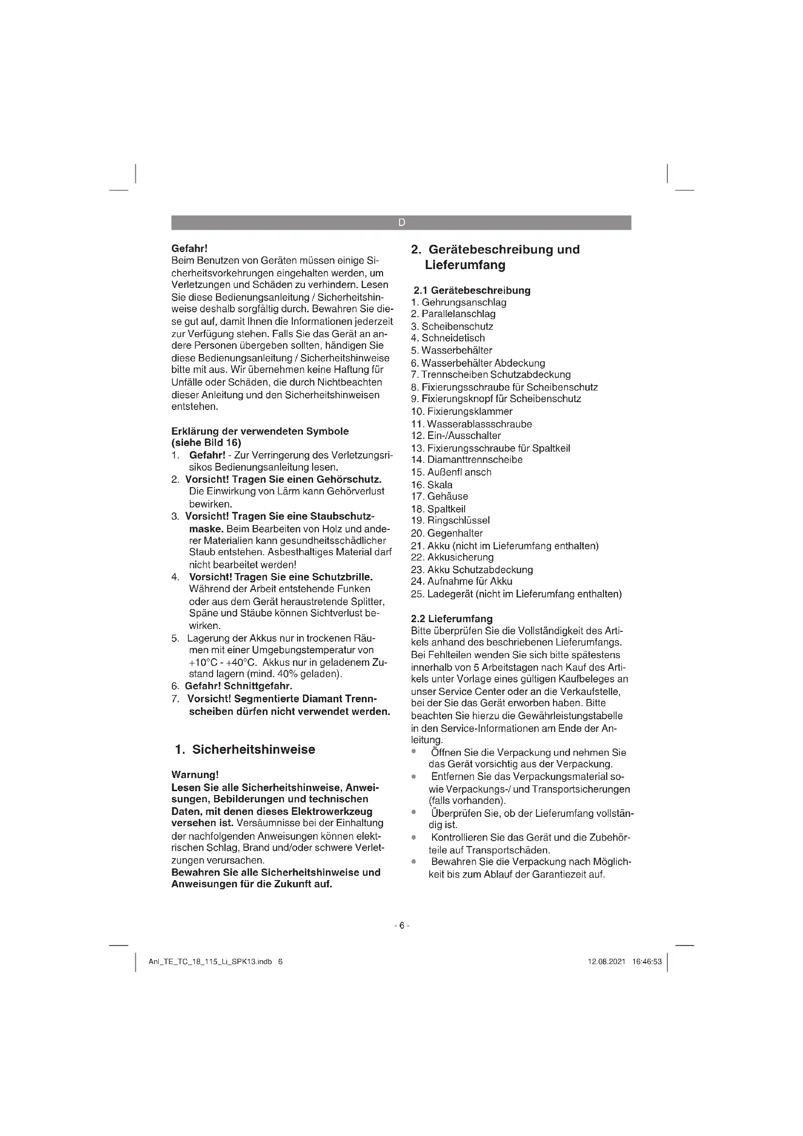 Vor dem Gebrauch der Maschine überprüfen, dass alle Teile unbeschädigt sind; andernfalls diese ersetzen. Beim Ersatz von Teilen oder Zubehör aufmerksam die Anleitung aus die- Anl_TE_TC_18_115_Li_SPK13.indb 8Anl_TE_TC_18_115_Li_SPK13.indb 8 12.08.2021 16:46:5412.08.2021 16:46:54D