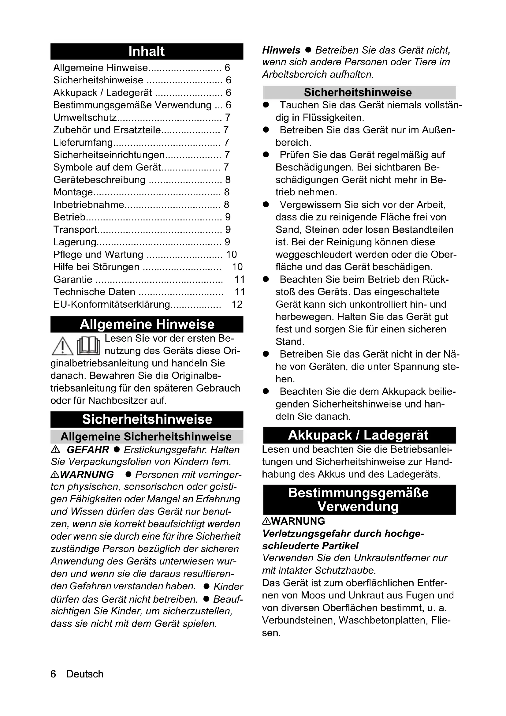 • Hinweis ● Betreiben Sie das Gerät nicht, wenn sich andere Personen oder Tiere im Arbeitsbereich aufhalten. Sicherheitshinweise Tauchen Sie das Gerät niemals vollstän- dig in Flüssigkeiten. Betreiben Sie das Gerät nur im Außen- bereich. Prüfen Sie das Gerät regelmäßig auf Beschädigungen. Bei sichtbaren Be- schädigungen Gerät nicht mehr in Be- trieb nehmen. Vergewissern Sie sich vor der Arbeit, dass die zu reinigende Fläche frei von Sand, Steinen oder losen Bestandteilen ist. Bei der Reinigung können diese weggeschleudert werden oder die Ober- fläche und das Gerät beschädigen. Beachten Sie beim Betrieb den Rück- stoß des Geräts. Das eingeschaltete Gerät kann sich unkontrolliert hin- und herbewegen. Halten Sie das Gerät gut fest und sorgen Sie für einen sicheren Stand. Betreiben Sie das Gerät nicht in der Nä- he von Geräten, die unter Spannung ste- hen. Beachten Sie die dem Akkupack beilie- genden Sicherheitshinweise und han- deln Sie danach. Akkupack / Ladegerät Lesen und beachten Sie die Betriebsanlei- tungen und Sicherheitshinweise zur Hand- habung des Akkus und des Ladegeräts. Bestimmungsgemäße Verwendung 몇 WARNUNG Verletzungsgefahr durch hochge- schleuderte Partikel Verwenden Sie den Unkrautentferner nur mit intakter Schutzhaube. Das Gerät ist zum oberflächlichen Entfer- nen von Moos und Unkraut aus Fugen und von diversen Oberflächen bestimmt, u. a. Verbundsteinen, Waschbetonplatten, Flie- sen. Allgemeine Hinweise p. 6