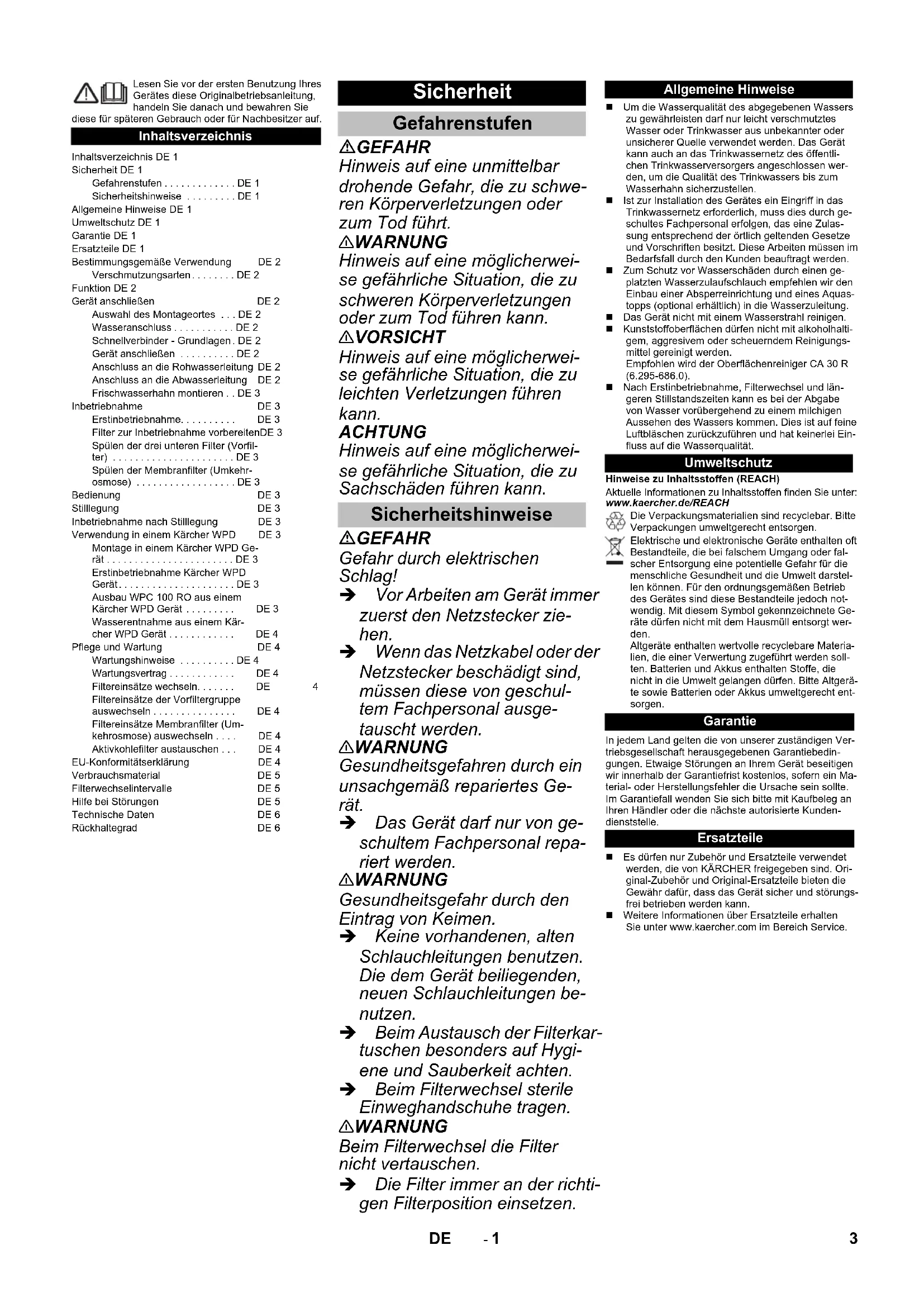 59671920 10/18 Deutsch 3 English 9 Français 15 Italiano 21 Nederlands 27 Español 33 Português 39 Dansk 45 Norsk 51 Svenska 57 Suomi 63 Ελληνικά 69 Türkçe 75 Русский 81 Magyar 87 Čeština 93 Slovenščina 99 Polski 105 Româneşte 111 Slovenčina 117 Hrvatski 123 Srpski 129 Български 135 Eesti 141 Latviešu 147 Lietuviškai 153 Українська 159 中文 1652- 1 Lesen Sie vor der ersten Benutzung Ihres Gerätes diese Originalbetriebsanleitung, handeln Sie danach und bewahren Sie diese für späteren Gebrauch oder für Nachbesitzer auf. GEFAHR Hinweis auf eine unmittelbar drohende Gefahr, die zu schwe- ren Körperverletzungen oder zum Tod führt. 몇 WARNUNG Hinweis auf eine möglicherwei- se gefährliche Situation, die zu schweren Körperverletzungen oder zum Tod führen kann. 몇 VORSICHT Hinweis auf eine möglicherwei- se gefährliche Situation, die zu leichten Verletzungen führen kann. ACHTUNG Hinweis auf eine möglicherwei- se gefährliche Situation, die zu Sachschäden führen kann. GEFAHR Gefahr durch elektrischen Schlag! Vor Arbeiten am Gerät immer zuerst den Netzstecker zie- hen. Wenn das Netzkabel oder der Netzstecker beschädigt sind, müssen diese von geschul- tem Fachpersonal ausge- tauscht werden. 몇 WARNUNG Gesundheitsgefahren durch ein unsachgemäß repariertes Ge- rät. Das Gerät darf nur von ge- schultem Fachpersonal repa- riert werden. 몇 WARNUNG Gesundheitsgefahr durch den Eintrag von Keimen. Keine vorhandenen, alten Schlauchleitungen benutzen. Die dem Gerät beiliegenden, neuen Schlauchleitungen be- nutzen. Beim Austausch der Filterkar- tuschen besonders auf Hygi- ene und Sauberkeit achten. Beim Filterwechsel sterile Einweghandschuhe tragen. 몇 WARNUNG Beim Filterwechsel die Filter nicht vertauschen. Die Filter immer an der richti- gen Filterposition einsetzen. Um die Wasserqualität des abgegebenen Wassers zu gewährleisten darf nur leicht verschmutztes Wasser oder Trinkwasser aus unbekannter oder unsicherer Quelle verwendet werden. Das Gerät kann auch an das Trinkwassernetz des öffentli-chen Trinkwasserversorgers angeschlossen wer-den, um die Qualität des Trinkwassers bis zum Wasserhahn sicherzustellen. Ist zur Installation des Gerätes ein Eingriff in das Trinkwassernetz erforderlich, muss dies durch ge-schultes Fachpersonal erfolgen, das eine Zulas-sung entsprechend der örtlich geltenden Gesetze und Vorschriften besitzt. Diese Arbeiten müssen imBedarfsfall durch den Kunden beauftragt werden. Zum Schutz vor Wasserschäden durch einen ge-platzten Wasserzulaufschlauch empfehlen wir den Einbau einer Absperreinrichtung und eines Aquas-topps (optional erhältlich) in die Wasserzuleitung. Das Gerät nicht mit einem Wasserstrahl reinigen. Kunststoffoberflächen dürfen nicht mit alkoholhalti-gem, aggresivem oder scheuerndem Reinigungs-mittel gereinigt werden.Empfohlen wird der Oberflächenreiniger CA 30 R (6.295-686.0). Nach Erstinbetriebnahme, Filterwechsel und län-geren Stillstandszeiten kann es bei der Abgabe von Wasser vorübergehend zu einem milchigen Aussehen des Wassers kommen. Dies ist auf feine Luftbläschen zurückzuführen und hat keinerlei Ein-fluss auf die Wasserqualität.Hinweise zu Inhaltsstoffen (REACH)Aktuelle Informationen zu Inhaltsstoffen finden Sie unter: www.kaercher.de/REACHIn jedem Land gelten die von unserer zuständigen Ver-triebsgesellschaft herausgegebenen Garantiebedin-gungen. Etwaige Störungen an Ihrem Gerät beseitigen wir innerhalb der Garantiefrist kostenlos, sofern ein Ma-terial- oder Herstellungsfehler die Ursache sein sollte. Im Garantiefall wenden Sie sich bitte mit Kaufbeleg an Ihren Händler oder die nächste autorisierte Kunden-dienststelle. Es dürfen nur Zubehör und Ersatzteile verwendet werden, die von KÄRCHER freigegeben sind. Ori-ginal-Zubehör und Original-Ersatzteile bieten die Gewähr dafür, dass das Gerät sicher und störungs-frei betrieben werden kann. Weitere Informationen über Ersatzteile erhalten Sie unter www.kaercher.com im Bereich Service.InhaltsverzeichnisInhaltsverzeichnis DE 1Sicherheit DE 1Gefahrenstufen . . . . . . . . . . . . . DE 1Sicherheitshinweise . . . . . . . . . DE 1Allgemeine Hinweise DE 1Umweltschutz DE 1Garantie DE 1Ersatzteile DE 1Bestimmungsgemäße Verwendung DE 2Verschmutzungsarten. . . . . . . . DE 2Funktion DE 2Gerät anschließen DE 2Auswahl des Montageortes . . . DE 2Wasseranschluss . . . . . . . . . . . DE 2Schnellverbinder - Grundlagen . DE 2Gerät anschließen . . . . . . . . . . DE 2Anschluss an die Rohwasserleitung DE 2Anschluss an die Abwasserleitung DE 2Frischwasserhahn montieren . . DE 3Inbetriebnahme DE 3Erstinbetriebnahme. . . . . . . . . . DE 3Filter zur Inbetriebnahme vorbereitenDE 3Spülen der drei unteren Filter (Vorfil-ter) . . . . . . . . . . . . . . . . . . . . . . DE 3Spülen der Membranfilter (Umkehr-osmose) . . . . . . . . . . . . . . . . . . DE 3Bedienung DE 3Stilllegung DE 3Inbetriebnahme nach Stilllegung DE 3Verwendung in einem Kärcher WPD DE 3Montage in einem Kärcher WPD Ge-rät . . . . . . . . . . . . . . . . . . . . . . . DE 3Erstinbetriebnahme Kärcher WPD Gerät. . . . . . . . . . . . . . . . . . . . . DE 3Ausbau WPC 100 RO aus einem Kärcher WPD Gerät . . . . . . . . . DE 3Wasserentnahme aus einem Kär-cher WPD Gerät . . . . . . . . . . . . DE 4Pflege und Wartung DE 4Wartungshinweise . . . . . . . . . . DE 4Wartungsvertrag . . . . . . . . . . . . DE 4Filtereinsätze wechseln. . . . . . . DE 4Filtereinsätze der Vorfiltergruppe auswechseln . . . . . . . . . . . . . . . DE 4Filtereinsätze Membranfilter (Um-kehrosmose) auswechseln . . . . DE 4Aktivkohlefilter austauschen . . . DE 4EU-Konformitätserklärung DE 4Verbrauchsmaterial DE 5Filterwechselintervalle DE 5Hilfe bei Störungen DE 5Technische Daten DE 6Rückhaltegrad DE 6 Sicherheit Gefahrenstufen Sicherheitshinweise Allgemeine HinweiseUmweltschutzDie Verpackungsmaterialien sind recyclebar. Bitte Verpackungen umweltgerecht entsorgen.Elektrische und elektroni
