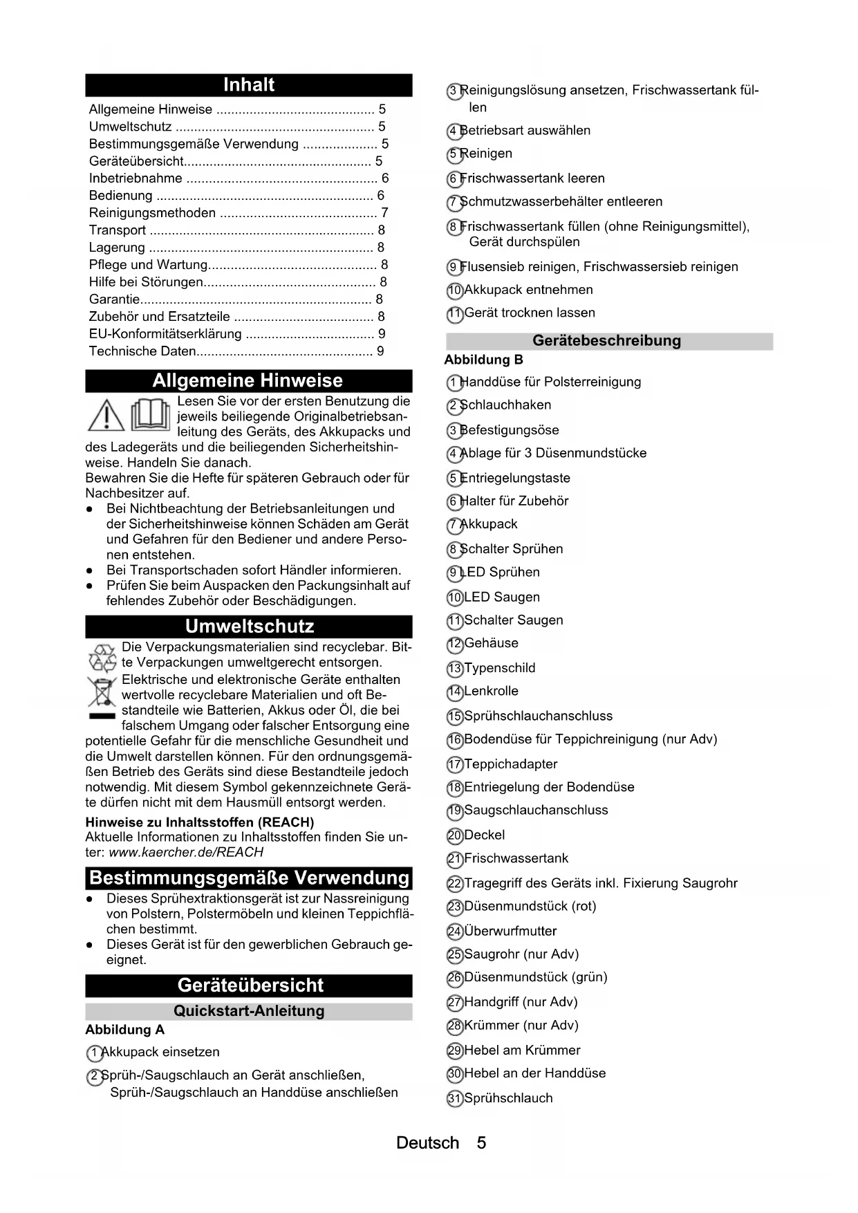 - BC DDeutsch 5 Inhalt Allgemeine Hinweise Lesen Sie vor der ersten Benutzung die jeweils beiliegende Originalbetriebsan- leitung des Geräts, des Akkupacks und des Ladegeräts und die beiliegenden Sicherheitshin- weise. Handeln Sie danach. Bewahren Sie die Hefte für späteren Gebrauch oder für Nachbesitzer auf. ● Bei Nichtbeachtung der Betriebsanleitungen und der Sicherheitshinweise können Schäden am Gerät und Gefahren für den Bediener und andere Perso- nen entstehen. ● Bei Transportschaden sofort Händler informieren. ● Prüfen Sie beim Auspacken den Packungsinhalt auf fehlendes Zubehör oder Beschädigungen. Umweltschutz Die Verpackungsmaterialien sind recyclebar. Bit- te Verpackungen umweltgerecht entsorgen. Elektrische und elektronische Geräte enthalten wertvolle recyclebare Materialien und oft Be- standteile wie Batterien, Akkus oder Öl, die bei falschem Umgang oder falscher Entsorgung eine potentielle Gefahr für die menschliche Gesundheit und die Umwelt darstellen können. Für den ordnungsgemä- ßen Betrieb des Geräts sind diese Bestandteile jedoch notwendig. Mit diesem Symbol gekennzeichnete Gerä- te dürfen nicht mit dem Hausmüll entsorgt werden. Hinweise zu Inhaltsstoffen (REACH) Aktuelle Informationen zu Inhaltsstoffen finden Sie un- ter: www.kaercher.de/REACH Bestimmungsgemäße Verwendung ● Dieses Sprühextraktionsgerät ist zur Nassreinigung von Polstern, Polstermöbeln und kleinen Teppichflä- chen bestimmt. ● Dieses Gerät ist für den gewerblichen Gebrauch ge- eignet. Geräteübersicht Quickstart-Anleitung Abbildung A 1 Akkupack einsetzen 2 Sprüh-/Saugschlauch an Gerät anschließen, Sprüh-/Saugschlauch an Handdüse anschließen 3 Reinigungslösung ansetzen, Frischwassertank fül- len 4 Betriebsart auswählen 5 Reinigen 6 Frischwassertank leeren 7 Schmutzwasserbehälter entleeren 8 Frischwassertank füllen (ohne Reinigungsmittel), Gerät durchspülen 9 Flusensieb reinigen, Frischwassersieb reinigen 10 Akkupack entnehmen 11 Gerät trocknen lassen Gerätebeschreibung Abbildung B 1 Handdüse für Polsterreinigung 2 Schlauchhaken 3 Befestigungsöse 4 Ablage für 3 Düsenmundstücke 5 Entriegelungstaste 6 Halter für Zubehör 7 Akkupack 8 Schalter Sprühen 9 LED Sprühen 10 LED Saugen 11 Schalter Saugen 12 Gehäuse 13 Typenschild 14 Lenkrolle 15 Sprühschlauchanschluss 16 Bodendüse für Teppichreinigung (nur Adv) 17 Teppichadapter 18 Entriegelung der Bodendüse 19 Saugschlauchanschluss 20 Deckel 21 Frischwassertank 22 Tragegriff des Geräts inkl. Fixierung Saugrohr 23 Düsenmundstück (rot) 24 Überwurfmutter 25 Saugrohr (nur Adv) 26 Düsenmundstück (grün) 27 Handgriff (nur Adv) 28 Krümmer (nur Adv) 29 Hebel am Krümmer 30 Hebel an der Handdüse 31 Sprühschlauch Allgemeine Hinweise p. 5