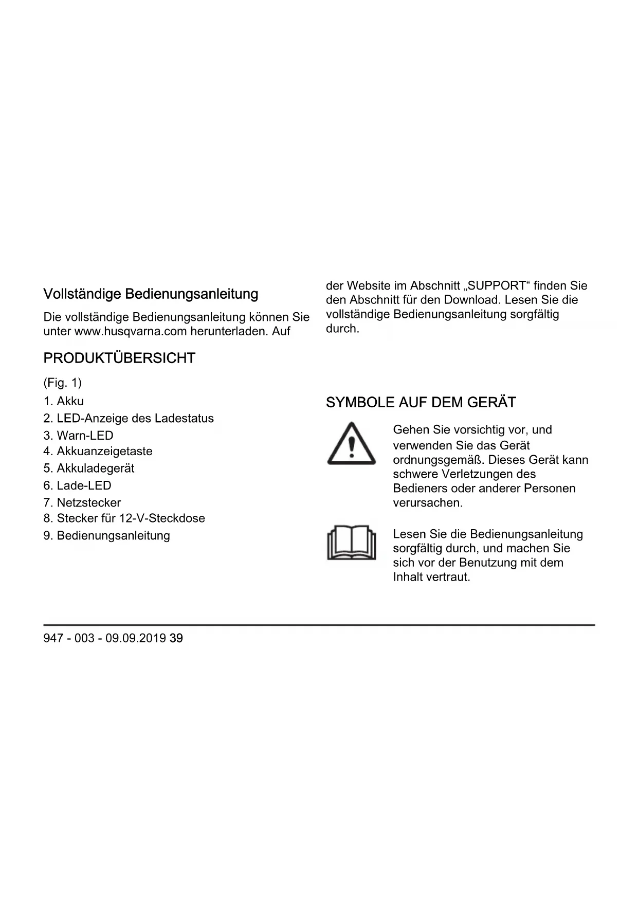 - Tal med din lokale Husqvarna-forhandler for yderligere oplysninger om, hvordan du genbruger og kasserer produktet. TEKNISKE DATA For tekniske data, se typeskiltet på batteriopladeren. 38 947 - 003 - 09.09.2019Vollständige Bedienungsanleitung Die vollständige Bedienungsanleitung können Sie unter www.husqvarna.com herunterladen. Auf der Website im Abschnitt „SUPPORT“ finden Sie den Abschnitt für den Download. Lesen Sie die vollständige Bedienungsanleitung sorgfältig durch. PRODUKTÜBERSICHT (Fig. 1)