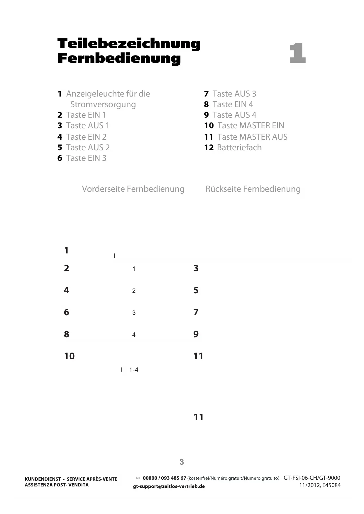 00800 / 093 485 67 (kostenfrei/Numéro gratuit/Numero gratuito) gt-support@zeitlos-vertrieb.deKUNDENDIENST • SERVICE APRÈS-VENTE ASSISTENZA POST- VENDITAGT-FSI-06-CH/GT-900011/2012, E45084 Herzlichen Dank für Ihr Vertrauen! Wir gratulieren Ihnen zu Ihrem neuen Funksteckdosen-Set und sind überzeugt, dass Sie mit diesem modernen Gerät zufrieden sein werden. Um alle Möglichkeiten Ihres Funksteckdosen-Sets kennen zu lernen und eine stets optimale Funktion und Leistungsbereitschaft sicher zu stellen, bitten wir Sie, vor der ersten Inbetriebnahme die Gebrauchsanweisung zu lesen und die darin enthaltenen Anweisungen zu befolgen. Somit ist sicher gestellt, dass Sie lange Freude an diesen Geräten haben werden. Teilebezeichnung Funksteckdose