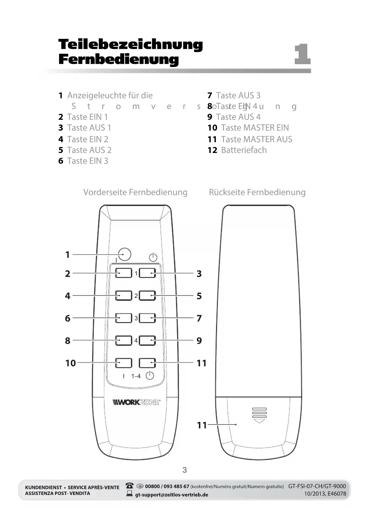 00800 / 093 485 67 (kostenfrei/Numéro gratuit/Numero gratuito)gt-support@zeitlos-vertrieb.deKUNDENDIENST • SERVICE APRÈS-VENTE ASSISTENZA POST- VENDITAGT-FSI-07-CH/GT-900010/2013, E46078 Herzlichen Dank für Ihr Vertrauen! Wir gratulieren Ihnen zu Ihrem neuen Funksteckdosen-Set und sind überzeugt, dass Sie mit diesem modernen Gerät zufrieden sein werden. Um alle Möglichkeiten Ihres Funksteckdosen-Sets kennen zu lernen und eine stets optimale Funktion und Leistungsbereitschaft sicher zu stellen, bitten wir Sie, vor der ersten Inbetriebnahme die Gebrauchsanweisung zu lesen und die darin enthaltenen Anweisungen zu befolgen. Somit ist sicher gestellt, dass Sie lange Freude an diesen Geräten haben werden. Te il eb ez ei ch nu ng Funksteckdose