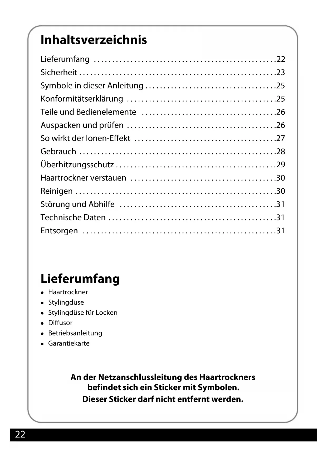 - Entsorgen An der Netzanschlussleitung des Haartrockners befindet sich ein Sticker mit Symbolen. Dieser Sticker darf nicht entfernt werden. Lieferumfang Haartrockner Stylingdüse Stylingdüse für Locken Diffusor Betriebsanleitung Garantiekarte Profi Haartrockner BEL Druckbuch.book Seite 22 Montag, 16. August 2021 3:25 1523 Sicherheit Anleitung lesen und aufbewahren Lesen Sie die folgenden Hinweise aufmerksam durch und bewahren Sie diese Betriebsanleitung auf, falls Sie später etwas nachlesen möchten. Wenn Sie den Artikel an jemand anderen weitergeben, geben Sie auch diese Betriebsanleitung mit. Wichtige Anweisungen Dieses Gerät kann von Kin- dern ab 8 Jahren sowie von Personen mit reduzierten physischen, sensorischen oder mentalen Fähigkeiten oder Mangel an Erfahrung und/oder Wissen benutzt werden, wenn sie beauf- sichtigt werden oder be- züglich des sicheren Ge- brauches des Gerätes un- terwiesen wurden und die daraus resultierenden Ge- fahren verstanden haben. Kinder dürfen nicht mit dem Gerät spielen. Reini- gung und Benutzerwar- tung dürfen nicht durch Kinder durchgeführt werden, es sei denn, sie sind beaufsichtigt. Halten Sie Kinder jünger als acht Jahre vom Gerät und der Netzanschlussleitung fern. Wenn der Haartrockner in einem Badezimmer ver- wendet wird, ist nach Ge- brauch der Netzstecker zu ziehen, da die Nähe von Wasser eine Gefahr dar- stellt, auch wenn der Haar- trockner ausgeschaltet ist. Als zusätzlicher Schutz wird die Installation einer Feh- lerstrom-Schutzeinrich- tung (FI/RCD) mit einem Bemessungsauslösestrom von nicht mehr als 30 mA im Badezimmer-Strom- kreis empfohlen. Fragen Sie Ihren Installateur um Rat. WARNUNG: Dieses Gerät nicht in der Nähe von Badewannen, Dusch- wannen oder anderen Gefäßen benutzen, die Wasser enthalten. Wenn die Netzanschlusslei- tung dieses Gerätes be- schädigt wird, muss sie durch den Hersteller oder seinen Kundendienst oder eine ähnlich qualifizierte Person ersetzt werden, um Gefährdungen zu vermei- den. Profi Haartrockner BEL Druckbuch.book Seite 23 Montag, 16. August 2021 3:25 1524 Bestimmungsgemäßer Gebrauch Dieser Haartrockner dient zum Trocknen und Frisieren von menschlichem Naturhaar. Kunsthaar darf mit dem Haartrockner nicht behandelt werden. Der Haartrockner ist für den Privatgebrauch konzipiert. Für die gewerbliche Nutzung, z. B. in Frisiersalons oder Schönheitsstudios, ist er nicht geeignet. Gefahr für Kinder und erweiterten Personenkreis Halten Sie Kinder von Verpackungsmaterial fern. Bei Verschlucken besteht Erstickungsgefahr. Achten Sie auch darauf, dass der Verpackungsbeutel nicht über den Kopf gestülpt wird. Gefahr durch Elektrizität Der Haartrockner darf nicht in Wasser oder andere Flüssigkeiten getaucht werden oder damit in Berührung kommen. Stromschlaggefahr! Benutzen Sie das Gerät daher auch nicht in der Nähe von Feuchtquellen oder im Freien. Bedienen Sie den Haartrockner nicht mit nassen Händen. Schließen Sie das Gerät an eine ordnungsgemäß installierte Steckdose an, deren Spannung den „Technischen Daten“ entspricht. Achten Sie darauf, dass die Steckdose gut zugänglich ist, damit Sie im Bedarfsfall den Netzstecker schnell aus der Steckdose ziehen können. Benutzen Sie das Gerät nicht: – wenn Gerät, Netzkabel oder Netzstecker beschädigt sind, – wenn das Gerät heruntergefallen ist. Achten Sie darauf, dass das Netzkabel nicht durch scharfe Kanten oder heiße Gegenstände beschädigt wird. Ziehen Sie den Netzstecker aus der Steckdose: – wenn Sie den Haartrockner nicht benutzen, – nach jedem Gebrauch, – bevor Sie das Gerät reinigen oder wegpacken, – wenn während des Betriebs offensichtlich eine Störung auftritt, – bei Gewitter. Ziehen Sie dabei immer am Netz- stecker, nicht am Netzkabel. Nehmen Sie keine Veränderungen am Artikel vor. Lassen Sie Reparaturen nur von einer Fachwerkstatt durchführen. Beachten Sie auch die Garantiebedingungen. Gefahr von Brand/ Verbrennung und/oder Explosion Schalten Sie den Haartrockner immer aus, wenn Sie ihn aus der Hand legen. Legen Sie ihn dann nur auf eine feste und hitzebeständige Fläche. Profi Haartrockner BEL Druckbuch.book Seite 24 Montag, 16. August 2021 3:25 1525 Auch nach dem Gebrauch ist der Haartrockner noch längere Zeit heiß. Lassen Sie den Haartrockner ausreichend abkühlen, bevor Sie ihn reinigen oder verstauen. Sprühen Sie kein Haarspray bei eingeschaltetem Gerät. Es besteht Brand- und Explosionsgefahr! Betreiben Sie den Haartrockner nicht unbeaufsichtigt. Lassen Sie ihn auch beim Abkühlen nicht unbeaufsichtigt. Gefahr von sonstigen Verletzungen Stecken Sie niemals Finger oder Gegenstände in die Gitteröffnungen. Achten Sie darauf, dass das Netzkabel nicht zur Stolperfalle wird. Hinweis - Sachschäden Decken Sie das Lufteintrittsgitter während des Betriebes nicht ab, und reinigen Sie es von Zeit zu Zeit. Ansonsten kann es passieren, dass der eingebaute Überhitzungsschutz den Haartrockner ausschaltet. Weitere Informationen hierzu finden Sie im Kapitel „Überhitzungsschutz“. Verwenden Sie den Haartrockner nicht für Perücken oder Haarteile aus synthetischem Material. Richten Sie den heißen Luftstrahl nicht auf Tiere, Pflanzen oder Gegenstände. Symbole in dieser Anleitung Konformitäts- erklärung Die Konformität des Produktes mit den gesetzlich vorgeschriebenen Standards wird gewährleistet. Die vollständige Konformitäts- erklärung finden Sie im Internet unter www.gt-support.de. Mit diesem Symbol gekennzeichnete Produkte erfüllen alle anzuwendenden Gemeinschaftsvorschrifte n des Europäischen Wirtschaftsraums. Dieses Symbol in Verbindung mit dem Signalwort WARNUNG warnt vor Gefahren, bei denen Verletzungsgefahr besteht. Dieses Symbol in Verbindung mit dem Signalwort HINWEIS warnt vor möglichen Sachschäden. Ansonsten weist es auf nützliche Zusatzinformationen hin. Profi Haartrockner BEL Druckbuch.book Seite 25 Montag, 16. August 2021 3:25 1526 Teile und Bedienelemente Auspacken und prüf
