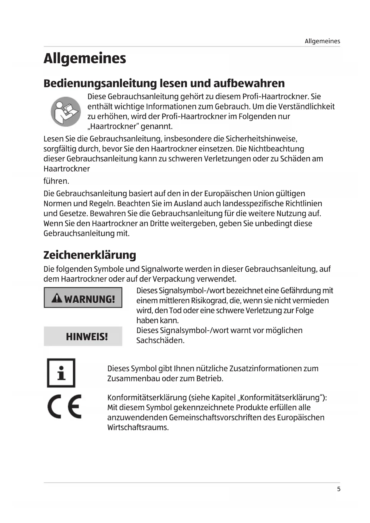 Allgemeines Bedienungsanleitung lesen und aufbewahren Diese Gebrauchsanleitung gehört zu diesem Profi-Haartrockner. Sie enthält wichtige Informationen zum Gebrauch. Um die Verständlichkeit zu erhöhen, wird der Profi-Haartrockner im Folgenden nur „Haartrockner“ genannt. Lesen Sie die Gebrauchsanleitung, insbesondere die Sicherheitshinweise, sorgfältig durch, bevor Sie den Haartrockner einsetzen. Die Nichtbeachtung dieser Gebrauchsanleitung kann zu schweren Verletzungen oder zu Schäden am Haartrockner führen. Die Gebrauchsanleitung basiert auf den in der Europäischen Union gültigen Normen und Regeln. Beachten Sie im Ausland auch landesspezifische Richtlinien und Gesetze. Bewahren Sie die Gebrauchsanleitung für die weitere Nutzung auf. Wenn Sie den Haartrockner an Dritte weitergeben, geben Sie unbedingt diese Gebrauchsanleitung mit. Zeichenerklärung Die folgenden Symbole und Signalworte werden in dieser Gebrauchsanleitung, auf dem Haartrockner oder auf der Verpackung verwendet. WARNUNG! Dieses Signalsymbol-/wort bezeichnet eine Gefährdung mit einem mittleren Risikograd, die, wenn sie nicht vermieden wird, den Tod oder eine schwere Verletzung zur Folge haben kann. HINWEIS! Dieses Signalsymbol-/wort warnt vor möglichen Sachschäden. Dieses Symbol gibt Ihnen nützliche Zusatzinformationen zum Zusammenbau oder zum Betrieb. Konformitätserklärung (siehe Kapitel „Konformitätserklärung“): Mit diesem Symbol gekennzeichnete Produkte erfüllen alle anzuwendenden Gemeinschaftsvorschriften des Europäischen Wirtschaftsraums. Buch_CH_ProfHaartrockner .indb 5Buch_CH_ProfHaartrockner .indb 5 14.09.2021 11:10:4514.09.2021 11:10:45Sicherheit