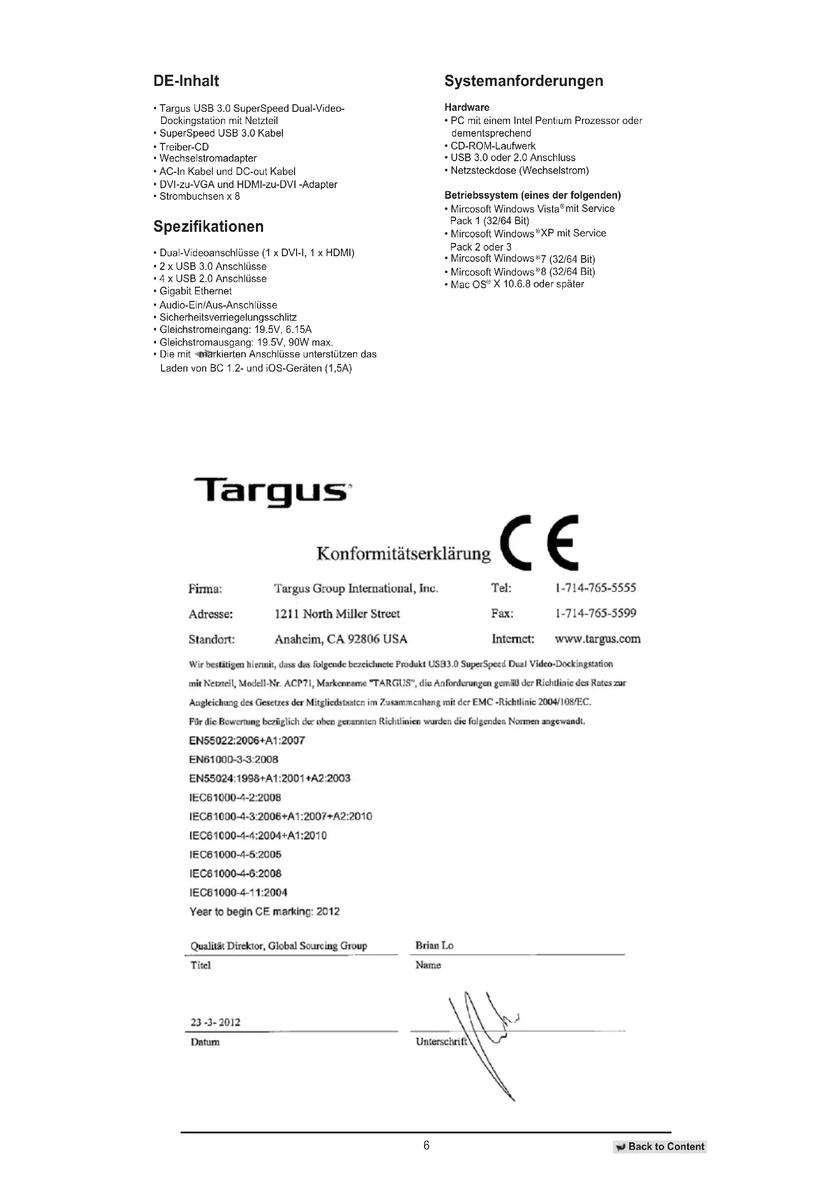 X 10.6.8 oder später Back to Content7 HINWEIS: SCHLIESSEN SIE NICHT DIE DOCKINGSTATION AN, BEVOR SIE DEN DISPLAYLINK-TREIBER INSTALLIERT HABEN