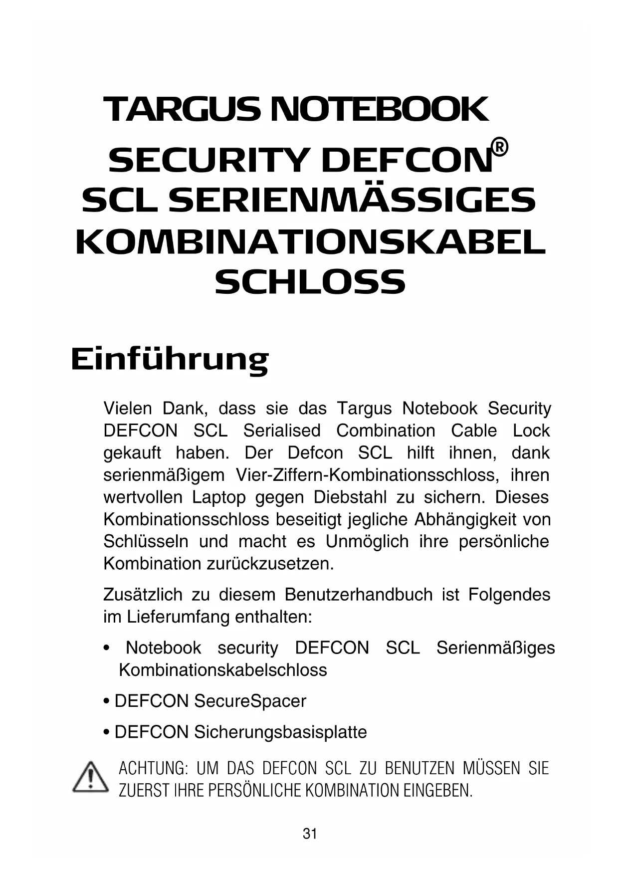 KOMBINATIONSKABEL SCHLOSS Einführung Vielen Dank, dass sie das Targus Notebook Security DEFCON SCL Serialised Combination Cable Lock gekauft haben. Der Defcon SCL hilft ihnen, dank serienmäßigem Vier-Ziffern-Kombinationsschloss, ihren wertvollen Laptop gegen Diebstahl zu sichern. Dieses Kombinationsschloss beseitigt jegliche Abhängigkeit von Schlüsseln und macht es Unmöglich ihre persönliche Kombination zurückzusetzen. Zusätzlich zu diesem Benutzerhandbuch ist Folgendes im Lieferumfang enthalten: