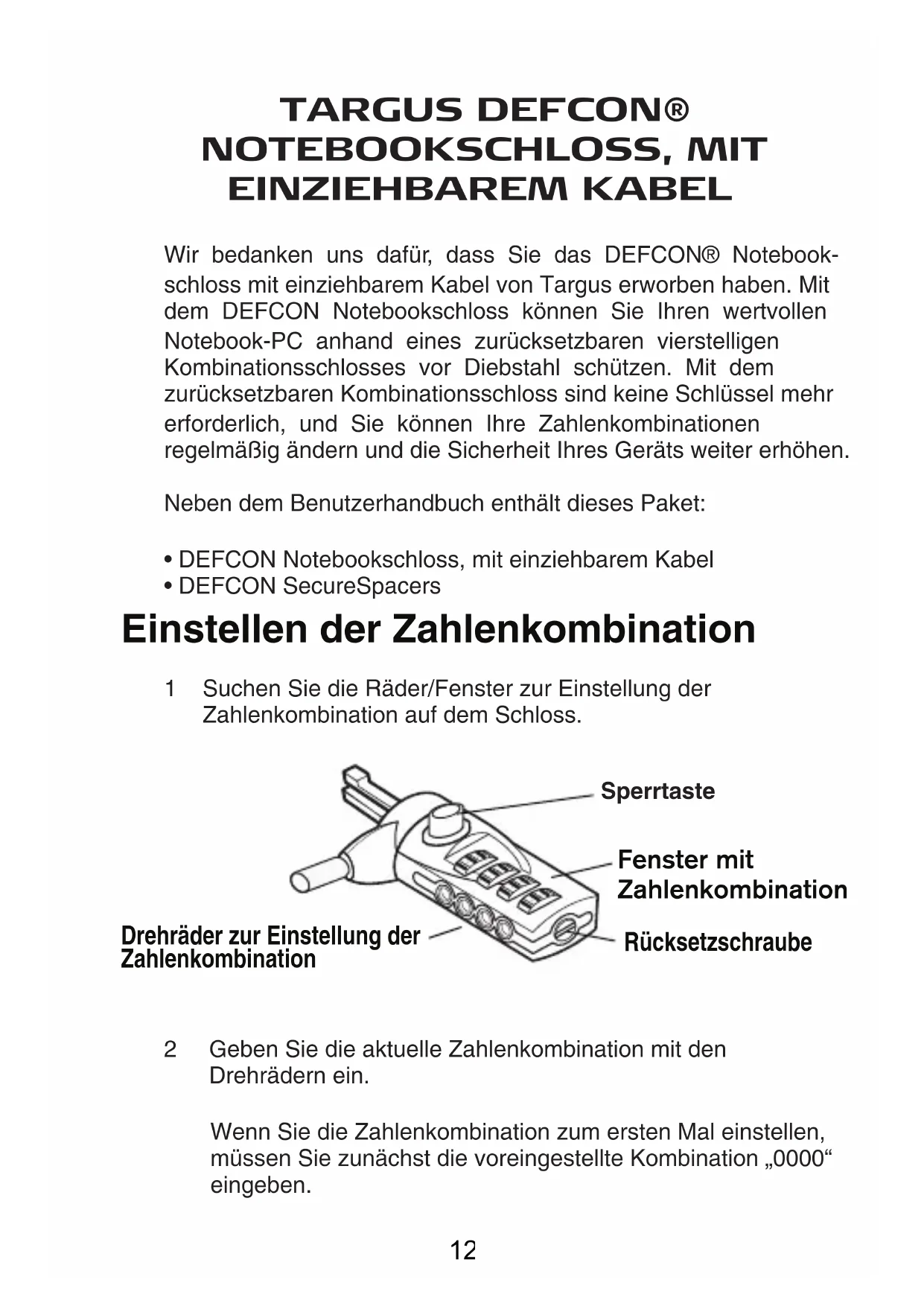 Entfernen Sie das DEFCON Notebookschloss vom Steckplatz an Ihrem Notebook. 17Technische Unterstützung Wenn Sie technische Fragen haben, besuchen Sie bitte: Internet http://www.targus.com/support.asp Englisch http://www.targus.com/uk/support.asp Französisch http://www.targus.com/fr/support.asp Deutsch http://www.targus.com/de/support.asp Spanisch http://www.targus.com/sp/support.asp Italienisch http://www.targus.com/it/support.asp Unser Expertenteam steht Ihnen auch telefonisch zur Beantwortung Ihrer Fragen zur Verfügung. Belgien 02-717-2451 Dänemark 45 35-25-87 51 Finnland 922948016 Frankreich 1-6453-9151 Deutschland 0211-6579-1151 Italien 02 4827-1151 Niederlande 02 0504 0671 Norwegen 022577729 Österreich 01 795 676 42 Portugal +351 21 415 4123 Spanien 91-745-6221 Schweden 08-751-4058 Schweiz 1-212-0007 Großbritannien 020-7744-0330 Osteuropa & sonstige Länder +31 (0) 20-5040671 18Produktregistrierung Targus empfiehlt die Registrierung des Targus-Zubehörs sofort nach dem Kauf. Die Registrierung von Targus-Zubehör erfolgt unter: http://www.targus.com/registration.asp Geben Sie bitte Ihren vollständigen Namen, Ihre E-Mail-Adresse, Telefonnummer und Firmeninformationen an (falls zutreffend). Garantie Targus garantiert zwei (2) Jahre lang, dass Zubehör von Targus frei von Fehlern im Material und in der Verarbeitung ist. Erweist sich Ihr Targus-Zubehör während dieser Zeit als fehlerhaft, wird es umgehend repariert oder ersetzt. Diese Garantie deckt weder zufällige oder mittelbare Schäden, noch Abnutzung oder Verschleiß ab. Unter keinen Umständen haftet Targus für Verlust oder Schäden an Computern bzw. für Verlust oder Schäden an Programmen, Aufzeichnungen oder Daten. Targus haftet auch nicht für mittelbare oder zufällige Schäden, selbst wenn Targus über deren Möglichkeit informiert wurde. Diese Garantie hat keinen Einfluss auf Ihre gesetzlichen Rechte. Targus Drahtlose Rechnertastatur Und Media-maus DEFCON ist eine Marke der Targus Group International. Alle sonstigen Marken sind Eigentum der jeweiligen Inhaber. 19DEFCON Notebookschloss - Zahlenkombination Sperrtaste Fenster mit Zahlenkombination Aufzeichnen der Zahlenkombination Tragen Sie Ihre Zahlenkombination in dem hier dafür vorgesehenen Feld ein. Gehen Sie beim Notieren der Zahlenkombination von der Sperrtaste ausgehend von links nach rechts vor. Targus übernimmt keine Verantwortung für gestohlene, verlorene oder vergessene Zahlenkombinationen. 20Establecimiento de la combinación Cable con candado DEFCON Discos selectores de combinación Tornillo de puesta en ceros Ventanas de combinación