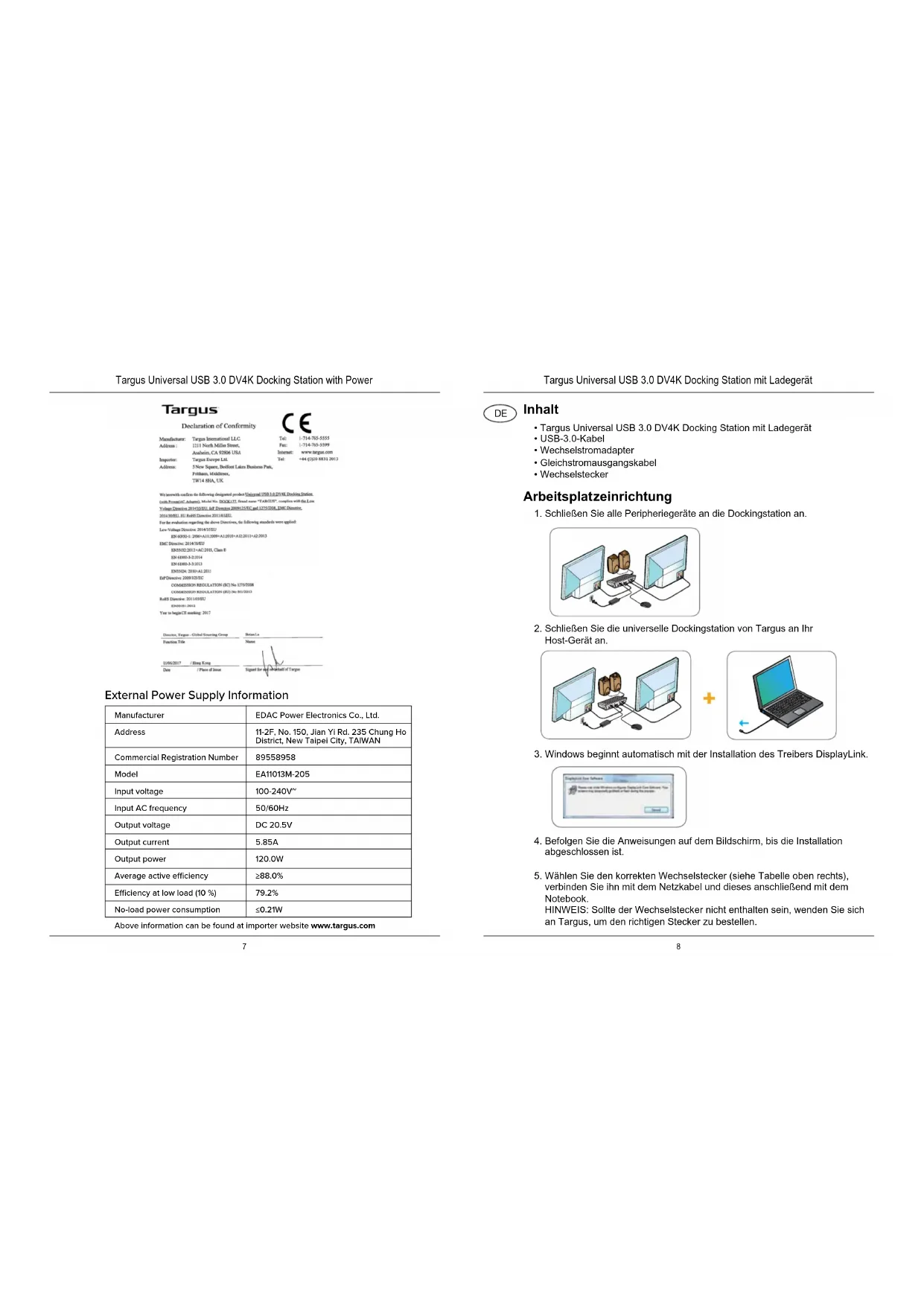- Ubuntu 14.04.x LTS und 16.04 LTS auf x86-Plattform (*siehe www.displaylink.com zur Kompatibilität und zu Einschränkungen) Stellen Sie für die optimale Leistung von Windows sicher, dass der Anzeige- Adapter und die USB-3.0-Treiber Ihres Host-PCs über die neueste Version verfügen. Die entsprechenden Updates erhalten Sie häufig von Ihrer IT- Abteilung oder dem Hersteller des PCs, wenn Sie über Administratorrechte verfügen, um die Treiber für Ihren PC herunterzuladen und zu installieren. Willkommen beim Targus Universal Docking Station DisplayLink Manager. Falls die Software DisplayLink Manager noch nicht installiert ist, können Sie diese von einem Windows Update-Server oder unter www.targus.com herunterladen. Sie wird in der Windows-Symbolleiste mit dem Symbol dargestellt und ermöglicht Ihnen ganz einfach, über die Targus Dockingstation zusätzliche Bildschirme an Ihr Notebook oder Ihren Desktop-PC anzuschließen. In Windows können Sie unter „Systemsteuerung“, „Anzeige“, „Bildschirmauösung“ die angeschlossenen Bildschirme so konfigurieren, dass Ihr Hauptbildschirm gespiegelt wird, oder Sie erweitern den Windows-Desktop, um mehrere Anwendungen gleichzeitig anzuzeigen. Die DisplayLink USB Graphics-Geräte können auch als Hauptbildschirm konfiguriert werden. Targus Universal USB 3.0 DV4K Docking Station mit Ladegerät11 12 folding line2 staples here (saddle stitching)folding line2 staples here (saddle stitching)Open size: 10”W x7”H Folded Size: 5”W x 7”H Material: 80gsm woodfree paper Color: GrayscaleDiecut Einrichtung unter OS-X Einrichtung unter Android Nach Installation der DisplayLink-Software für OS-X, die unter www.targus.com erhältlich ist, können MacBook-Nutzer die Systemeinstellungen für Monitore verwenden, um die externen Bildschirme anzupassen. OS-X ermöglicht die Konfiguration aller zusätzlichen USB-Bildschirme, einschließlich: