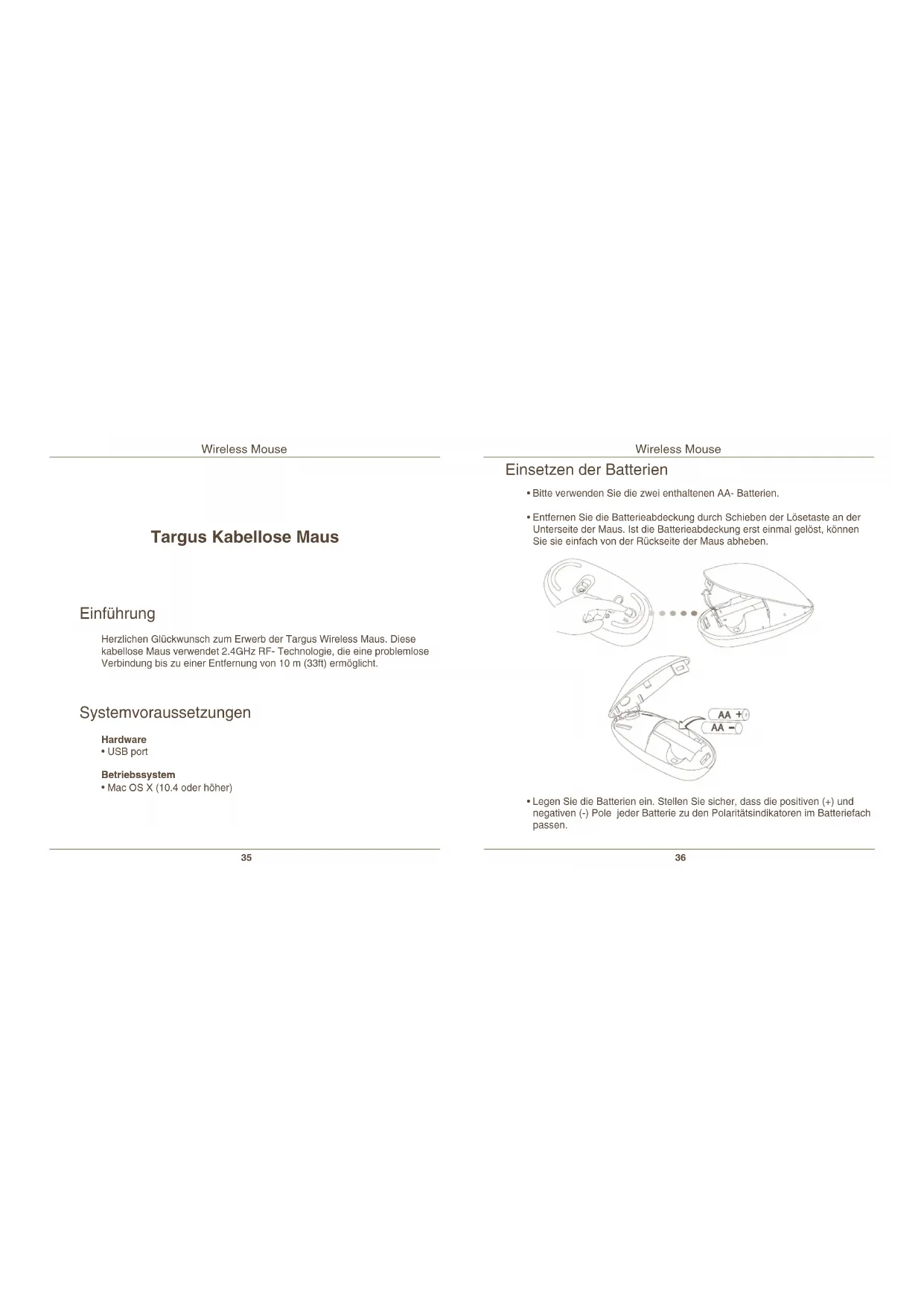 Targus Kabellose Maus Einführung Herzlichen Glückwunsch zum Erwerb der Targus Wireless Maus. Diese kabellose Maus verwendet 2.4GHz RF- Technologie, die eine problemlose Verbindung bis zu einer Entfernung von 10 m (33ft) ermöglicht. Systemvoraussetzungen Hardware