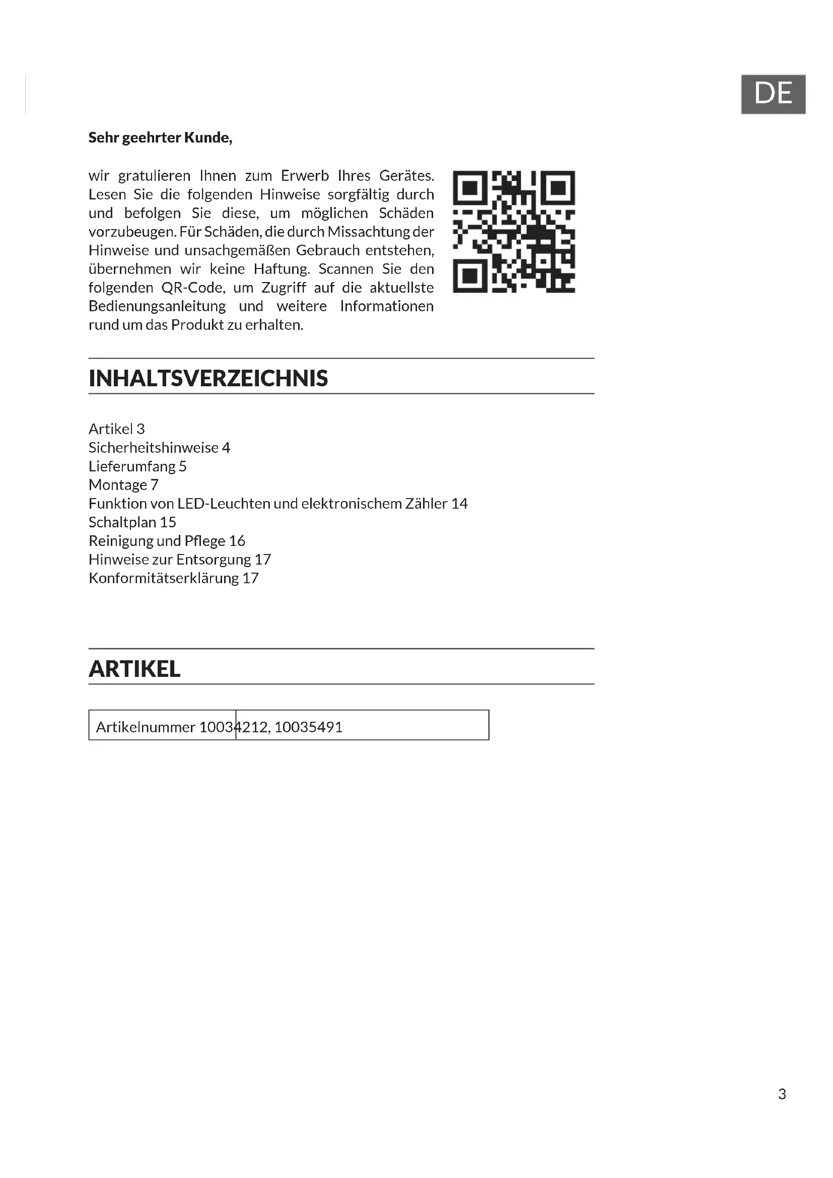 Artikel 3 Sicherheitshinweise 4 Lieferumfang 5 Montage 7 Funktion von LED-Leuchten und elektronischem Zähler 14 Schaltplan 15 Reinigung und Pege 16 Hinweise zur Entsorgung 17 Konformitätserklärung 17 ARTIKEL Artikelnummer 10034212, 10035491 Sehr geehrter Kunde, wir gratulieren Ihnen zum Erwerb Ihres Gerätes. Lesen Sie die folgenden Hinweise sorgfältig durch und befolgen Sie diese, um möglichen Schäden vorzubeugen. Für Schäden, die durch Missachtung der Hinweise und unsachgemäßen Gebrauch entstehen, übernehmen wir keine Haftung. Scannen Sie den folgenden QR-Code, um Zugriff auf die aktuellste Bedienungsanleitung und weitere Informationen rund um das Produkt zu erhalten. INHALTSVERZEICHNIS4