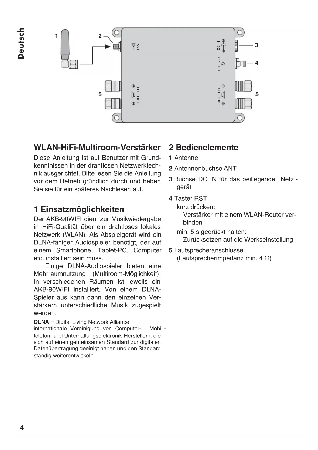 ELECTRONICS FOR SPECIALISTS ELECTRONICS FOR SPECIALISTS ELECTRONICS FOR SPECIALISTS ELECTRONICS FOR SPECIALISTS INSTALLATIONS- und BEDIENUNGSANLEITUNG INSTALLATION and INSTRUCTION MANUAL NOTICE D’INSTALLATION et D’UTILISATION ISTRUZIONI PER L’INSTALLAZIONE e PER L'USO WLAN-HiFi-Multiroom-Verstärker WLAN Hi-Fi Multi-Room Amplifier AKB-90WIFI Bestellnummer 32.009023 Deutsch . . . . . . . . . . . . . Seite 4 English . . . . . . . . . . . . . . Page 8 Français . . . . . . . . . . . . Page 12 Italiano . . . . . . . . . . . . . Pagina 16 ELECTRONICS FOR SPECIALISTS ELECTRONICS FOR SPECIALISTS ELECTRONICS FOR SPECIALISTS ELECTRONICS FOR SPECIALISTS4 Deutsch WLAN-HiFi-Multiroom-Verstärker Diese Anleitung ist auf Benutzer mit Grund- kenntnissen in der drahtlosen Netzwerktech- nik ausgerichtet. Bitte lesen Sie die Anleitung vor dem Betrieb gründlich durch und heben Sie sie für ein späteres Nachlesen auf. 1 Einsatzmöglichkeiten Der AKB-90WIFI dient zur Musikwiedergabe in HiFi-Qualität über ein drahtloses lokales Netzwerk (WLAN). Als Abspielgerät wird ein DLNA-fähiger Audiospieler benötigt, der auf einem Smartphone, Tablet-PC, Computer etc. installiert sein muss. Einige DLNA-Audiospieler bieten eine Mehrraumnutzung (Multiroom-Möglichkeit): In verschiedenen Räumen ist jeweils ein AKB-90WIFI installiert. Von einem DLNA- Spieler aus kann dann den einzelnen Ver- stärkern unterschiedliche Musik zugespielt werden. DLNA = Digital Living Network Alliance internationale Vereinigung von Computer-, Mobil - telefon- und Unterhaltungselektronik-Herstellern, die sich auf einen gemeinsamen Standard zur digitalen Datenübertragung geeinigt haben und den Standard ständig weiterentwickeln 2 Bedienelemente 1 Antenne 2 Antennenbuchse ANT 3 Buchse DC IN für das beiliegende Netz - gerät 4 Taster RST kurz drücken: Verstärker mit einem WLAN-Router ver- binden min. 5 s gedrückt halten: Zurücksetzen auf die Werkseinstellung 5 Lautsprecheranschlüsse (Lautsprecherimpedanz min. 4 Ω) LEFT OUTRST >5 s ANT
