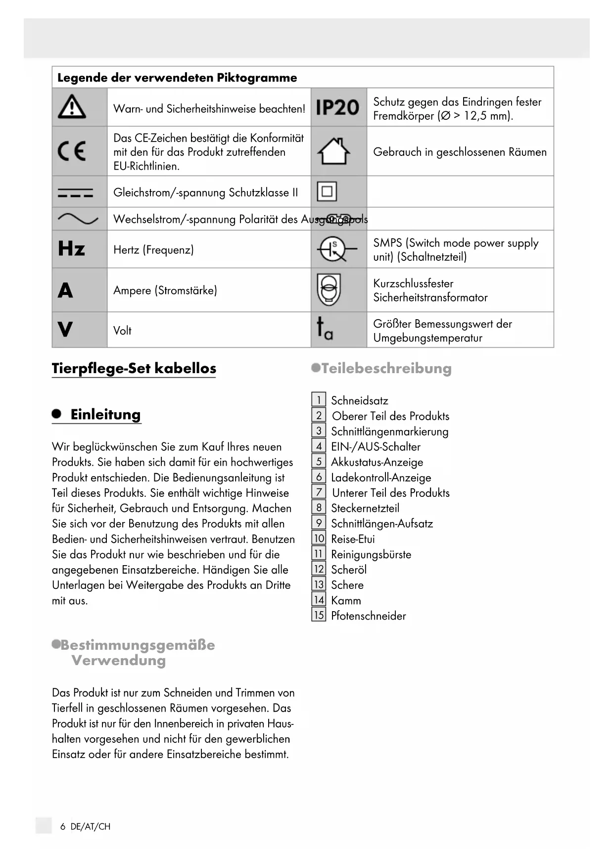 Volt Größter Bemessungswert der Umgebungstemperatur Tierpflege-Set kabellos Einleitung Wir beglückwünschen Sie zum Kauf Ihres neuen Produkts. Sie haben sich damit für ein hochwertiges Produkt entschieden. Die Bedienungsanleitung ist Teil dieses Produkts. Sie enthält wichtige Hinweise für Sicherheit, Gebrauch und Entsorgung. Machen Sie sich vor der Benutzung des Produkts mit allen Bedien- und Sicherheitshinweisen vertraut. Benutzen Sie das Produkt nur wie beschrieben und für die angegebenen Einsatzbereiche. Händigen Sie alle Unterlagen bei Weitergabe des Produkts an Dritte mit aus. Bestimmungsgemäße Verwendung Das Produkt ist nur zum Schneiden und Trimmen von Tierfell in geschlossenen Räumen vorgesehen. Das Produkt ist nur für den Innenbereich in privaten Haus- halten vorgesehen und nicht für den gewerblichen Einsatz oder für andere Einsatzbereiche bestimmt. Teilebeschreibung