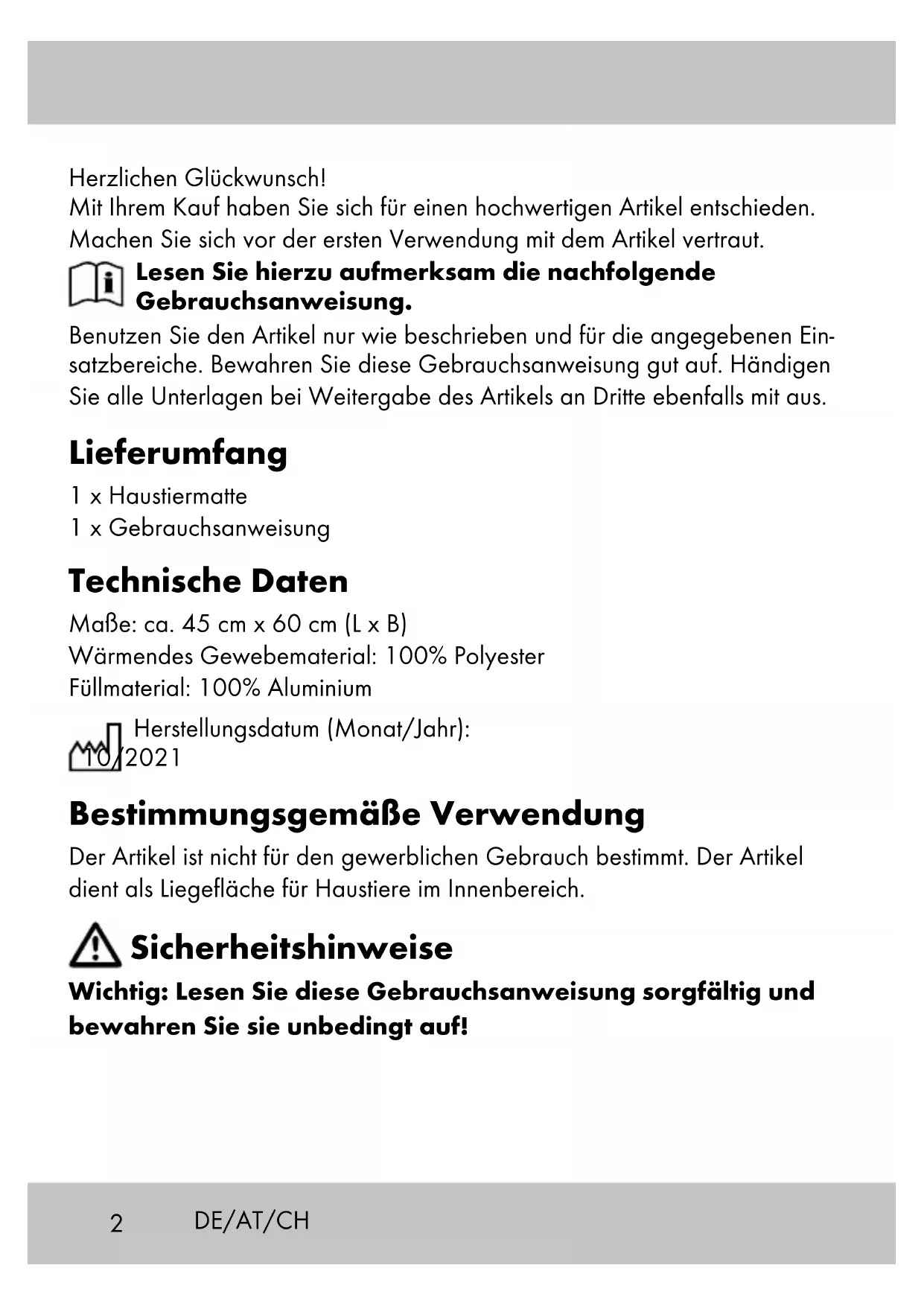 IAN 373701_21042 Herzlichen Glückwunsch! Mit Ihrem Kauf haben Sie sich für einen hochwertigen Artikel entschieden. Machen Sie sich vor der ersten Verwendung mit dem Artikel vertraut. Lesen Sie hierzu aufmerksam die nachfolgende Gebrauchsanweisung. Benutzen Sie den Artikel nur wie beschrieben und für die angegebenen Ein- satzbereiche. Bewahren Sie diese Gebrauchsanweisung gut auf. Händigen Sie alle Unterlagen bei Weitergabe des Artikels an Dritte ebenfalls mit aus. Lieferumfang 1 x Haustiermatte 1 x Gebrauchsanweisung Technische Daten Maße: ca. 45 cm x 60 cm (L x B) Wärmendes Gewebematerial: 100% Polyester Füllmaterial: 100% Aluminium Herstellungsdatum (Monat/Jahr): 10/2021 Bestimmungsgemäße Verwendung Der Artikel ist nicht für den gewerblichen Gebrauch bestimmt. Der Artikel dient als Liegefläche für Haustiere im Innenbereich. Sicherheitshinweise Wichtig: Lesen Sie diese Gebrauchsanweisung sorgfältig und bewahren Sie sie unbedingt auf! DE/AT/CH3DE/AT/CH Lebensgefahr!