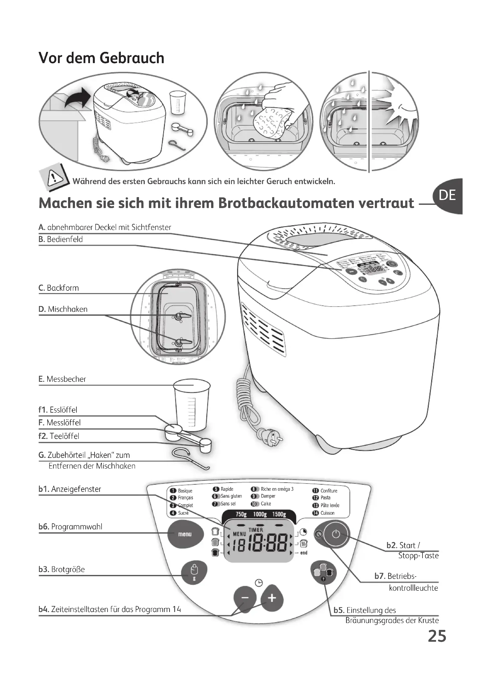 - Dompel het apparaat of het deksel niet onder. Reiniging en onderhoud Veiligheidsvoorschriften TEFAL-OW5000-NC00017447_TEFAL-OW5000-NC00017447 26/07/10 10:16 Page24BasiqueFrançaisCompletRapideSans glutenSans selRiche en oméga 3Damper Cake SucréConfiturePastaPâte levéeCuisson Vor dem Gebrauch Bas iqueFran çai sCom pletRap ideSan s gl utenSan s se lRic he e n om éga 3Dam perCak eSCon fitu rePast aPât e le véeC Während des ersten Gebrauchs kann sich ein leichter Geruch entwickeln. Machen sie sich mit ihrem Brotbackautomaten vertraut A. abnehmbarer Deckel mit Sichtfenster B. Bedienfeld f2. Teelöffel b1. Anzeigefenster b2. Start / Stopp-Taste b7. Betriebs- kontrollleuchte b5. Einstellung des Bräunungsgrades der Kruste F. Messlöffel f1. Esslöffel C. Backform G. Zubehörteil „Haken“ zum Entfernen der Mischhaken E. Messbecher b6. Programmwahl b3. Brotgröße b4. Zeiteinstelltasten für das Programm 14 D. Mischhaken