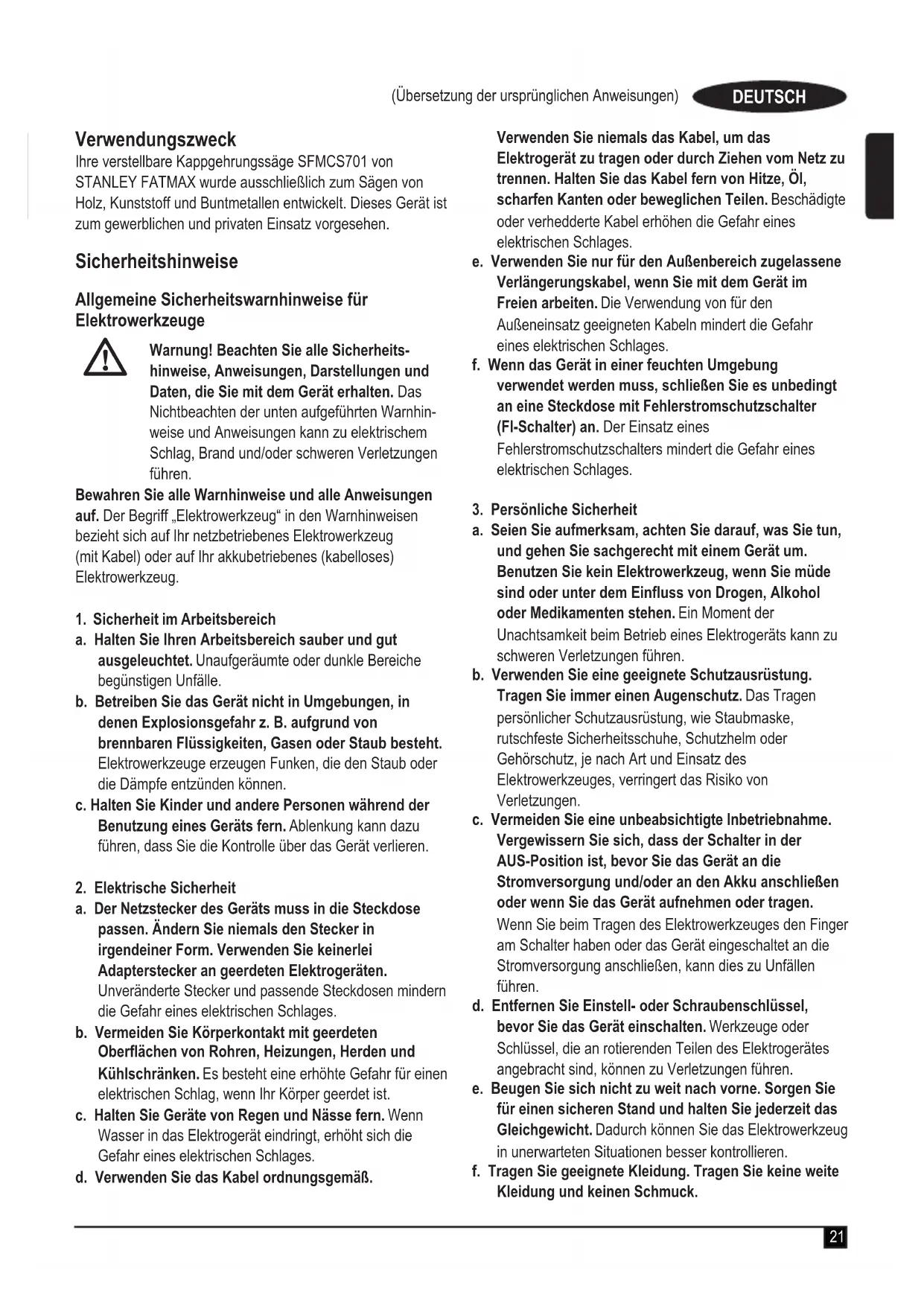 Warnung! Die Berührung und das Einatmen von Stäuben, die beim Sägen von Materialien entstehen, können beim Bediener und bei Umstehenden gesundheitliche Schäden verur- sachen. Tragen Sie eine speziell für den Schutz vor Staub und Dämpfen vorgesehene Staub- maske, und stellen Sie sicher, dass auch andere Personen entsprechend geschützt sind, die den Arbeitsplatz betreten oder sich dort aufhalten. u Bearbeiten Sie keinesfalls asbesthaltige Materialien. Asbest ist krebserregend. u Tragen Sie beim Umgang mit Sägeblättern und rauen Materialien Handschuhe (Sägeblätter sollten möglichst mithilfe einer Halterung getragen werden). u Tragen Sie Gehörschutz, um die Gefahr von lärmbedingten Hörverlust zu reduzieren. u Verwenden Sie ggf. spezielle geräuscharme Sägeblätter.u Tragen Sie Augenschutz, um die Gefahr von Verletzungen zu reduzieren. u Verwenden Sie beim Sägen von Holz den mitgelieferten Staubbeutel. u Halten Sie das Elektrowerkzeug an den isolierten Griffächen, wenn Arbeiten durchgeführt werden, bei denen das Schneidewerkzeug versteckte Leitungen oder die eigene Anschlussleitung berühren könnte. Der Kontakt mit stromführenden Leitungen kann auch offen liegende Metallteile am Gerät unter Strom setzen und zu einem Stromschlag führen. u Wählen Sie das richtige Sägeblatt für das zu schneidende Material. u Betreiben Sie das Gerät nicht ohne Schutzvorrichtung. Betreiben Sie das Gerät nicht, wenn die Schutzvorrichtung defekt oder nicht ordnungsgemäß gewartet ist. u Vergewissern Sie sich vor der Durchführung von Neigungsschnitten, dass der Arm sicher befestigt ist. u Vergewissern Sie sich vor jedem Sägevorgang, dass die Maschine stabil steht. u Achten Sie darauf, dass die Griffe trocken, sauber sowie frei von Öl und Fett sind. u Halten Sie die Umgebung des Geräts sauber und frei von losem Material wie Spänen und Verschnittmaterial. u Stellen Sie sicher, dass das Gerät und der Arbeitsbereich über eine angemessene allgemeine Beleuchtung oder Punktbeleuchtung verfügen. u Das Gerät darf nicht von unerfahrenen Personen verwendet werden. u Stellen Sie vor der Verwendung sicher, dass das Sägeblatt ordnungsgemäß angebracht ist. Vergewissern Sie sich, dass das Sägeblatt sich in die richtige Richtung dreht. Achten Sie darauf, dass das Sägeblatt scharf ist. Befolgen Sie die Anweisungen zum Schmieren und Wechseln von Zubehörteilen.25 (Übersetzung der ursprünglichen Anweisungen) DEUTSCH u Stellen Sie sicher, dass die auf dem Sägeblatt angegebene Drehzahl mindestens so hoch ist wie die auf der Säge angegebene Drehzahl. u Vergewissern Sie sich, dass alle Distanz- und Spindelringe dem von STANLEY FATMAX angegebenen Zweck entsprechen. u Reparaturen des Schnittlinienführungssystems sollten durch das Personal einer Vertragswerkstatt oder durch den STANLEY FATMAX Kundendienst erfolgen. u Entfernen Sie den Akku vor der Durchführung der Wartung und vor dem Sägeblattwechsel aus der Maschine. u Führen Sie keinesfalls Reinigungs- oder Wartungsarbeiten aus und entfernen Sie keinesfalls Verschnittmaterial oder andere Teile des Werkstücks, wenn das Gerät eingeschaltet ist und sich der Sägekopf nicht in der Ruhestellung bendet. u Sofern möglich, sollte sich die Maschine immer auf einer Werkbank benden. u Stellen Sie vor dem Betrieb sicher, dass alle Verriegelungen und Griffe fest sitzen. u Verwenden Sie die Säge keinesfalls ohne Tischeinlage. u Versuchen Sie keinesfalls, das Gerät mithilfe eines Werkzeugs oder anderer Gegenstände plötzlich anzuhalten. Dadurch können ernsthafte Verletzungen verursacht werden. u Lesen Sie vor dem Verwenden oder Anbringen von Zubehör die Anleitung. Die falsche Verwendung von Zubehör kann Sachschäden verursachen. u Heben Sie das Sägeblatt aus der Tischeinlage im Werkstück heraus, bevor Sie den Ein-/Ausschalter loslassen. u Blockieren Sie nie den Ventilator, um die Antriebswelle zu stoppen. u Der Blattschutz an Ihrer Säge wird automatisch hochgezogen, wenn der Arm gesenkt wird; er schwenkt wieder zurück, wenn die Säge in die Ausgangsposition zurückkehrt. Der Blattschutz kann von Hand hochgezogen werden, wenn Sägeblätter ausgewechselt werden und wenn der Zustand der Säge geprüft werden soll. Heben Sie den Sägeblattschutz keinesfalls während des Betriebs an. u Überprüfen Sie regelmäßig, ob die Belüftungsschlitze des Motors sauber und spanfrei sind. u Machen Sie die Warnsymbole auf dem Gerät keinesfalls unkenntlich. u Stützen Sie sich keinesfalls auf dem Gerät ab. Das Kippen des Geräts oder das Berühren des Sägeblatts kann ernsthafte Verletzungen verursachen. u Berühren Sie nach dem Gebrauch das Sägeblatt erst, wenn es abgekühlt ist. Das Sägeblatt wird bei der Arbeit sehr heiß. u Um Verletzungen durch umhergeschleuderte Materialien zu verhindern, nehmen Sie den Akku heraus, um unbeabsichtigtes Starten zu verhindern, und entfernen Sie dann kleine Materialien. u Vor der Verwendung und nach allen Wartungsarbeiten muss der Sägeblattschutz überprüft werden, um dessen ordnungsgemäße Funktion sicherzustellen. Während der Überprüfung muss die Säge ausgeschaltet und der Akku entfernt worden sein. Der Arm muss angehoben und gesenkt werden, um sicherzustellen, dass die Schutzvorrichtung das Sägeblatt bedeckt und das Sägeblatt die Schutzvorrichtung nicht berührt. Wenn die Schutzvorrichtung nicht ordnungsgemäß funktioniert, muss das Gerät durch qualiziertes Fachpersonal gewartet werden. Wenden Sie sich telefonisch an den STANLEY FATMAX Kundendienst, um Informationen zu einer Vertragswerkstatt in Ihrer Nähe zu erhalten. u Diese Gehrungssäge wurde ausschließlich zum Sägen von Holz, Kunststoff und Buntmetallen entwickelt. Verwenden Sie das Gerät nicht zum Schneiden von Werkstoffen, die nicht vom Hersteller empfohlen sind. u Berühren Sie nach dem Gebrauch das Sägeblatt erst, wenn es abgekühlt ist. Das Sägeblatt wird bei der Arbeit sehr heiß.