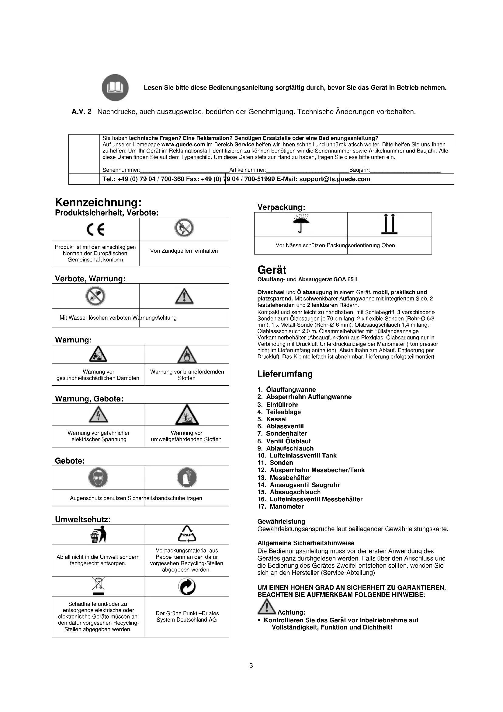 2Lesen Sie bitte diese Bedienungsanleitung sorgfältig durch, bevor Sie das Gerät in Betrieb nehmen. A.V. 2 Nachdrucke, auch auszugsweise, bedürfen der Genehmigung. Technische Änderungen vorbehalten. Sie haben technische Fragen? Eine Reklamation? Benötigen Ersatzteile oder eine Bedienungsanleitung? Auf unserer Homepage www.guede.com im Bereich Service helfen wir Ihnen schnell und unbürokratisch weiter. Bitte helfen Sie uns Ihnen zu helfen. Um Ihr Gerät im Reklamationsfall identifizieren zu können benötigen wir die Seriennummer sowie Artikelnummer und Baujahr. Alle diese Daten finden Sie auf dem Typenschild. Um diese Daten stets zur Hand zu haben, tragen Sie diese bitte unten ein.Seriennummer:_____________________________Artikelnummer:___________________________Baujahr:_______________________Tel.: +49 (0) 79 04 / 700-360 Fax: +49 (0) 79 04 / 700-51999 E-Mail: support@ts.guede.com Kennzeichnung: Produktsicherheit, Verbote: Produkt ist mit den einschlägigenNormen der EuropäischenGemeinschaft konformVon Zündquellen fernhalten Verbote, Warnung: Mit Wasser löschen verboten Warnung/Achtung Warnung: Warnung vorgesundheitsschädlichen DämpfenWarnung vor brandförderndenStoffen Warnung, Gebote: Warnung vor gefährlicherelektrischer SpannungWarnung vorumweltgefährdenden Stoffen Gebote: Augenschutz benutzen Sicherheitshandschuhe tragen Umweltschutz: Abfall nicht in die Umwelt sondernfachgerecht entsorgen.Verpackungsmaterial ausPappe kann an den dafürvorgesehen Recycling-Stellenabgegeben werden.Schadhafte und/oder zuentsorgende elektrische oderelektronische Geräte müssen anden dafür vorgesehen Recycling-Stellen abgegeben werden.Der Grüne Punkt –DualesSystem Deutschland AG Verpackung: Vor Nässe schützen Packungsorientierung Oben Gerät Ölauffang- und Absauggerät GOA 65 LÖlwechsel und Ölabsaugung in einem Gerät, mobil, praktisch undplatzsparend. Mit schwenkbarer Auffangwanne mit integriertem Sieb, 2feststehenden und 2 lenkbaren Rädern.Kompakt und sehr leicht zu handhaben, mit Schiebegriff, 3 verschiedeneSonden zum Ölabsaugen je 70 cm lang: 2 x flexible Sonden (Rohr-Ø 6/8mm), 1 x Metall-Sonde (Rohr-Ø 6 mm). Ölabsaugschlauch 1,4 m lang,Ölablassschlauch 2,0 m. Ölsammelbehälter mit FüllstandsanzeigeVorkammerbehälter (Absaugfunktion) aus Plexiglas. Ölabsaugung nur inVerbindung mit Druckluft-Unterdruckanzeige per Manometer (Kompressornicht im Lieferumfang enthalten). Abstellhahn am Ablauf. Entleerung perDruckluft. Das Kleinteilefach ist abnehmbar, Lieferung erfolgt teilmontiert. Lieferumfang 1. Ölauffangwanne2. Absperrhahn Auffangwanne3. Einfüllrohr4. Teileablage5. Kessel6. Ablassventil7. Sondenhalter8. Ventil Ölablauf9. Ablaufschlauch10. Lufteinlassventil Tank11. Sonden12. Absperrhahn Messbecher/Tank13. Messbehälter14. Ansaugventil Saugrohr15. Absaugschlauch16. Lufteinlassventil Messbehälter17. ManometerGewährleistungGewährleistungsansprüche laut beiliegender Gewährleistungskarte.Allgemeine SicherheitshinweiseDie Bedienungsanleitung muss vor der ersten Anwendung desGerätes ganz durchgelesen werden. Falls über den Anschluss unddie Bedienung des Gerätes Zweifel entstehen sollten, wenden Siesich an den Hersteller (Service-Abteilung)UM EINEN HOHEN GRAD AN SICHERHEIT ZU GARANTIEREN,BEACHTEN SIE AUFMERKSAM FOLGENDE HINWEISE: Achtung:• Kontrollieren Sie das Gerät vor Inbetriebnahme aufVollständigkeit, Funktion und Dichtheit!