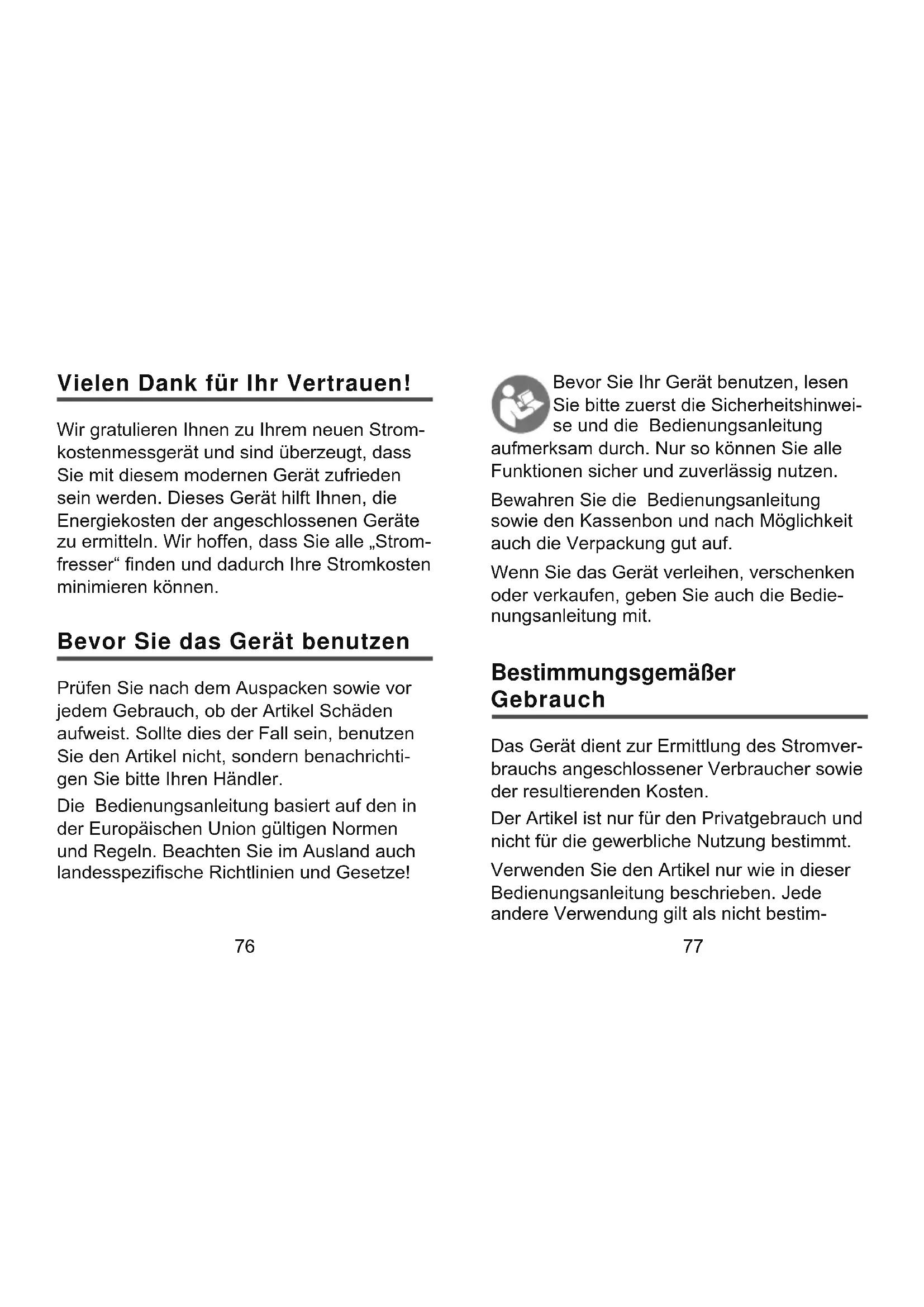 Vielen Dank für Ihr Vertrauen! Wir gratulieren Ihnen zu Ihrem neuen Strom- kostenmessgerät und sind überzeugt, dass Sie mit diesem modernen Gerät zufrieden sein werden. Dieses Gerät hilft Ihnen, die Energiekosten der angeschlossenen Geräte zu ermitteln. Wir hoffen, dass Sie alle „Strom- fresser“ nden und dadurch Ihre Stromkosten minimieren können. Bevor Sie das Gerät benutzen Prüfen Sie nach dem Auspacken sowie vor jedem Gebrauch, ob der Artikel Schäden aufweist. Sollte dies der Fall sein, benutzen Sie den Artikel nicht, sondern benachrichti- gen Sie bitte Ihren Händler. Die Bedienungsanleitung basiert auf den in der Europäischen Union gültigen Normen und Regeln. Beachten Sie im Ausland auch landesspezische Richtlinien und Gesetze! Bevor Sie Ihr Gerät benutzen, lesen Sie bitte zuerst die Sicherheitshinwei- se und die Bedienungsanleitung aufmerksam durch. Nur so können Sie alle Funktionen sicher und zuverlässig nutzen. Bewahren Sie die Bedienungsanleitung sowie den Kassenbon und nach Möglichkeit auch die Verpackung gut auf. Wenn Sie das Gerät verleihen, verschenken oder verkaufen, geben Sie auch die Bedie- nungsanleitung mit. Bestimmungsgemäßer Gebrauch Das Gerät dient zur Ermittlung des Stromver- brauchs angeschlossener Verbraucher sowie der resultierenden Kosten. Der Artikel ist nur für den Privatgebrauch und nicht für die gewerbliche Nutzung bestimmt. Verwenden Sie den Artikel nur wie in dieser Bedienungsanleitung beschrieben. Jede andere Verwendung gilt als nicht bestim-78