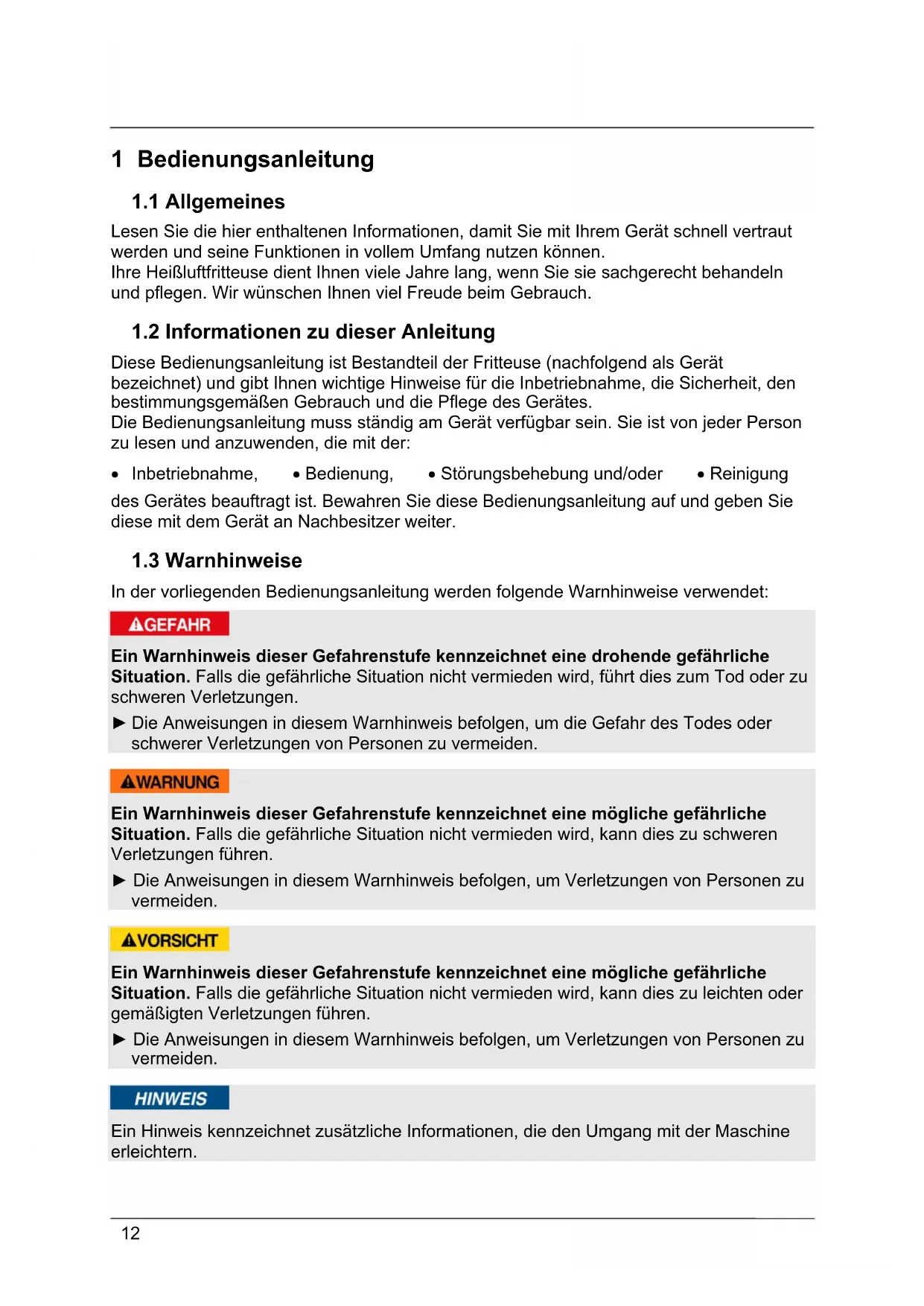 Dieses Gerät ist nur für den Gebrauch im Haushalt in geschlossenen Räumen zum Erwärmen, Auftauen, Warmhalten, fettfreien Frittieren, Garen, Braten, Backen, Grillen und Dörren von Lebensmitteln bestimmt. Dieses Gerät ist dazu bestimmt, im Haushalt und haushaltsähnlichen Aufstellungsumgebungen verwendet zu werden wie beispielsweise: in Küchen für Mitarbeiter in Läden, Büros, und anderen gewerblichen Bereichen; in landwirtschaftlichen Anwesen; in Frühstückspensionen; von Kunden in Hotels, Motels und anderen Wohneinrichtungen. Eine andere oder darüber hinausgehende Benutzung gilt als nicht bestimmungsgemäß. Gefahr durch nicht bestimmungsgemäße Verwendung! Von dem Gerät können bei nicht bestimmungsgemäßer Verwendung und/oder andersartiger Nutzung Gefahren ausgehen. ► Das Gerät ausschließlich bestimmungsgemäß verwenden. ► Die in dieser Bedienungsanleitung beschriebenen Vorgehensweisen einhalten. Ansprüche jeglicher Art wegen Schäden aus nicht bestimmungsgemäßer Verwendung sind ausgeschlossen. Das Risiko trägt allein der Betreiber.14