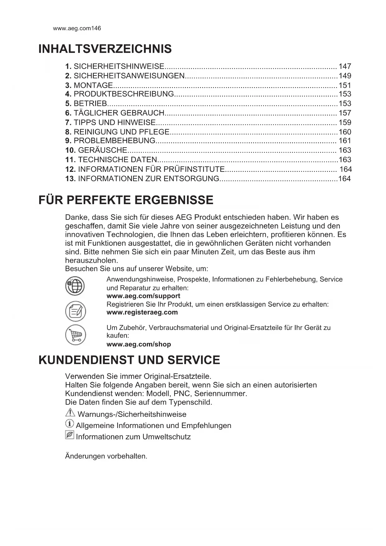 Danke, dass Sie sich für dieses AEG Produkt entschieden haben. Wir haben es geschaffen, damit Sie viele Jahre von seiner ausgezeichneten Leistung und den innovativen Technologien, die Ihnen das Leben erleichtern, profitieren können. Es ist mit Funktionen ausgestattet, die in gewöhnlichen Geräten nicht vorhanden sind. Bitte nehmen Sie sich ein paar Minuten Zeit, um das Beste aus ihm herauszuholen. Besuchen Sie uns auf unserer Website, um: Anwendungshinweise, Prospekte, Informationen zu Fehlerbehebung, Service und Reparatur zu erhalten: www.aeg.com/support Registrieren Sie Ihr Produkt, um einen erstklassigen Service zu erhalten: www.registeraeg.com Um Zubehör, Verbrauchsmaterial und Original-Ersatzteile für Ihr Gerät zu kaufen: www.aeg.com/shop