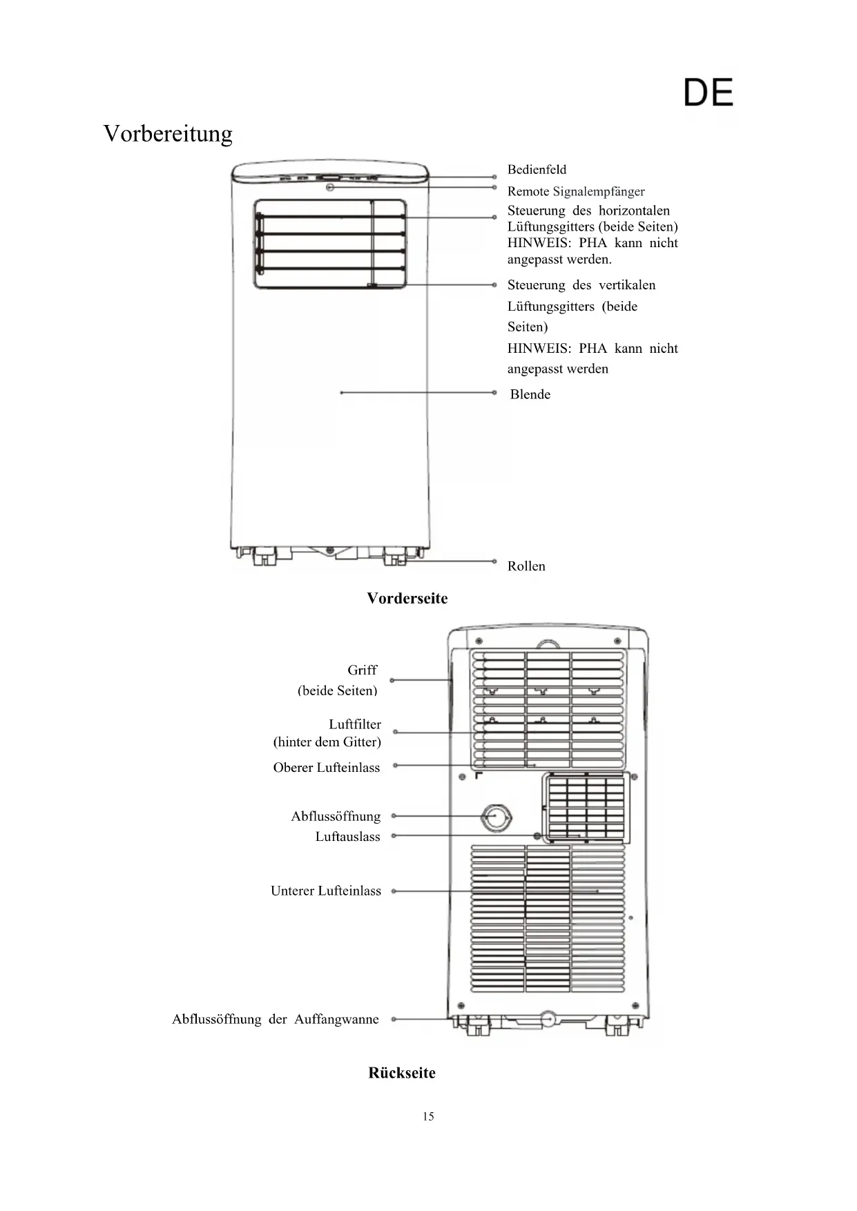 Vielen Dank für den Kauf unseres tragbaren Klimagerätes Lesen Sie bitte diese Bedienungsanleitung vor der Verwendung Ihres Klimagerät sorgfältig durch und bewahren Sie sie zum späteren Nachschlagen auf. DIESE ANLEITUNG LESEN UND AUFBEWAHREN!! DE1 Inhalte Sicherheitshinweise ·········································································· 2 Vorsichtsmaßnahmen ········································································ 4 Warnungen (nur für die Kühlmittel R290/R32) ·········································· 6 Vorbereitungen ················································································ 15 Installation ····················································································· 17 Verwendung ··················································································· 21 Pflege ··························································································· 28 Fehlerdiagnose ················································································ 29 Hinweise zum Design und der Kompatibilität ············································ 30 Soziale Bemerkungen ········································································ 31 DE15 Vorbereitung Vorderseite Rückseite Bedienfeld Remote Signalempfänger Steuerung des horizontalen Lüftungsgitters (beide Seiten) HINWEIS: PHA kann nicht angepasst werden. Steuerung des vertikalen Lüftungsgitters (beide Seiten) HINWEIS: PHA kann nicht angepasst werden Blende Rollen Griff (beide Seiten) Luftfilter (hinter dem Gitter) Oberer Lufteinlass Abflussöffnung Luftauslass Unterer Lufteinlass Abflussöffnung der Auffangwanne DE16 Vorbereitung HINWEIS: Das Gerät, das Sie gekauft haben, könnte aussehen, wie eines der folgenden: