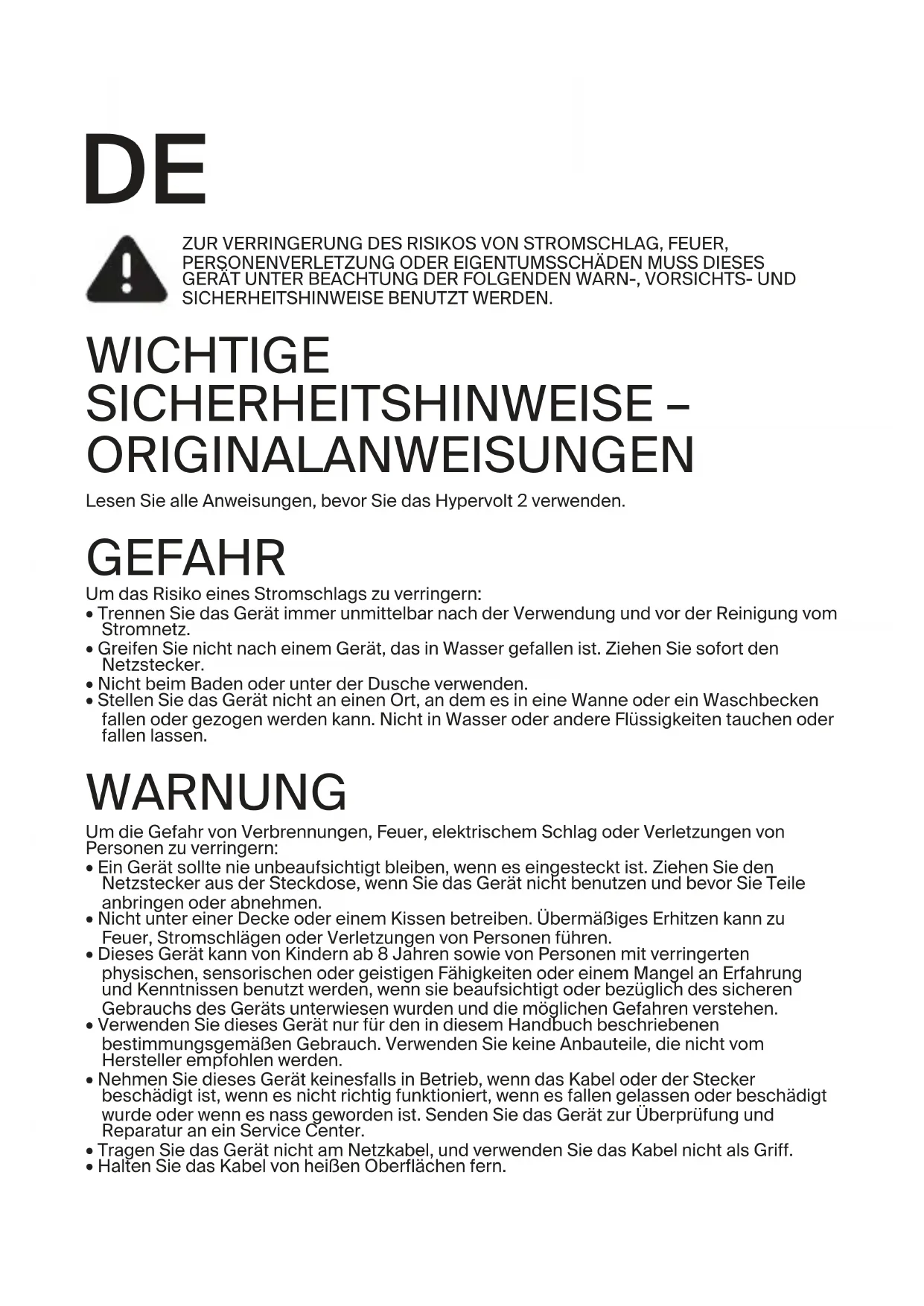 GERÄT UNTER BEACHTUNG DER FOLGENDEN WARN-, VORSICHTS- UND SICHERHEITSHINWEISE BENUTZT WERDEN. WICHTIGE SICHERHEITSHINWEISE – ORIGINALANWEISUNGEN Lesen Sie alle Anweisungen, bevor Sie das Hypervolt2 verwenden. GEFAHR Um das Risiko eines Stromschlags zu verringern: