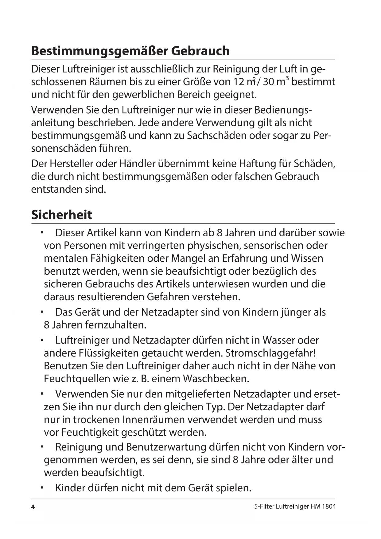 / 30 m³ bestimmt und nicht für den gewerblichen Bereich geeignet. Verwenden Sie den Luftreiniger nur wie in dieser Bedienungs- anleitung beschrieben. Jede andere Verwendung gilt als nicht bestimmungsgemäß und kann zu Sachschäden oder sogar zu Per- sonenschäden führen. Der Hersteller oder Händler übernimmt keine Haftung für Schäden, die durch nicht bestimmungsgemäßen oder falschen Gebrauch entstanden sind. Sicherheit Dieser Artikel kann von Kindern ab 8 Jahren und darüber sowie von Personen mit verringerten physischen, sensorischen oder mentalen Fähigkeiten oder Mangel an Erfahrung und Wissen benutzt werden, wenn sie beaufsichtigt oder bezüglich des sicheren Gebrauchs des Artikels unterwiesen wurden und die daraus resultierenden Gefahren verstehen. Das Gerät und der Netzadapter sind von Kindern jünger als 8Jahren fernzuhalten. Luftreiniger und Netzadapter dürfen nicht in Wasser oder andere Flüssigkeiten getaucht werden. Stromschlaggefahr! Benutzen Sie den Luftreiniger daher auch nicht in der Nähe von Feuchtquellen wie z. B. einem Waschbecken. Verwenden Sie nur den mitgelieferten Netzadapter und erset- zen Sie ihn nur durch den gleichen Typ. Der Netzadapter darf nur in trockenen Innenräumen verwendet werden und muss vor Feuchtigkeit geschützt werden. Reinigung und Benutzerwartung dürfen nicht von Kindern vor- genommen werden, es sei denn, sie sind 8 Jahre oder älter und werden beaufsichtigt. Kinder dürfen nicht mit dem Gerät spielen.Sicherheit