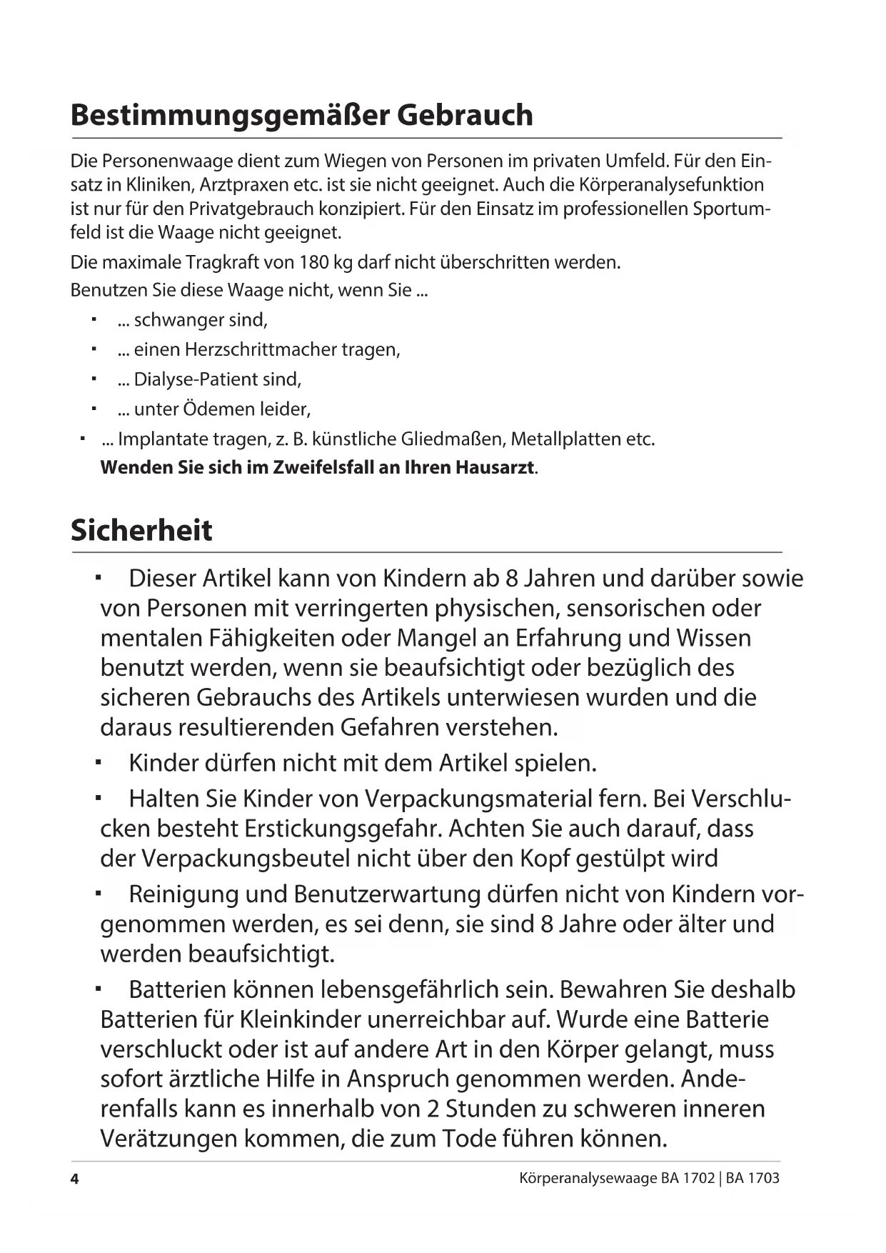 Körperanalysewaage BA 1702 | BA 1703 Bestimmungsgemäßer Gebrauch Die Personenwaage dient zum Wiegen von Personen im privaten Umfeld. Für den Ein- satz in Kliniken, Arztpraxen etc. ist sie nicht geeignet. Auch die Körperanalysefunktion ist nur für den Privatgebrauch konzipiert. Für den Einsatz im professionellen Sportum- feld ist die Waage nicht geeignet. Die maximale Tragkraft von 180 kg darf nicht überschritten werden. Benutzen Sie diese Waage nicht, wenn Sie ... ... schwanger sind, ... einen Herzschrittmacher tragen, ... Dialyse-Patient sind, ... unter Ödemen leider, ... Implantate tragen, z.B. künstliche Gliedmaßen, Metallplatten etc. Wenden Sie sich im Zweifelsfall an Ihren Hausarzt. Sicherheit Dieser Artikel kann von Kindern ab 8 Jahren und darüber sowie von Personen mit verringerten physischen, sensorischen oder mentalen Fähigkeiten oder Mangel an Erfahrung und Wissen benutzt werden, wenn sie beaufsichtigt oder bezüglich des sicheren Gebrauchs des Artikels unterwiesen wurden und die daraus resultierenden Gefahren verstehen. Kinder dürfen nicht mit dem Artikel spielen. Halten Sie Kinder von Verpackungsmaterial fern. Bei Verschlu- cken besteht Erstickungsgefahr. Achten Sie auch darauf, dass der Verpackungsbeutel nicht über den Kopf gestülpt wird Reinigung und Benutzerwartung dürfen nicht von Kindern vor- genommen werden, es sei denn, sie sind 8 Jahre oder älter und werden beaufsichtigt. Batterien können lebensgefährlich sein. Bewahren Sie deshalb Batterien für Kleinkinder unerreichbar auf. Wurde eine Batterie verschluckt oder ist auf andere Art in den Körper gelangt, muss sofort ärztliche Hilfe in Anspruch genommen werden. Ande- renfalls kann es innerhalb von 2Stunden zu schweren inneren Verätzungen kommen, die zum Tode führen können. Koerperanalysewaage 170x.indb 4 19.01.2018 13:41:51Sicherheit