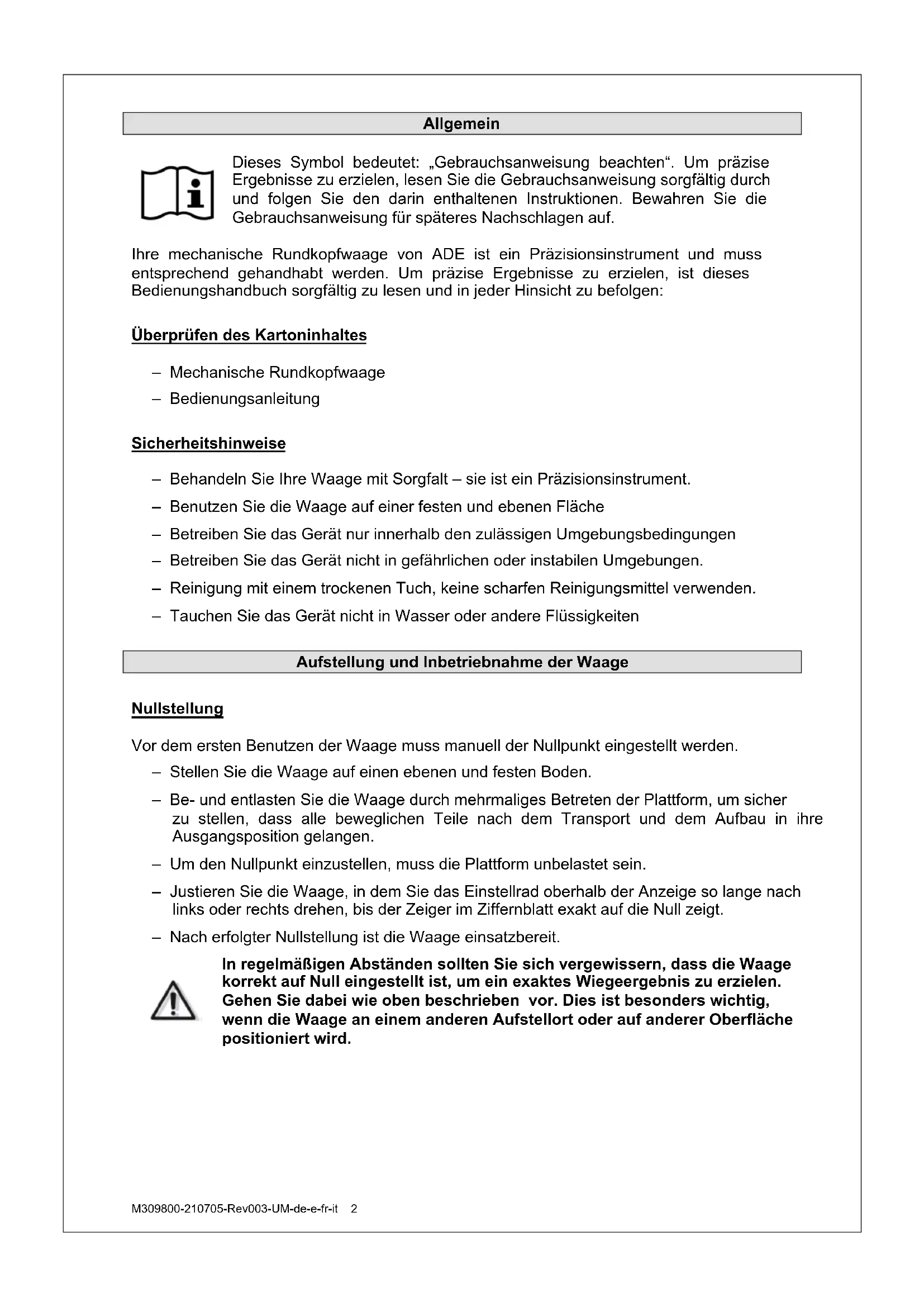 Dieses Symbol bedeutet: „Gebrauchsanweisung beachten“. Um präzise Ergebnisse zu erzielen, lesen Sie die Gebrauchsanweisung sorgfältig durch und folgen Sie den darin enthaltenen Instruktionen. Bewahren Sie die Gebrauchsanweisung für späteres Nachschlagen auf. Ihre mechanische Rundkopfwaage von ADE ist ein Präzisionsinstrument und muss entsprechend gehandhabt werden. Um präzise Ergebnisse zu erzielen, ist dieses Bedienungshandbuch sorgfältig zu lesen und in jeder Hinsicht zu befolgen: Überprüfen des Kartoninhaltes – Mechanische Rundkopfwaage – Bedienungsanleitung Sicherheitshinweise – Behandeln Sie Ihre Waage mit Sorgfalt – sie ist ein Präzisionsinstrument. – Benutzen Sie die Waage auf einer festen und ebenen Fläche – Betreiben Sie das Gerät nur innerhalb den zulässigen Umgebungsbedingungen – Betreiben Sie das Gerät nicht in gefährlichen oder instabilen Umgebungen. – Reinigung mit einem trockenen Tuch, keine scharfen Reinigungsmittel verwenden. – Tauchen Sie das Gerät nicht in Wasser oder andere Flüssigkeiten Aufstellung und Inbetriebnahme der Waage Nullstellung Vor dem ersten Benutzen der Waage muss manuell der Nullpunkt eingestellt werden. – Stellen Sie die Waage auf einen ebenen und festen Boden. – Be- und entlasten Sie die Waage durch mehrmaliges Betreten der Plattform, um sicher zu stellen, dass alle beweglichen Teile nach dem Transport und dem Aufbau in ihre Ausgangsposition gelangen. – Um den Nullpunkt einzustellen, muss die Plattform unbelastet sein. – Justieren Sie die Waage, in dem Sie das Einstellrad oberhalb der Anzeige so lange nach links oder rechts drehen, bis der Zeiger im Ziffernblatt exakt auf die Null zeigt. – Nach erfolgter Nullstellung ist die Waage einsatzbereit. In regelmäßigen Abständen sollten Sie sich vergewissern, dass die Waage korrekt auf Null eingestellt ist, um ein exaktes Wiegeergebnis zu erzielen. Gehen Sie dabei wie oben beschrieben vor. Dies ist besonders wichtig, wenn die Waage an einem anderen Aufstellort oder auf anderer Oberfläche positioniert wird.3 M309800-210705-Rev003-UM-de-e-fr-it Wiegen – Stellen Sie sich auf die Waage. – Achten Sie dabei darauf, dass die Füße möglichst mittig stehen und einen nahezu gleichen Abstand von den Rändern haben. – Bleiben Sie so ruhig wie möglich stehen. – Lesen Sie das Messergebnis ab, sobald der Zeiger in Ruheposition verharrt. Hinweis: Für eine statistische Gewichtsüberwachung sollten Sie sich jeden Tag zur gleichen Zeit wiegen. Pflege und Wartung Pflege – Mit einem feuchten Tuch oder mit herkömmlichen Desinfektionsmitteln reinigen. Chemische Reinigungsmittel oder Scheuermittel dürfen nicht angewendet werden. – Um eine lange Lebensdauer zu gewährleisten, die Waage trocken aufbewahren und vor direkter Hitze und Sonnenlicht schützen. – Waage unbedingt vor Nässe schützen. Garantie ADE wird dieses Produkt reparieren oder ersetzen, wenn bewiesen werden kann, dass es innerhalb von 2 Jahren vom Verkaufsdatum (Kaufbeleg ist erforderlich) durch mangelnde Arbeitsqualität oder defektes Material versagt hat. Alle beweglichen Teile, wie z.B. Batterien, Kabel, Netzgeräte, Akkus etc., sind hiervon ausgenommen. Diese Garantie umfasst keine äußeren normalen Abnutzungs- und Verschleißerscheinungen oder durch Unfall oder Missbrauch verursachte Beschädigungen. Für Geräte, die durch Unbefugte geöffnet wurden, greift die Garantie nicht. Die gesetzlichen geregelten Rechte des Kunden werden durch diese Garantievereinbarung in keiner Hinsicht angegriffen. Für Reklamationen, Kundendienst und Ersatzteile ist der Händler, bei dem Sie die Waage gekauft haben, zuständig.M309800-210705-Rev003-UM-de-e-fr-it 4 Technische Daten - Höchstlast: 150 kg - Ziffernschritt: 500 g - Abmessung: 320 x 70 x 435 mm - Eigengewicht: ca. 2,8 kg - Gehäusematerial: Metall - Gut lesbare Anzeige - Rutschfeste Vinyl Matte Konformitätserklärung