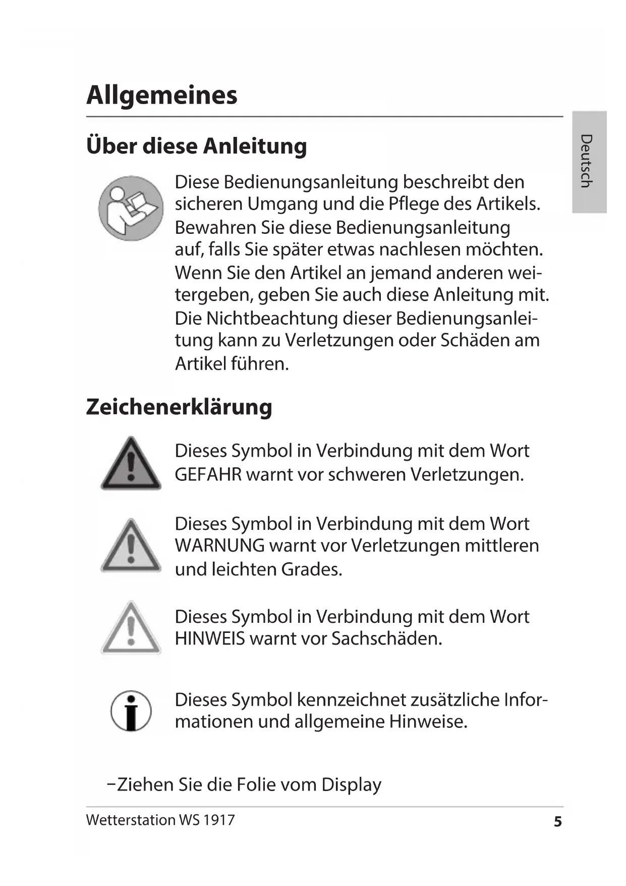 - Entsorgen Wetterstation WS 1917 Deutsch Allgemeines Über diese Anleitung Diese Bedienungsanleitung beschreibt den sicheren Umgang und die Pflege des Artikels. Bewahren Sie diese Bedienungsanleitung auf, falls Sie später etwas nachlesen möchten. Wenn Sie den Artikel an jemand anderen wei- tergeben, geben Sie auch diese Anleitung mit. Die Nichtbeachtung dieser Bedienungsanlei- tung kann zu Verletzungen oder Schäden am Artikel führen. Zeichenerklärung Dieses Symbol in Verbindung mit dem Wort GEFAHR warnt vor schweren Verletzungen. Dieses Symbol in Verbindung mit dem Wort WARNUNG warnt vor Verletzungen mittleren und leichten Grades. Dieses Symbol in Verbindung mit dem Wort HINWEIS warnt vor Sachschäden. Dieses Symbol kennzeichnet zusätzliche Infor- mationen und allgemeine Hinweise. − Ziehen Sie die Folie vom Display6 Wetterstation WS 1917 Sicherheit Dieses Gerät kann von Kindern ab 8 Jahren und darü- ber sowie von Personen mit verringerten physischen, sensorischen oder mentalen Fähigkeiten oder Mangel an Erfahrung und/oder Wissen benutzt werden, wenn sie beaufsichtigt werden oder bezüglich des sicheren Gebrauchs des Gerätes unterwiesen wurden und die daraus resultierenden Gefahren verstanden haben. Das Gerät und der Netzadapter sind von Kindern jün- ger als 8 Jahren fernzuhalten. Reinigung und Wartung durch den Benutzer dürfen nicht durch Kinder vorgenommen werden, es sei denn, sie sind 8 Jahre oder älter und werden beauf- sichtigt. Batterien können lebensgefährlich sein. Bewahren Sie deshalb die Batterie für Kleinkinder unerreichbar auf. Wurde die Batterie verschluckt oder ist auf andere Art in den Körper gelangt, muss sofort ärztliche Hilfe in Anspruch genommen werden. Anderenfalls kann es innerhalb von 2 Stunden zu schweren inneren Verät- zungen kommen, die zum Tode führen können. Kinder müssen beaufsichtigt werden, um sicherzustel- len, dass sie nicht mit dem Gerät spielen. Funkwetterstation und Netzadapter dürfen nicht in Wasser oder andere Flüssigkeiten getaucht werden. Stromschlaggefahr! Benutzen Sie die Basisstation der7 Wetterstation WS 1917 Deutsch Funkwetterstation daher auch nicht in der Nähe von Feuchtquellen wie z. B. einem Waschbecken. Verwenden Sie nur den mitgelieferten Netzadapter und ersetzen Sie ihn nur durch den gleichen Typ. Der Netzadapter darf nur in trockenen Innenräumen ver- wendet werden und muss vor Feuchtigkeit geschützt werden. Gefahr für Kinder Halten Sie Kinder von Verpackungsmaterial und den zum Lieferumfang gehörenden Kleinteilen fern. Bei Verschlucken besteht Erstickungsgefahr. Gefahr durch Elektrizität Schließen Sie das Gerät an eine ordnungsgemäß ins- tallierte Steckdose an, deren Spannung den „Techni- schen Daten“ entspricht. Achten Sie darauf, dass die Steckdose gut zugänglich ist, damit Sie im Bedarfsfall schnell den Netzadapter ziehen können. Benutzen Sie die Funkwetterstation nicht, wenn Netz- adapter oder Netzadapterkabel beschädigt sind. Decken Sie den Netzadapter nicht durch Vorhänge, Zeitungen etc. ab und sorgen Sie für ausreichende Belüftung. Der Netzadapter kann heiß werden. Wickeln Sie das Netzadapterkabel vor dem Anschluss vollständig ab. Achten Sie dabei darauf, dass das Kabel nicht durch scharfe Kanten oder heiße Gegenstände beschädigt wird.8 Wetterstation WS 1917 Ziehen Sie den Netzadapter aus der Steckdose: − bevor Sie die Funkwetterstation reinigen, − wenn während des Betriebs oensichtlich eine Störung auftritt, bei Gewitter. − Ziehen Sie dabei immer am Netzstecker, nicht am Kabel. Nehmen Sie keine Veränderungen am Artikel oder am Anschlusskabel vor. Lassen Sie Reparaturen nur von einer Fachwerkstatt durchführen, da nicht fachgerecht reparierte Geräte eine Gefährdung für den Benutzer darstellen. Ersetzen Sie nicht das Netzadapterkabel. Bei Beschä- digung des Kabels oder des Netzadapters muss dieser verschrottet und durch einen Netzadapter des glei- chen Typs ersetzt werden. Gefahr von Verletzungen Achtung: Explosionsgefahr bei unsachgemäßem Umgang mit Batterien. Batterien dürfen nicht gela- den, mit anderen Mitteln reaktiviert, auseinander genommen, ins Feuer geworfen oder kurzgeschlossen werden. Vermeiden Sie den Kontakt der Batterieüssigkeit mit Haut, Augen und Schleimhäuten. Bei Kontakt müssen Sie die betroenen Stellen sofort mit reichlich klarem Wasser spülen und umgehend einen Arzt aufsuchen.9 Wetterstation WS 1917 Deutsch Hinweis von Sachschäden Schützen Sie Basisstation und Außensensor vor Staub, Stößen, extremen Temperaturen und direkter Sonneneinstrahlung. Schützen Sie die Basisstation vor Feuchtigkeit. Stellen Sie die Basisstation ausschließlich in einem trockenen, geschlossenen Raum auf. Der Außensensor ist gegen Feuchtigkeit geschützt, muss aber vor direkter Nässeeinwirkung, z. B. Regen, geschützt werden. Nehmen Sie die Batterien aus Basisstation und Außen- sensor heraus, wenn diese verbraucht sind oder wenn Sie die Wetterstation länger nicht benutzen. So ver- meiden Sie Schäden, die durch Auslaufen entstehen können. Setzen Sie Batterien keinen extremen Bedingungen aus, indem Sie diese z. B. auf Heizkörpern oder unter direkter Sonneneinstrahlung lagern. Erhöhte Auslauf- gefahr! Reinigen Sie Batterie- und Gerätekontakte bei Bedarf vor dem Einlegen. Tauschen Sie immer alle Batterien in der Basisstation oder im Außensensor gleichzeitig aus. Setzen Sie nur Batterien des gleichen Typs ein, ver- wenden Sie keine unterschiedlichen Typen oder gebrauchte und neue Batterien miteinander.10 Wetterstation WS 1917 Nehmen Sie keine Veränderungen an dem Gerät vor. Lassen Sie Reparaturen nur von einer Fachwerkstatt durchführen und beachten Sie die Garantiebedingun- gen. Verwenden Sie keinesfalls harte, kratzende oder scheuernde Reinigungsmittel o. ä., um die Wetter- station zu reinigen. Hierbei könnten die Oberächen zerkratzen. Bestimmungsgemäßer Gebrauch Die Wetterstation - bestehend aus Basisstation und Funk-Außensensor - zeigt untersc