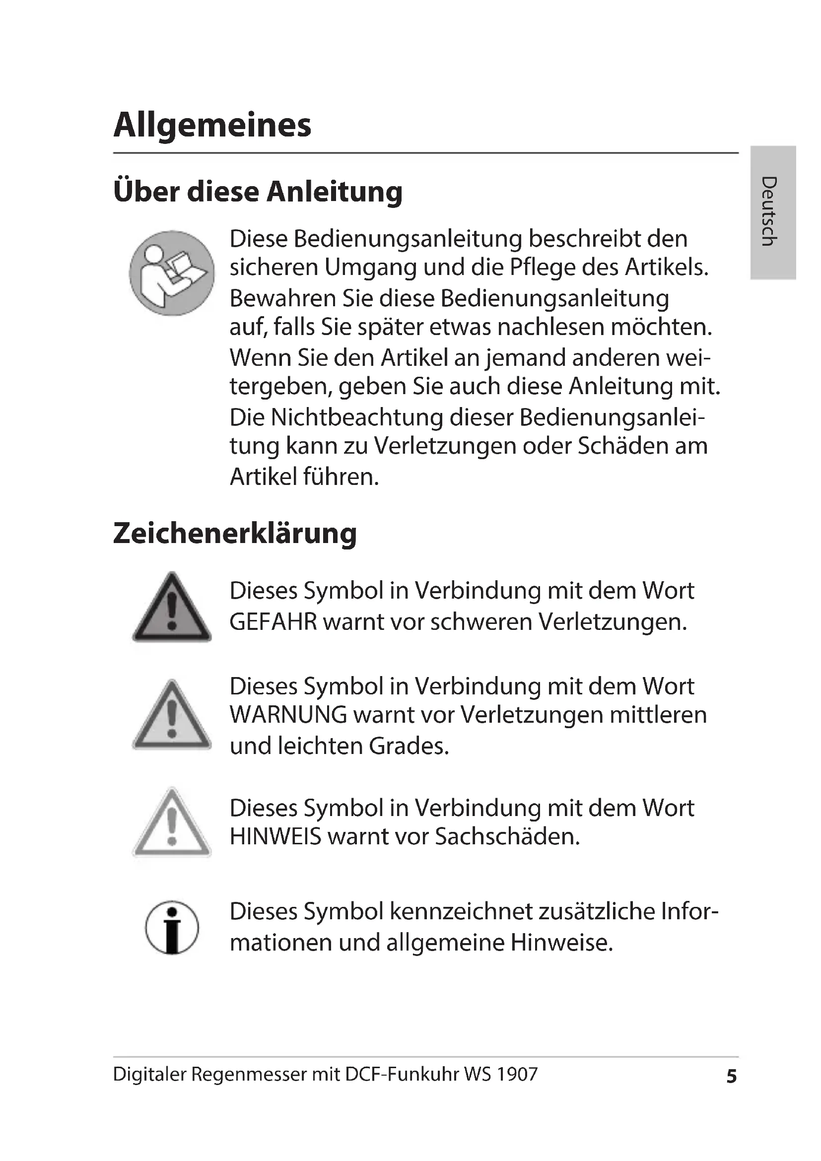 - Entsorgen Digitaler Regenmesser mit DCF-Funkuhr WS 1907 Deutsch Allgemeines Über diese Anleitung Diese Bedienungsanleitung beschreibt den sicheren Umgang und die Pflege des Artikels. Bewahren Sie diese Bedienungsanleitung auf, falls Sie später etwas nachlesen möchten. Wenn Sie den Artikel an jemand anderen wei- tergeben, geben Sie auch diese Anleitung mit. Die Nichtbeachtung dieser Bedienungsanlei- tung kann zu Verletzungen oder Schäden am Artikel führen. Zeichenerklärung Dieses Symbol in Verbindung mit dem Wort GEFAHR warnt vor schweren Verletzungen. Dieses Symbol in Verbindung mit dem Wort WARNUNG warnt vor Verletzungen mittleren und leichten Grades. Dieses Symbol in Verbindung mit dem Wort HINWEIS warnt vor Sachschäden. Dieses Symbol kennzeichnet zusätzliche Infor- mationen und allgemeine Hinweise.6 Digitaler Regenmesser mit DCF-Funkuhr WS 1907 Bestimmungsgemäßer Gebrauch Dieses Gerät - bestehend aus Basisstation und Funk-Regenmesser - zeigt Wetterdaten aus der nähe- ren Umgebung an. Aus den gemessenen Wetterdaten ermittelt die Basisstation einen Wettertrend. Außer- dem misst das Gerät die Niederschlagsmenge. Die Basisstation zeigt außerdem Datum und Uhrzeit an und verfügt zusätzlich über eine Weckfunktion. Für die gewerbliche Nutzung in der Wettervorhersage oder in der Wetterdaten-Messung ist die Basisstation ungeeignet. Sicherheit Dieses Gerät kann von Kindern ab 8 Jah- ren und darüber sowie von Personen mit verringerten physischen, sensorischen oder mentalen Fähigkeiten oder Mangel an Erfahrung und/oder Wissen benutzt werden, wenn sie beaufsichtigt werden oder bezüglich des sicheren Gebrauchs des Gerätes unterwiesen wurden und die daraus resultierenden Gefahren verstanden haben. Kinder dürfen nicht mit dem Artikel spielen. Reinigung und Benutzerwartung dürfen nicht von Kindern vorgenommen werden,7 Digitaler Regenmesser mit DCF-Funkuhr WS 1907 Deutsch es sei denn, sie sind 8 Jahre oder älter und werden beaufsichtigt. Batterien können bei Verschlucken lebens- gefährlich sein. Bewahren Sie Gerät und Batterien deshalb für Kleinkinder unerreich- bar auf. Wurde eine Batterie verschluckt, muss sofort medizinische Hilfe in Anspruch genommen werden. Gefahr für Kinder Halten Sie Kinder von Verpackungsmaterial und den zum Lieferumfang gehörenden Kleinteilen fern. Bei Verschlucken besteht Erstickungsgefahr. GEFAHR von Brand/Verbrennung und/ oder Explosion Explosionsgefahr bei unsachgemäßem Auswechseln der Batterien. Ersetzen Sie Batterien nur durch densel- ben oder einen gleichwertigen Batterietyp. Beachten Sie die „Technischen Daten“. Batterien dürfen nicht geladen, mit anderen Mitteln reaktiviert, auseinander genommen, ins Feuer gewor- fen oder kurzgeschlossen werden. Ansonsten besteht erhöhte Explosions- und Auslaufgefahr, außerdem können Gase entweichen! Vermeiden Sie Kontakt der Batterieflüssigkeit mit Haut, Augen und Schleimhäuten. Bei Kontakt spülen Sie die betroffenen Stellen sofort mit reichlich klarem Wasser aus und suchen Sie umgehend einen Arzt auf.8 Digitaler Regenmesser mit DCF-Funkuhr WS 1907 HINWEIS vor Sachschäden Schützen Sie die Basisstation vor Staub, Stößen, extre- men Temperaturen, Feuchtigkeit und direkter Sonnen- einstrahlung. Stellen Sie die Basisstation ausschließlich in einem trockenen, geschlossenen Raum auf. Nehmen Sie die Batterien aus Basisstation und Regen- messer heraus, wenn diese verbraucht sind oder wenn Sie die Basisstation länger nicht benutzen. So ver- meiden Sie Schäden, die durch Auslaufen entstehen können. Setzen Sie Batterien keinen extremen Bedingungen aus, indem Sie diese z. B. auf Heizkörpern oder unter direkter Sonneneinstrahlung lagern. Erhöhte Auslauf- gefahr! Reinigen Sie Batterie- und Gerätekontakte bei Bedarf vor dem Einlegen. Tauschen Sie immer alle Batterien gleichzeitig aus. Setzen Sie nur Batterien des gleichen Typs ein, ver- wenden Sie keine unterschiedlichen Typen oder gebrauchte und neue Batterien miteinander. Nehmen Sie keine Veränderungen an dem Gerät vor. Lassen Sie Reparaturen nur von einer Fachwerkstatt durchführen und beachten Sie die Garantiebedingun- gen. Verwenden Sie keinesfalls harte, kratzende oder scheuernde Reinigungsmittel o. ä., um die Basisstation zu reinigen. Hierbei könnten die Oberächen zerkrat- zen.9 Digitaler Regenmesser mit DCF-Funkuhr WS 1907 Deutsch Das bietet das Gerät Messung und Anzeige der aktuellen Niederschlags- menge Berechnung und Historie der Niederschlagsmenge für unterschiedliche Zeiträume und sowie Gesamtnieder- schlag-Anzeige Niederschlagsmenge in mm oder inch Temperaturanzeige in °C oder °F Innen- und Außentemperaturanzeige mit Trendanzei- gen und Memory-Funktion Funkuhr (DCF Zeitsignal) mit manueller Zeiteinstel- lung Wecker mit Dual-Alarm und Schlummerfunktion Ewiger Kalender mit Datum- und Tagesanzeige Großes, übersichtliches LCD-Display10 Digitaler Regenmesser mit DCF-Funkuhr WS 1907 Basistation Vorderseite mit Display p. 415