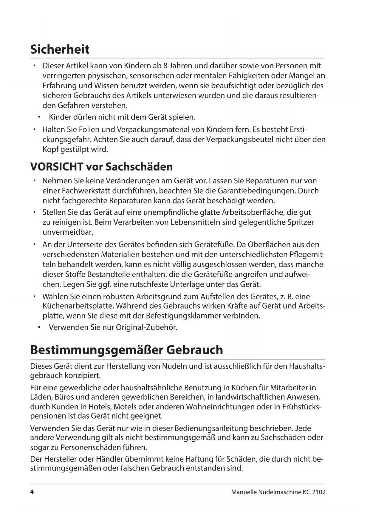 Manuelle Nudelmaschine KG 2102 Sicherheit Dieser Artikel kann von Kindern ab 8 Jahren und darüber sowie von Personen mit verringerten physischen, sensorischen oder mentalen Fähigkeiten oder Mangel an Erfahrung und Wissen benutzt werden, wenn sie beaufsichtigt oder bezüglich des sicheren Gebrauchs des Artikels unterwiesen wurden und die daraus resultieren- den Gefahren verstehen. Kinder dürfen nicht mit dem Gerät spielen. Halten Sie Folien und Verpackungsmaterial von Kindern fern. Es besteht Ersti- ckungsgefahr. Achten Sie auch darauf, dass der Verpackungsbeutel nicht über den Kopf gestülpt wird. VORSICHT vor Sachschäden Nehmen Sie keine Veränderungen am Gerät vor. Lassen Sie Reparaturen nur von einer Fachwerkstatt durchführen, beachten Sie die Garantiebedingungen. Durch nicht fachgerechte Reparaturen kann das Gerät beschädigt werden. Stellen Sie das Gerät auf eine unempndliche glatte Arbeitsoberäche, die gut zu reinigen ist. Beim Verarbeiten von Lebensmitteln sind gelegentliche Spritzer unvermeidbar. An der Unterseite des Gerätes benden sich Gerätefüße. Da Oberächen aus den verschiedensten Materialien bestehen und mit den unterschiedlichsten Pegemit- teln behandelt werden, kann es nicht völlig ausgeschlossen werden, dass manche dieser Stoe Bestandteile enthalten, die die Gerätefüße angreifen und aufwei- chen. Legen Sie ggf. eine rutschfeste Unterlage unter das Gerät. Wählen Sie einen robusten Arbeitsgrund zum Aufstellen des Gerätes, z. B. eine Küchenarbeitsplatte. Während des Gebrauchs wirken Kräfte auf Gerät und Arbeits- platte, wenn Sie diese mit der Befestigungsklammer verbinden. Verwenden Sie nur Original-Zubehör. Bestimmungsgemäßer Gebrauch Dieses Gerät dient zur Herstellung von Nudeln und ist ausschließlich für den Haushalts- gebrauch konzipiert. Für eine gewerbliche oder haushaltsähnliche Benutzung in Küchen für Mitarbeiter in Läden, Büros und anderen gewerblichen Bereichen, in landwirtschaftlichen Anwesen, durch Kunden in Hotels, Motels oder anderen Wohneinrichtungen oder in Frühstücks- pensionen ist das Gerät nicht geeignet. Verwenden Sie das Gerät nur wie in dieser Bedienungsanleitung beschrieben. Jede andere Verwendung gilt als nicht bestimmungsgemäß und kann zu Sachschäden oder sogar zu Personenschäden führen. Der Hersteller oder Händler übernimmt keine Haftung für Schäden, die durch nicht be- stimmungsgemäßen oder falschen Gebrauch entstanden sind.Auf einen Blick