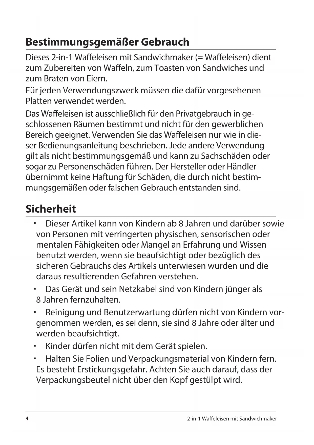 2-in-1 Waffeleisen mit Sandwichmaker Bestimmungsgemäßer Gebrauch Dieses 2-in-1 Waffeleisen mit Sandwichmaker (= Waffeleisen) dient zum Zubereiten von Waeln, zum Toasten von Sandwiches und zum Braten von Eiern. Für jeden Verwendungszweck müssen die dafür vorgesehenen Platten verwendet werden. Das Waffeleisen ist ausschließlich für den Privatgebrauch in ge- schlossenen Räumen bestimmt und nicht für den gewerblichen Bereich geeignet. Verwenden Sie das Waffeleisen nur wie in die- ser Bedienungsanleitung beschrieben. Jede andere Verwendung gilt als nicht bestimmungsgemäß und kann zu Sachschäden oder sogar zu Personenschäden führen. Der Hersteller oder Händler übernimmt keine Haftung für Schäden, die durch nicht bestim- mungsgemäßen oder falschen Gebrauch entstanden sind. Sicherheit Dieser Artikel kann von Kindern ab 8 Jahren und darüber sowie von Personen mit verringerten physischen, sensorischen oder mentalen Fähigkeiten oder Mangel an Erfahrung und Wissen benutzt werden, wenn sie beaufsichtigt oder bezüglich des sicheren Gebrauchs des Artikels unterwiesen wurden und die daraus resultierenden Gefahren verstehen. Das Gerät und sein Netzkabel sind von Kindern jünger als 8Jahren fernzuhalten. Reinigung und Benutzerwartung dürfen nicht von Kindern vor- genommen werden, es sei denn, sie sind 8 Jahre oder älter und werden beaufsichtigt. Kinder dürfen nicht mit dem Gerät spielen. Halten Sie Folien und Verpackungsmaterial von Kindern fern. Es besteht Erstickungsgefahr. Achten Sie auch darauf, dass der Verpackungsbeutel nicht über den Kopf gestülpt wird.Sicherheit