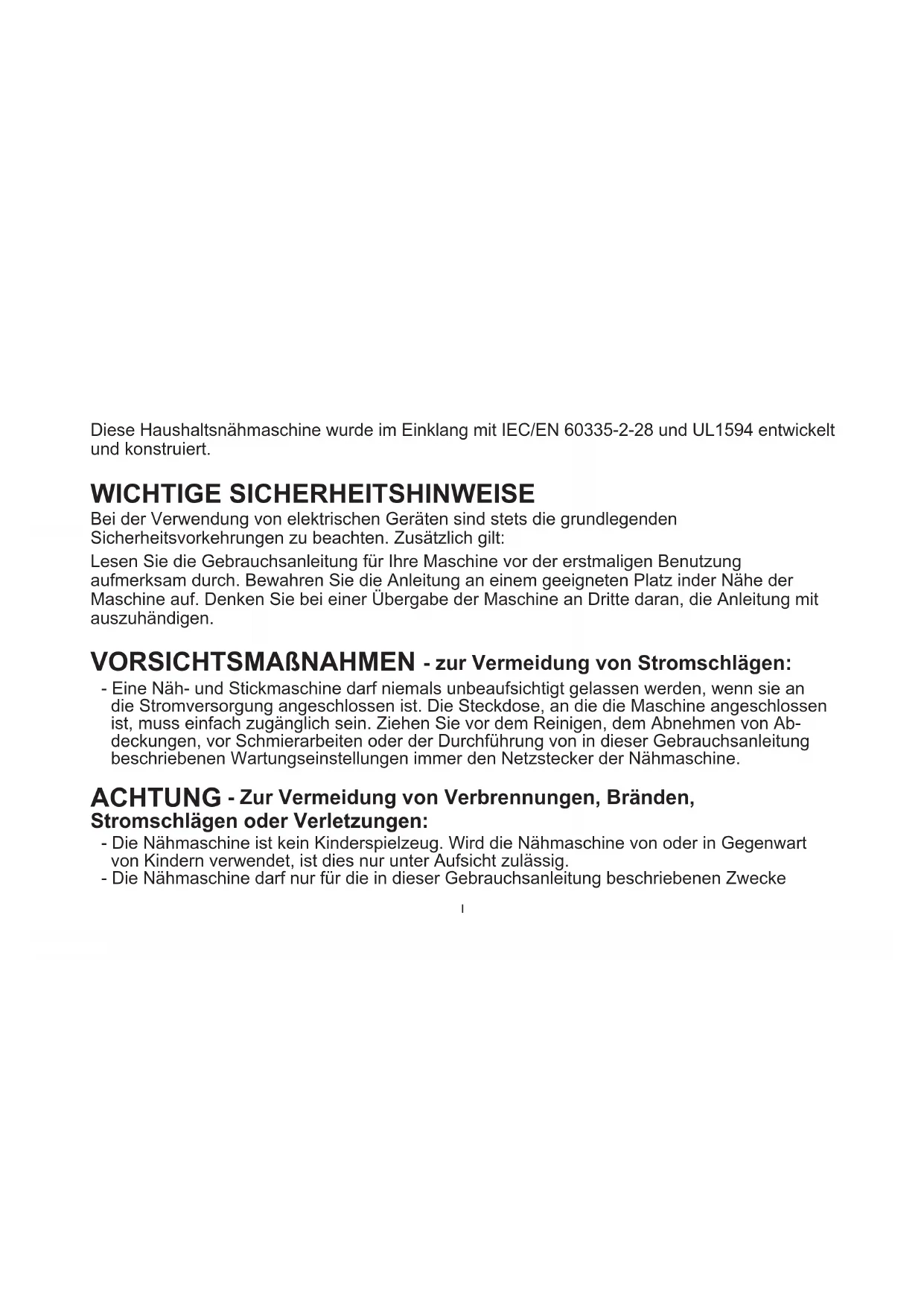 FÜR LÄNDER DES EUROPÄISCHEN KOMITEES FÜR ELEKTROTECHNISCHE NORMUNG (CENELEC) GILT: Dieses Gert kann von Kindern ab einem Alter von 8 Jahren und Personen mit eingeschrnkten physischen, sensorischen oder mentalen Fähigkeiten oder mangelnder Erfahrung und Kenntnisse verwendet werden, wenn diese unter Aufsicht stehen oder Anweisungen zum sicheren Gebrauch des Geräts erhalten haben und die damit verbundenen Gefahren verstehen. Das Gerät ist kein Kinderspielzeug. Reinigungs- und Instandhaltungsarbeiten dürfen von Kindern nur unter Aufsicht durchgeführt werden. Der Geräuschpegel bei normalen Betriebsbedingungen liegt unter 75 dB(A). Die Maschine darf ausschließlich mit einem Fußanlasser vom Typ FC-2902D (220-240V) des Herstellers Zhejiang Founder Motor Corporation, LTD (Vietnam) / 4C-326G (230V) / 4C-336G III(240V) des Herstellers Wakaho Electric Ind. Co., Ltd. (Vietnam) betrieben werden. FÜR ALLE LÄNDER AUSSERHALB DES EUROPÄISCHEN KOMITEES FÜR ELEKTROTECHNISCHE NORMUNG (CENELEC GILT: Diese Nähmaschine ist nicht für die Verwendung von Personen mit reduzierten physischen, sensorischen bzw. mentalen Fähigkeiten oder fehlender Erfahrung und Kenntnis vorgesehen (einschließlich Kinder), es sei denn, sie werden beim Gebrauch der Nähmaschine von einer für ihre Sicherheit verantwortlichen Person beaufsichtigt oder angeleitet. Kinder sind zu beaufsichtigen um sicherzustellen, dass sie nicht mit der Nähmaschine spielen. Der Geräuschpegel bei normalen Betriebsbedingungen liegt unter 75 dB(A). Die Maschine darf ausschließlich mit einem Fußanlasser vom Typ KD-1902, FC-1902 (110- 120V)/ KD-2902, FC-2902A, FC-2902C, FC-2902D (220-240V) des Herstellers Zhejiang Founder Motor Corporation, LTD (Vietnam) / 4C-316B (110-125V) / 4C-316C (127V) /4C-326C (220V) / 4C-326G (230V) / 4C-336G (240V) des Herstellers Wakaho Electric Ind. Co., Ltd. (Vietnam) betrieben werden.