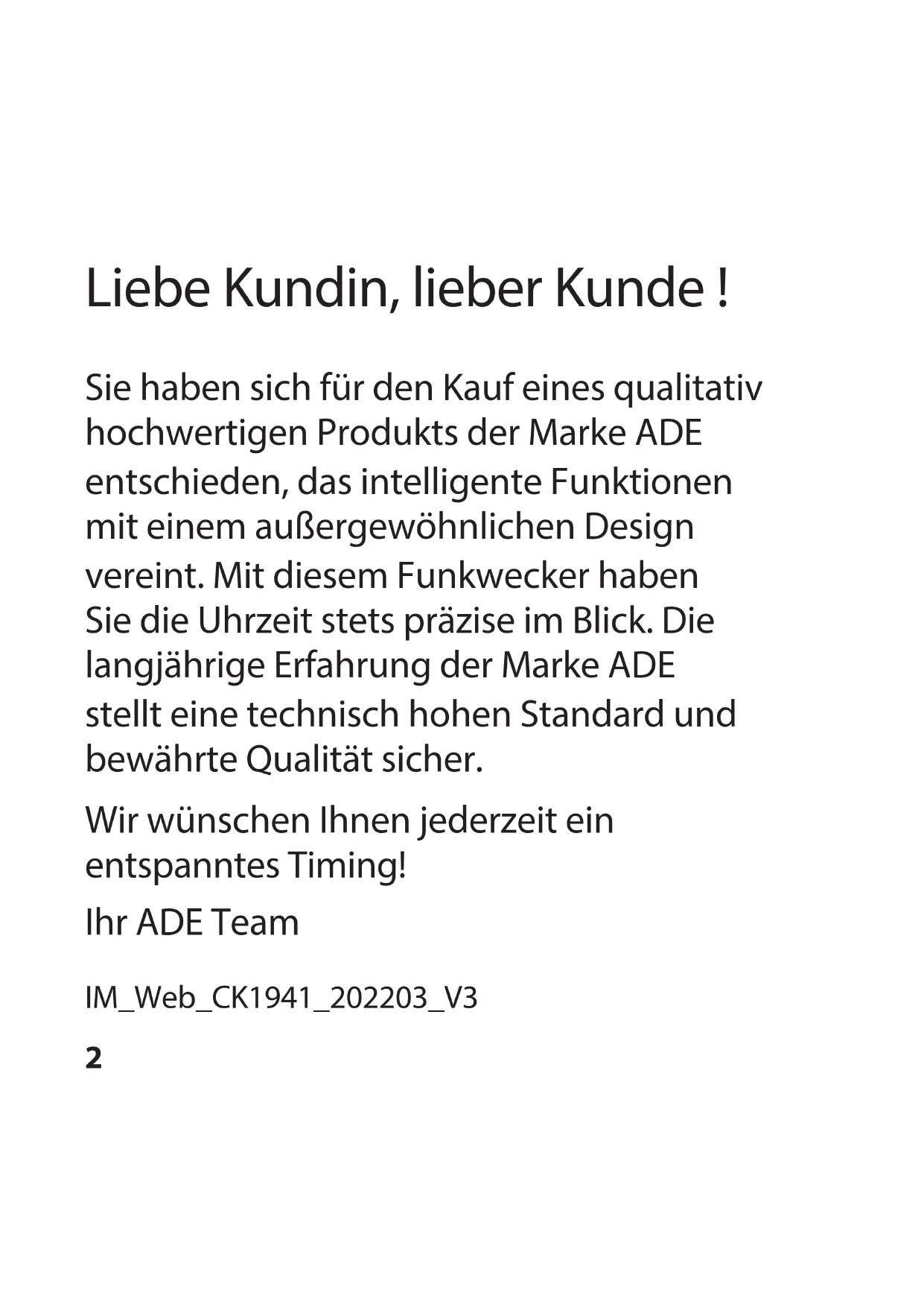 Hiermit erklärt die GRENDS GmbH, dass der Funkwecker CK 1941 den Richtlinien 2014/53/EU und 2011/65/EU entspricht. Der vollständige Text der EU-Konformitätserklärgungist unter der folgenden Internetadresse verfügbar: www.ade-germany.de/doc