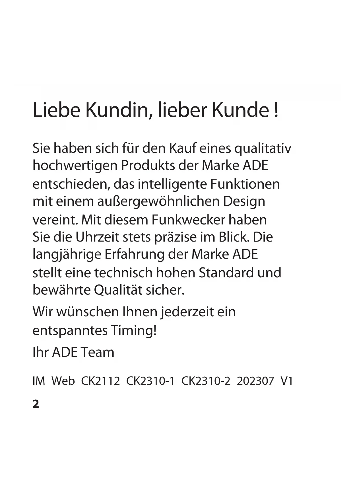 Bedienungsanleitung CK 2112 | CK 2310-1 | CK 2310-2 Operating Manual | Manual de instrucciones | Mode d’emploi | Istruzioni per l’uso | Instrukcja obsługi CK 2310-1 CK 2310-2 CK 21122 Liebe Kundin, lieber Kunde ! Sie haben sich für den Kauf eines qualitativ hochwertigen Produkts der Marke ADE entschieden, das intelligente Funktionen mit einem außergewöhnlichen Design vereint. Mit diesem Funkwecker haben Sie die Uhrzeit stets präzise im Blick. Die langjährige Erfahrung der Marke ADE stellt eine technisch hohen Standard und bewährte Qualität sicher. Wir wünschen Ihnen jederzeit ein entspanntes Timing! Ihr ADE Team IM_Web_CK2112_CK2310-1_CK2310-2_202307_V13