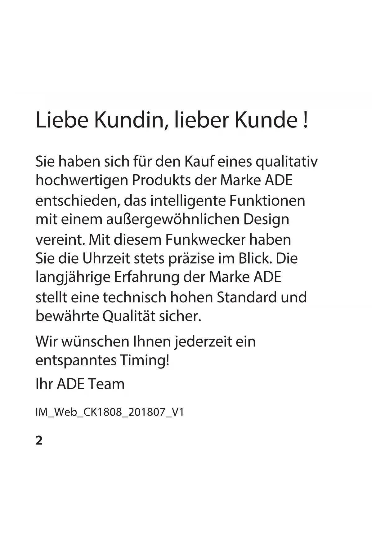 PL2 Liebe Kundin, lieber Kunde ! Sie haben sich für den Kauf eines qualitativ hochwertigen Produkts der Marke ADE entschieden, das intelligente Funktionen mit einem außergewöhnlichen Design vereint. Mit diesem Funkwecker haben Sie die Uhrzeit stets präzise im Blick. Die langjährige Erfahrung der Marke ADE stellt eine technisch hohen Standard und bewährte Qualität sicher. Wir wünschen Ihnen jederzeit ein entspanntes Timing! Ihr ADE Team IM_Web_CK1808_201807_V13