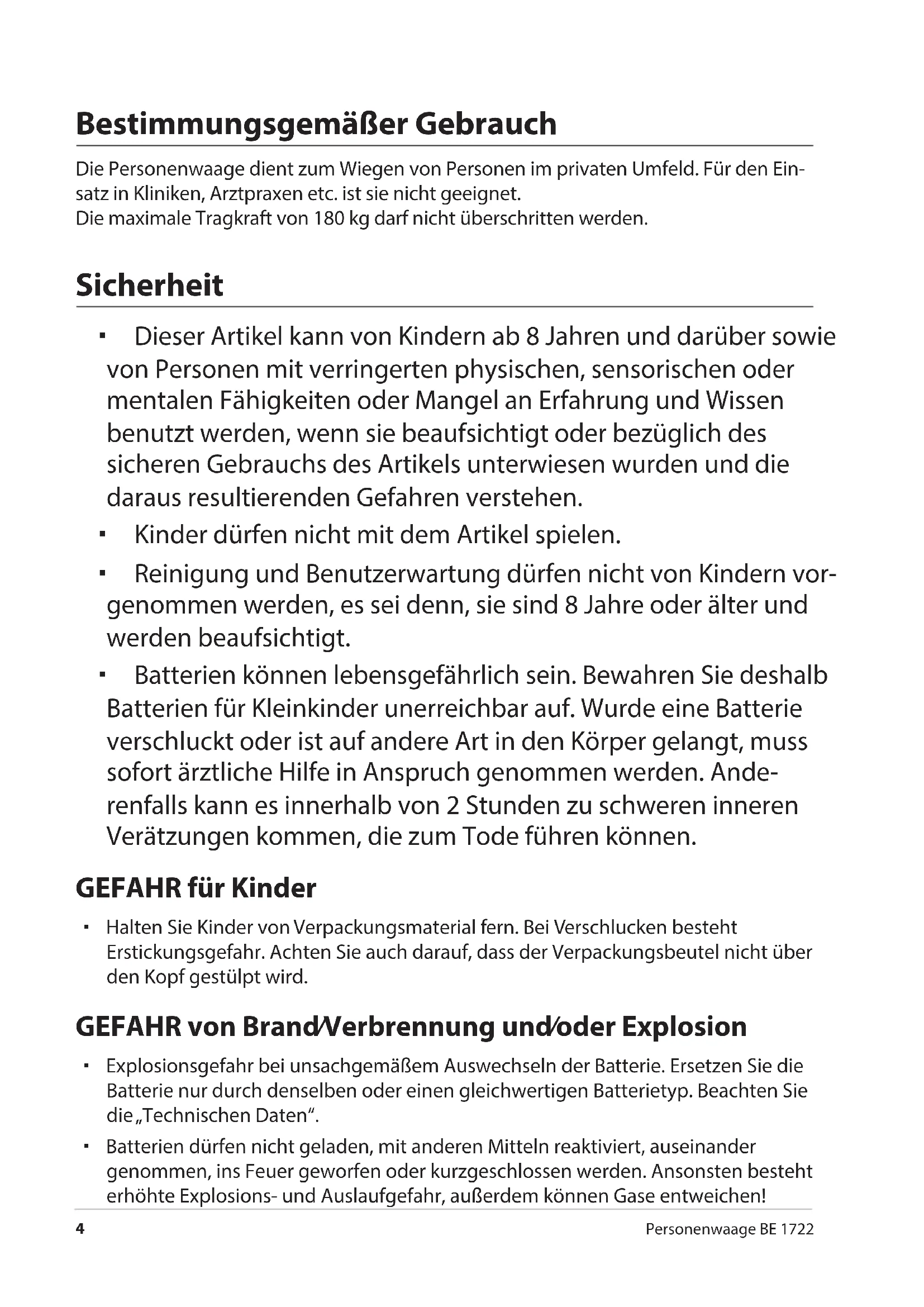 Personenwaage BE 1722 Bestimmungsgemäßer Gebrauch Die Personenwaage dient zum Wiegen von Personen im privaten Umfeld. Für den Ein- satz in Kliniken, Arztpraxen etc. ist sie nicht geeignet. Die maximale Tragkraft von 180 kg darf nicht überschritten werden. Sicherheit Dieser Artikel kann von Kindern ab 8 Jahren und darüber sowie von Personen mit verringerten physischen, sensorischen oder mentalen Fähigkeiten oder Mangel an Erfahrung und Wissen benutzt werden, wenn sie beaufsichtigt oder bezüglich des sicheren Gebrauchs des Artikels unterwiesen wurden und die daraus resultierenden Gefahren verstehen. Kinder dürfen nicht mit dem Artikel spielen. Reinigung und Benutzerwartung dürfen nicht von Kindern vor- genommen werden, es sei denn, sie sind 8 Jahre oder älter und werden beaufsichtigt. Batterien können lebensgefährlich sein. Bewahren Sie deshalb Batterien für Kleinkinder unerreichbar auf. Wurde eine Batterie verschluckt oder ist auf andere Art in den Körper gelangt, muss sofort ärztliche Hilfe in Anspruch genommen werden. Ande- renfalls kann es innerhalb von 2Stunden zu schweren inneren Verätzungen kommen, die zum Tode führen können. GEFAHR für Kinder Halten Sie Kinder von Verpackungsmaterial fern. Bei Verschlucken besteht Erstickungsgefahr. Achten Sie auch darauf, dass der Verpackungsbeutel nicht über den Kopf gestülpt wird. GEFAHR von Brand/Verbrennung und/oder Explosion Explosionsgefahr bei unsachgemäßem Auswechseln der Batterie. Ersetzen Sie die Batterie nur durch denselben oder einen gleichwertigen Batterietyp. Beachten Sie die „Technischen Daten“. Batterien dürfen nicht geladen, mit anderen Mitteln reaktiviert, auseinander genommen, ins Feuer geworfen oder kurzgeschlossen werden. Ansonsten besteht erhöhte Explosions- und Auslaufgefahr, außerdem können Gase entweichen!Sicherheit