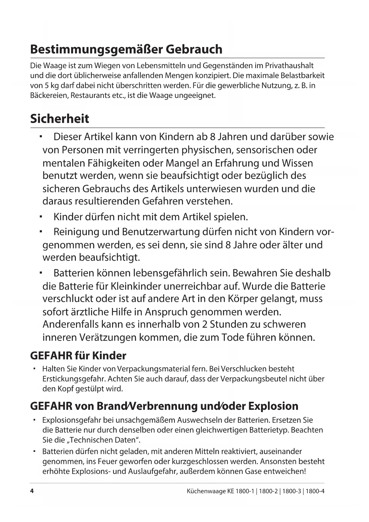 Küchenwaage KE 1800-1 | 1800-2 | 1800-3 | 1800-4 Bestimmungsgemäßer Gebrauch Die Waage ist zum Wiegen von Lebensmitteln und Gegenständen im Privathaushalt und die dort üblicherweise anfallenden Mengen konzipiert. Die maximale Belastbarkeit von 5 kg darf dabei nicht überschritten werden. Für die gewerbliche Nutzung, z. B. in Bäckereien, Restaurants etc., ist die Waage ungeeignet. Sicherheit Dieser Artikel kann von Kindern ab 8 Jahren und darüber sowie von Personen mit verringerten physischen, sensorischen oder mentalen Fähigkeiten oder Mangel an Erfahrung und Wissen benutzt werden, wenn sie beaufsichtigt oder bezüglich des sicheren Gebrauchs des Artikels unterwiesen wurden und die daraus resultierenden Gefahren verstehen. Kinder dürfen nicht mit dem Artikel spielen. Reinigung und Benutzerwartung dürfen nicht von Kindern vor- genommen werden, es sei denn, sie sind 8 Jahre oder älter und werden beaufsichtigt. Batterien können lebensgefährlich sein. Bewahren Sie deshalb die Batterie für Kleinkinder unerreichbar auf. Wurde die Batterie verschluckt oder ist auf andere Art in den Körper gelangt, muss sofort ärztliche Hilfe in Anspruch genommen werden. Anderenfalls kann es innerhalb von 2 Stunden zu schweren inneren Verätzungen kommen, die zum Tode führen können. GEFAHR für Kinder Halten Sie Kinder von Verpackungsmaterial fern. Bei Verschlucken besteht Erstickungsgefahr. Achten Sie auch darauf, dass der Verpackungsbeutel nicht über den Kopf gestülpt wird. GEFAHR von Brand/Verbrennung und/oder Explosion Explosionsgefahr bei unsachgemäßem Auswechseln der Batterien. Ersetzen Sie die Batterie nur durch denselben oder einen gleichwertigen Batterietyp. Beachten Sie die „Technischen Daten“. Batterien dürfen nicht geladen, mit anderen Mitteln reaktiviert, auseinander genommen, ins Feuer geworfen oder kurzgeschlossen werden. Ansonsten besteht erhöhte Explosions- und Auslaufgefahr, außerdem können Gase entweichen!Sicherheit