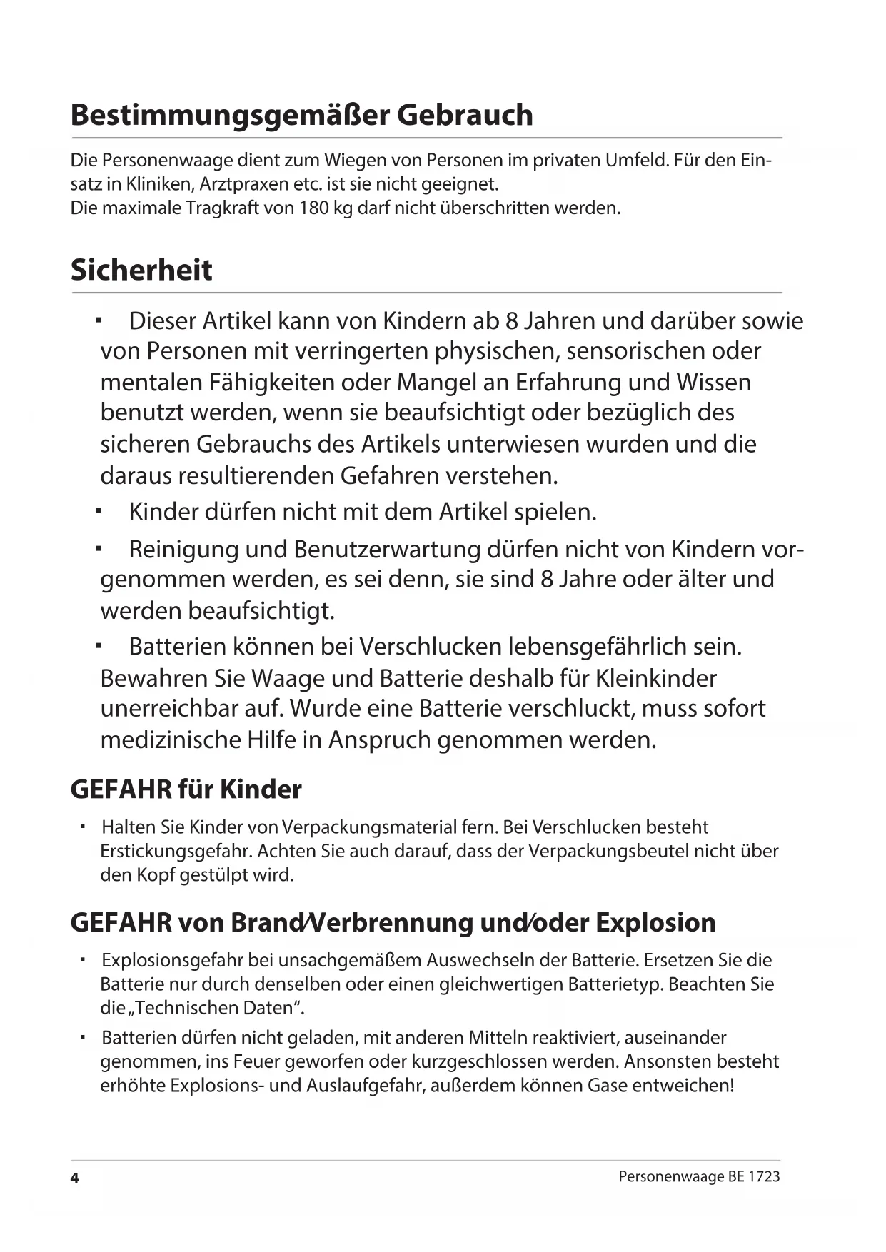 Personenwaage BE 1723 Bestimmungsgemäßer Gebrauch Die Personenwaage dient zum Wiegen von Personen im privaten Umfeld. Für den Ein- satz in Kliniken, Arztpraxen etc. ist sie nicht geeignet. Die maximale Tragkraft von 180 kg darf nicht überschritten werden. Sicherheit Dieser Artikel kann von Kindern ab 8 Jahren und darüber sowie von Personen mit verringerten physischen, sensorischen oder mentalen Fähigkeiten oder Mangel an Erfahrung und Wissen benutzt werden, wenn sie beaufsichtigt oder bezüglich des sicheren Gebrauchs des Artikels unterwiesen wurden und die daraus resultierenden Gefahren verstehen. Kinder dürfen nicht mit dem Artikel spielen. Reinigung und Benutzerwartung dürfen nicht von Kindern vor- genommen werden, es sei denn, sie sind 8 Jahre oder älter und werden beaufsichtigt. Batterien können bei Verschlucken lebensgefährlich sein. Bewahren Sie Waage und Batterie deshalb für Kleinkinder unerreichbar auf. Wurde eine Batterie verschluckt, muss sofort medizinische Hilfe in Anspruch genommen werden. GEFAHR für Kinder Halten Sie Kinder von Verpackungsmaterial fern. Bei Verschlucken besteht Erstickungsgefahr. Achten Sie auch darauf, dass der Verpackungsbeutel nicht über den Kopf gestülpt wird. GEFAHR von Brand/Verbrennung und/oder Explosion Explosionsgefahr bei unsachgemäßem Auswechseln der Batterie. Ersetzen Sie die Batterie nur durch denselben oder einen gleichwertigen Batterietyp. Beachten Sie die „Technischen Daten“. Batterien dürfen nicht geladen, mit anderen Mitteln reaktiviert, auseinander genommen, ins Feuer geworfen oder kurzgeschlossen werden. Ansonsten besteht erhöhte Explosions- und Auslaufgefahr, außerdem können Gase entweichen! Koerperwaage BE 1723.indb 4 15.01.2018 10:17:09Sicherheit