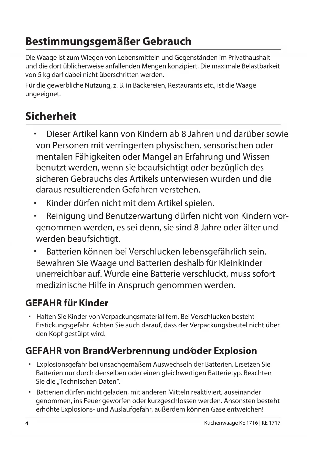 Küchenwaage KE 1716 | KE 1717 Bestimmungsgemäßer Gebrauch Die Waage ist zum Wiegen von Lebensmitteln und Gegenständen im Privathaushalt und die dort üblicherweise anfallenden Mengen konzipiert. Die maximale Belastbarkeit von 5 kg darf dabei nicht überschritten werden. Für die gewerbliche Nutzung, z. B. in Bäckereien, Restaurants etc., ist die Waage ungeeignet. Sicherheit Dieser Artikel kann von Kindern ab 8 Jahren und darüber sowie von Personen mit verringerten physischen, sensorischen oder mentalen Fähigkeiten oder Mangel an Erfahrung und Wissen benutzt werden, wenn sie beaufsichtigt oder bezüglich des sicheren Gebrauchs des Artikels unterwiesen wurden und die daraus resultierenden Gefahren verstehen. Kinder dürfen nicht mit dem Artikel spielen. Reinigung und Benutzerwartung dürfen nicht von Kindern vor- genommen werden, es sei denn, sie sind 8 Jahre oder älter und werden beaufsichtigt. Batterien können bei Verschlucken lebensgefährlich sein. Bewahren Sie Waage und Batterien deshalb für Kleinkinder unerreichbar auf. Wurde eine Batterie verschluckt, muss sofort medizinische Hilfe in Anspruch genommen werden. GEFAHR für Kinder Halten Sie Kinder von Verpackungsmaterial fern. Bei Verschlucken besteht Erstickungsgefahr. Achten Sie auch darauf, dass der Verpackungsbeutel nicht über den Kopf gestülpt wird. GEFAHR von Brand/Verbrennung und/oder Explosion Explosionsgefahr bei unsachgemäßem Auswechseln der Batterien. Ersetzen Sie Batterien nur durch denselben oder einen gleichwertigen Batterietyp. Beachten Sie die „Technischen Daten“. Batterien dürfen nicht geladen, mit anderen Mitteln reaktiviert, auseinander genommen, ins Feuer geworfen oder kurzgeschlossen werden. Ansonsten besteht erhöhte Explosions- und Auslaufgefahr, außerdem können Gase entweichen! Druckbuch SHIRIN THELMA.indb 4 18.05.2017 10:57:02Sicherheit