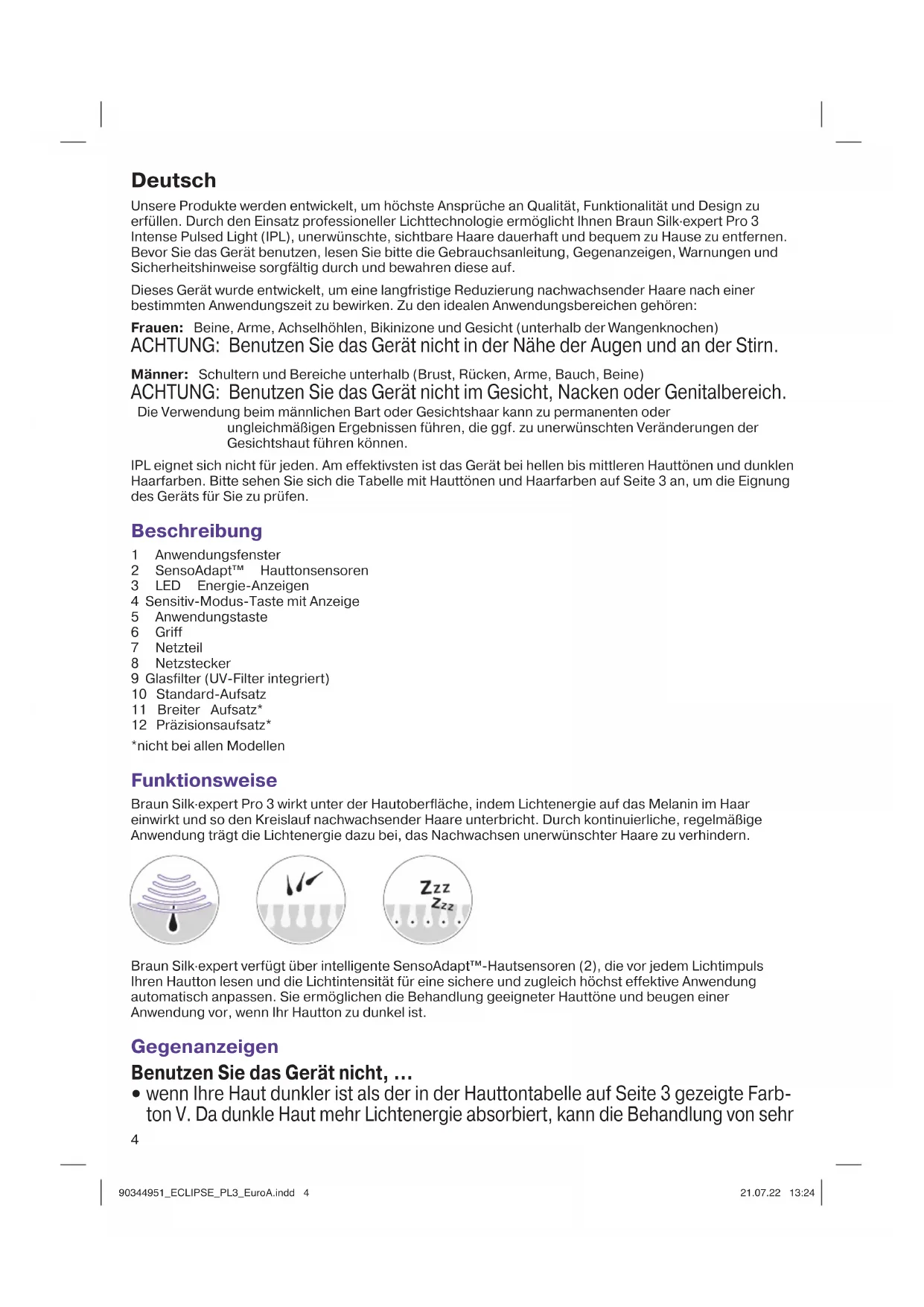 geeignet / suitable / approprié / apto / adequado / adatto / geschikt / egnet / passende / lämplig / sopii nicht geeignet / not suitable / non approprié / uso no apto / não adequado / non adatto / niet geschikt / ikke egnet / ikke passende / inte lämplig / ei sovi käyttöön 90344951_ECLIPSE_PL3_EuroA.indd 390344951_ECLIPSE_PL3_EuroA.indd 3 21.07.22 13:2421.07.22 13:244 Deutsch Unsere Produkte werden entwickelt, um höchste Ansprüche an Qualität, Funktionalität und Design zu erfüllen. Durch den Einsatz professioneller Lichttechnologie ermöglicht Ihnen Braun Silk·expert Pro 3 Intense Pulsed Light (IPL), unerwünschte, sichtbare Haare dauerhaft und bequem zu Hause zu entfernen. Bevor Sie das Gerät benutzen, lesen Sie bitte die Gebrauchsanleitung, Gegenanzeigen, Warnungen und Sicherheitshinweise sorgfältig durch und bewahren diese auf. Dieses Gerät wurde entwickelt, um eine langfristige Reduzierung nachwachsender Haare nach einer bestimmten Anwendungszeit zu bewirken. Zu den idealen Anwendungsbereichen gehören: Frauen: Beine, Arme, Achselhöhlen, Bikinizone und Gesicht (unterhalb der Wangenknochen) ACHTUNG: Benutzen Sie das Gerät nicht in der Nähe der Augen und an der Stirn. Männer: Schultern und Bereiche unterhalb (Brust, Rücken, Arme, Bauch, Beine) ACHTUNG: Benutzen Sie das Gerät nicht im Gesicht, Nacken oder Genitalbereich. Die Verwendung beim männlichen Bart oder Gesichtshaar kann zu permanenten oder ungleichmäßigen Ergebnissen führen, die ggf. zu unerwünschten Veränderungen der Gesichtshaut führen können. IPL eignet sich nicht für jeden. Am effektivsten ist das Gerät bei hellen bis mittleren Hauttönen und dunklen Haarfarben. Bitte sehen Sie sich die Tabelle mit Hauttönen und Haarfarben auf Seite 3 an, um die Eignung des Geräts für Sie zu prüfen. Beschreibung 1 Anwendungsfenster 2 SensoAdapt™ Hauttonsensoren 3 LED Energie-Anzeigen 4 Sensitiv-Modus-Taste mit Anzeige 5 Anwendungstaste 6 Griff 7 Netzteil 8 Netzstecker 9 Glasfilter (UV-Filter integriert) 10 Standard-Aufsatz 11 Breiter Aufsatz* 12 Präzisionsaufsatz* *nicht bei allen Modellen Funktionsweise Braun Silk·expert Pro 3 wirkt unter der Hautoberfläche, indem Lichtenergie auf das Melanin im Haar einwirkt und so den Kreislauf nachwachsender Haare unterbricht. Durch kontinuierliche, regelmäßige Anwendung trägt die Lichtenergie dazu bei, das Nachwachsen unerwünschter Haare zu verhindern. Braun Silk·expert verfügt über intelligente SensoAdapt™-Hautsensoren (2), die vor jedem Lichtimpuls Ihren Hautton lesen und die Lichtintensität für eine sichere und zugleich höchst effektive Anwendung automatisch anpassen. Sie ermöglichen die Behandlung geeigneter Hauttöne und beugen einer Anwendung vor, wenn Ihr Hautton zu dunkel ist. Gegenanzeigen Benutzen Sie das Gerät nicht, …