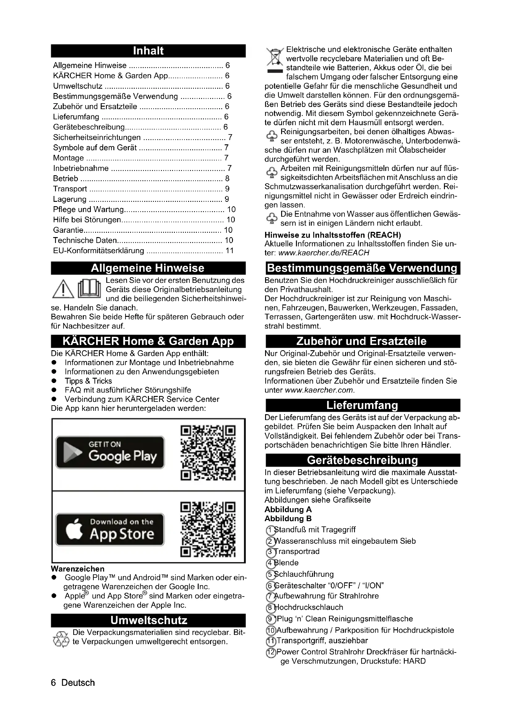 3C D E F G H I J 4K L M N O P Q R 56 Deutsch Inhalt Allgemeine Hinweise Lesen Sie vor der ersten Benutzung des Geräts diese Originalbetriebsanleitung und die beiliegenden Sicherheitshinwei- se. Handeln Sie danach. Bewahren Sie beide Hefte für späteren Gebrauch oder für Nachbesitzer auf. KÄRCHER Home & Garden App Die KÄRCHER Home & Garden App enthält: Informationen zur Montage und Inbetriebnahme Informationen zu den Anwendungsgebieten Tipps & Tricks FAQ mit ausführlicher Störungshilfe Verbindung zum KÄRCHER Service Center Die App kann hier heruntergeladen werden: Warenzeichen Google Play™ und Android™ sind Marken oder ein- getragene Warenzeichen der Google Inc. Apple