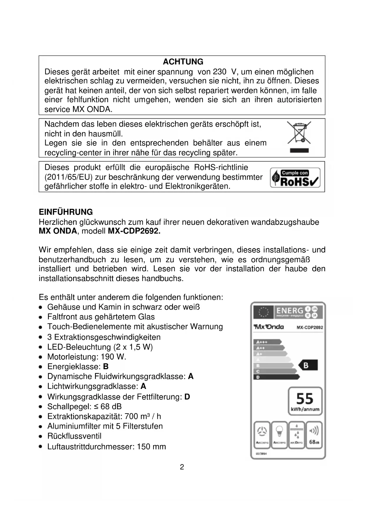 EINFÜHRUNG Herzlichen glückwunsch zum kauf ihrer neuen dekorativen wandabzugshaube MX ONDA, modell MX-CDP2692. Wir empfehlen, dass sie einige zeit damit verbringen, dieses installations- und benutzerhandbuch zu lesen, um zu verstehen, wie es ordnungsgemäß installiert und betrieben wird. Lesen sie vor der installation der haube den installationsabschnitt dieses handbuchs. Es enthält unter anderem die folgenden funktionen: Gehäuse und Kamin in schwarz oder weiß Faltfront aus gehärtetem Glas Touch-Bedienelemente mit akustischer Warnung 3 Extraktionsgeschwindigkeiten LED-Beleuchtung (2 x 1,5 W) Motorleistung: 190 W. Energieklasse: B Dynamische Fluidwirkungsgradklasse: A Lichtwirkungsgradklasse: A Wirkungsgradklasse der Fettfilterung: D Schallpegel: ≤ 68 dB Extraktionskapazität: 700 m³ / h Aluminiumfilter mit 5 Filterstufen Rückflussventil Luftaustrittdurchmesser: 150 mm3