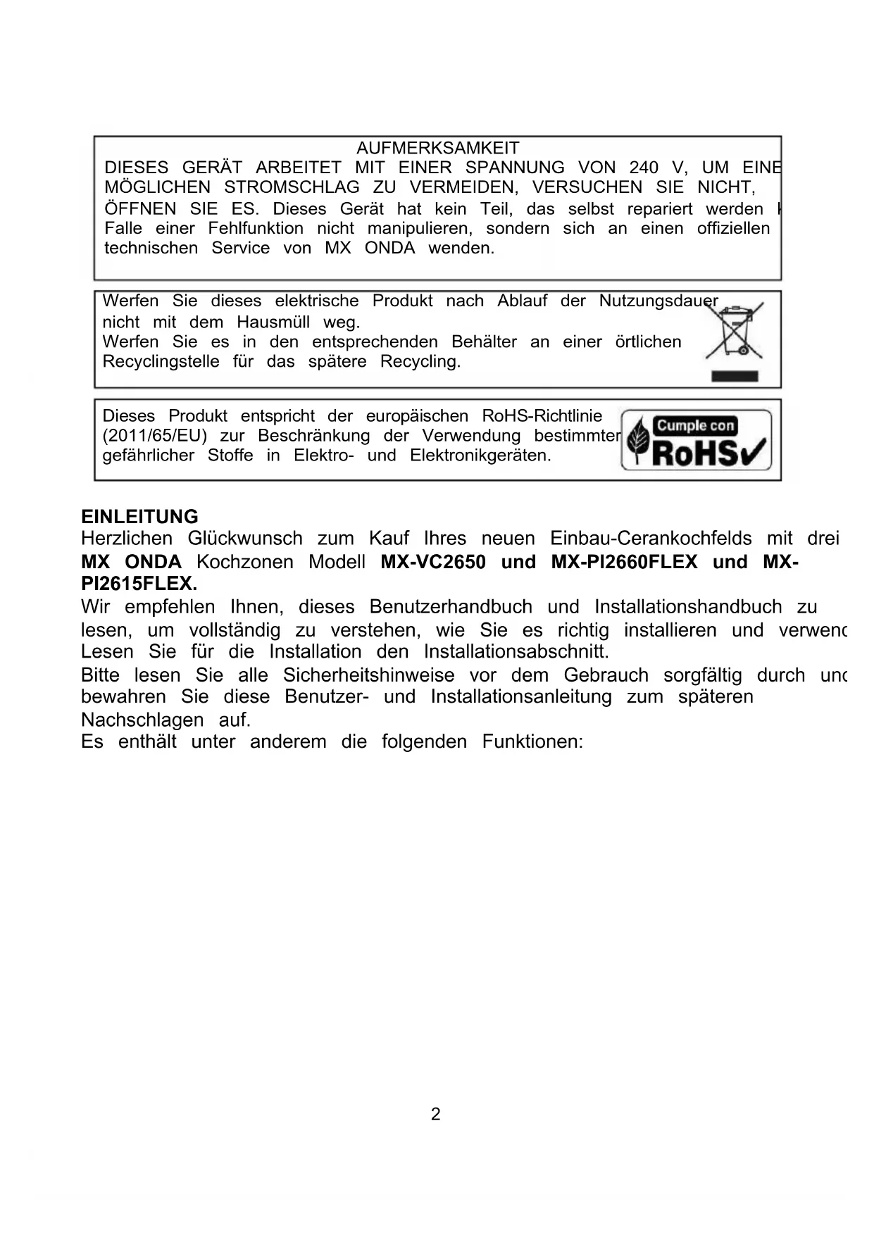 MODELL: MX-VC2650 MX-PI2660FLEX MX-PI2615FLEX LESEN SIE DIESES HANDBUCH VOR DEM GEBRAUCH SORGFÄLTIG DURCH2 AUFMERKSAMKEIT DIESES GERÄT ARBEITET MIT EINER SPANNUNG VON 240 V, UM EINEN MÖGLICHEN STROMSCHLAG ZU VERMEIDEN, VERSUCHEN SIE NICHT, ÖFFNEN SIE ES. Dieses Gerät hat kein Teil, das selbst repariert werden kann. Im Falle einer Fehlfunktion nicht manipulieren, sondern sich an einen offiziellen technischen Service von MX ONDA wenden. Werfen Sie dieses elektrische Produkt nach Ablauf der Nutzungsdauer nicht mit dem Hausmüll weg. Werfen Sie es in den entsprechenden Behälter an einer örtlichen Recyclingstelle für das spätere Recycling. Dieses Produkt entspricht der europäischen RoHS-Richtlinie (2011/65/EU) zur Beschränkung der Verwendung bestimmter gefährlicher Stoffe in Elektro- und Elektronikgeräten. EINLEITUNG Herzlichen Glückwunsch zum Kauf Ihres neuen Einbau-Cerankochfelds mit drei MX ONDA Kochzonen Modell MX-VC2650 und MX-PI2660FLEX und MX- PI2615FLEX. Wir empfehlen Ihnen, dieses Benutzerhandbuch und Installationshandbuch zu lesen, um vollständig zu verstehen, wie Sie es richtig installieren und verwenden. Lesen Sie für die Installation den Installationsabschnitt. Bitte lesen Sie alle Sicherheitshinweise vor dem Gebrauch sorgfältig durch und bewahren Sie diese Benutzer- und Installationsanleitung zum späteren Nachschlagen auf. Es enthält unter anderem die folgenden Funktionen:3 MX-VC2650
